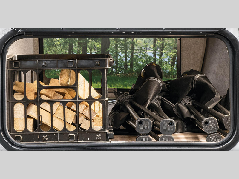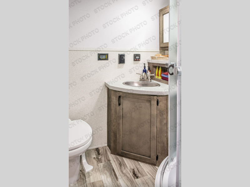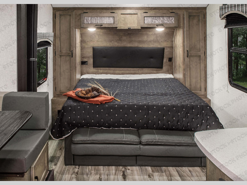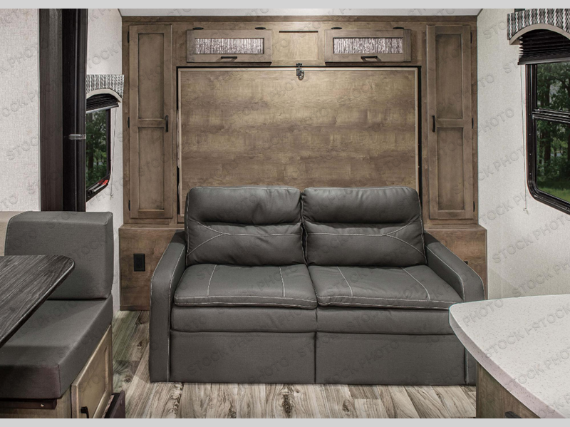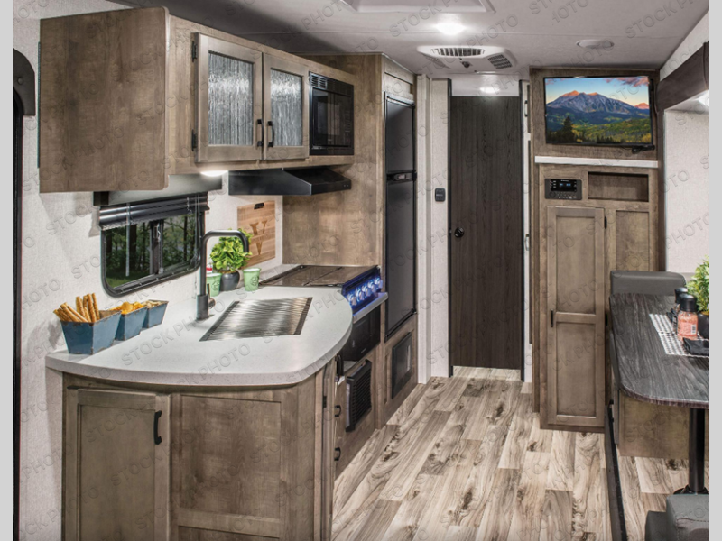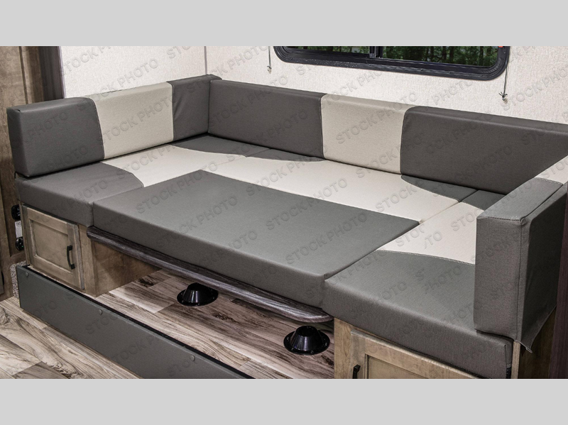 Head to your favorite spot in the woods with this travel trailer! There is a front 60" x 75" queen bed with a privacy curtain to draw at night or you can switch it out for an optional Murphy bed with sofa. Keep your perishables fresh with the 7 cu. ft. refrigerator, prepare your best meals with the three burner cooktop, and enjoy them at the 88" x 47" U-shaped dinette slide which can also transform into an extra sleeping space for a guest or two to tag along. Next to the pantry is an entertainment center and the rear corner bathroom with a glass 34" radius shower to freshen up in each morning. Store all of your outdoor gear either inside the exterior pass-through storage area or in the garage storage system!