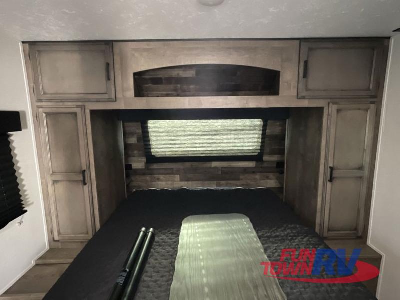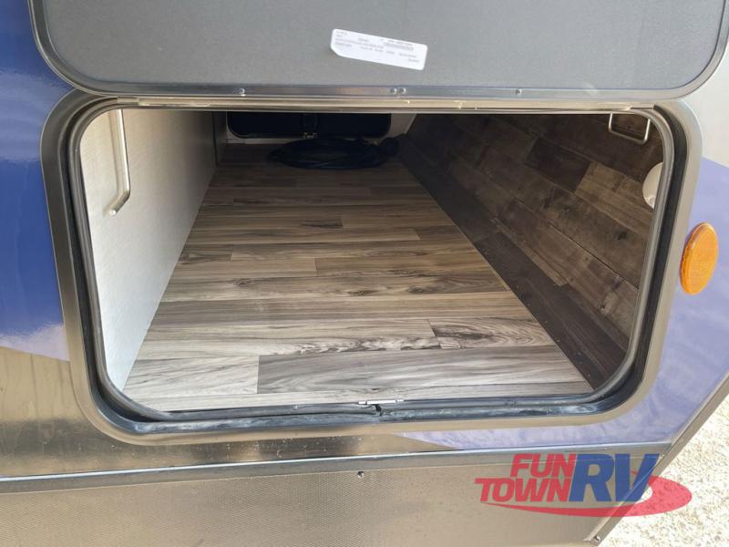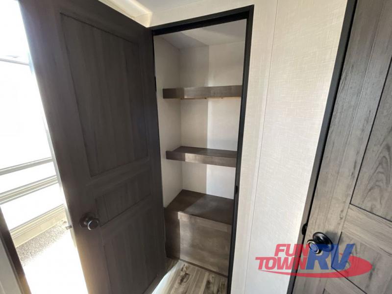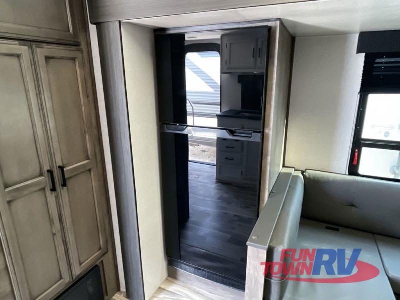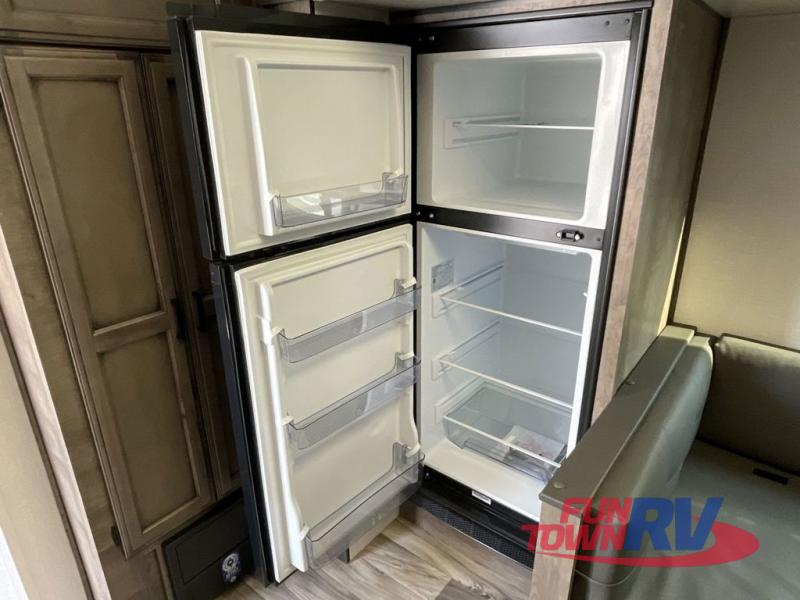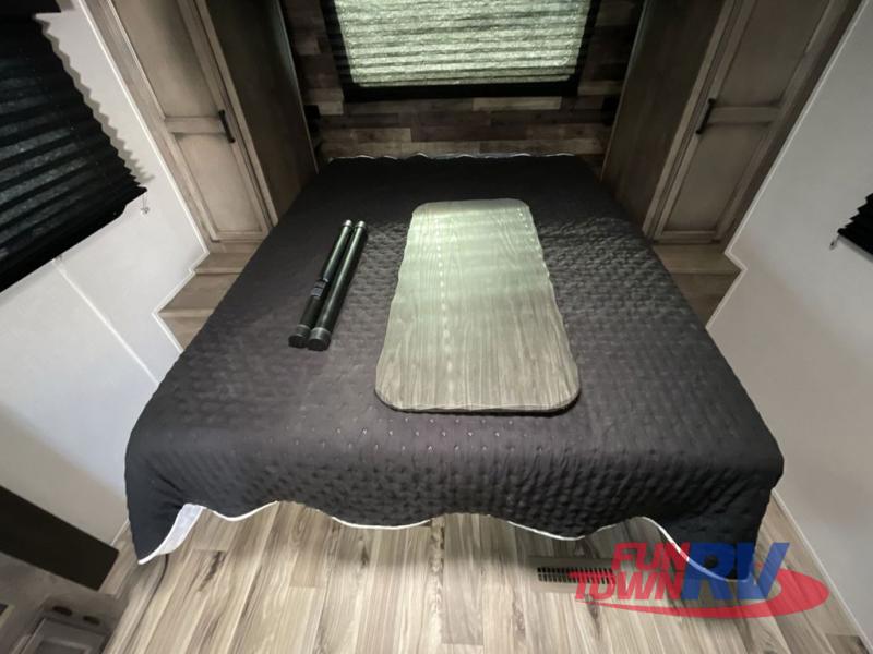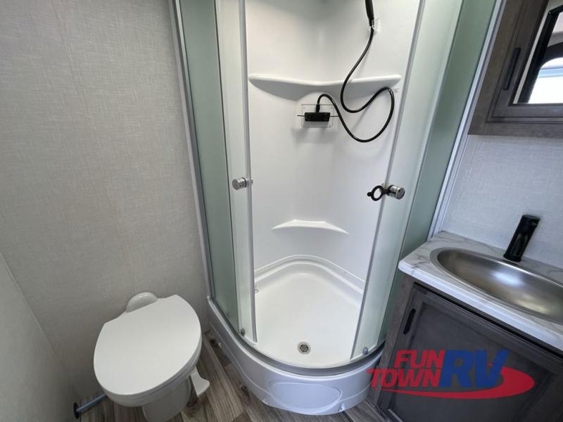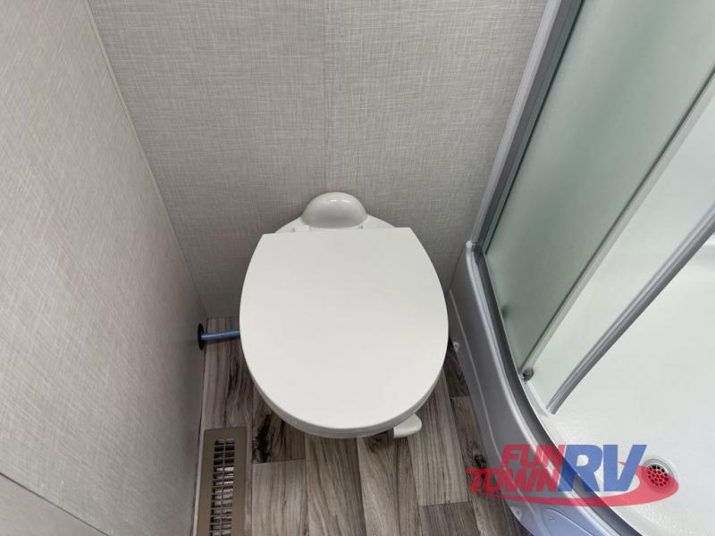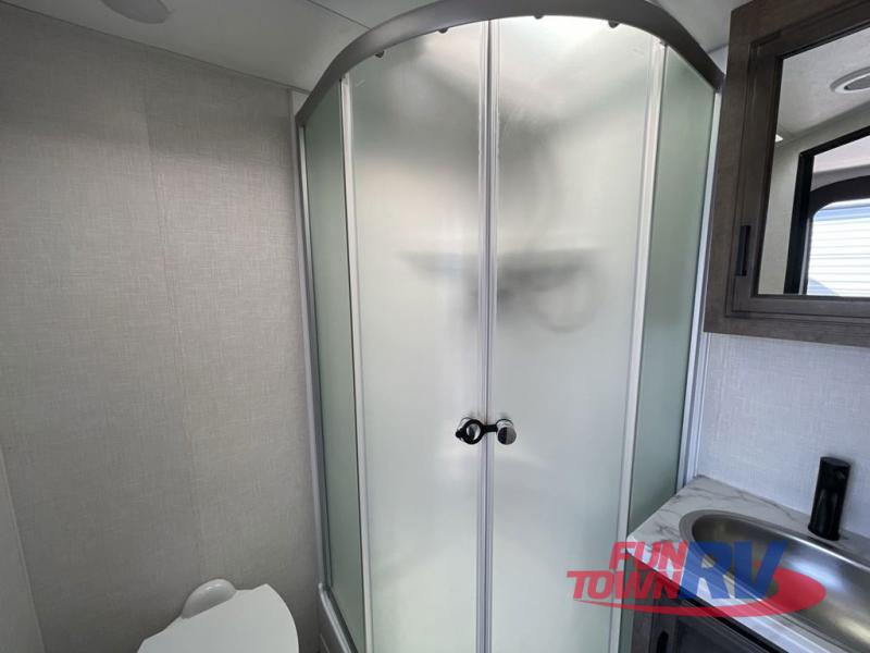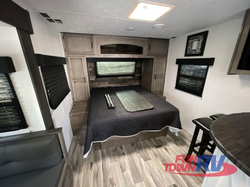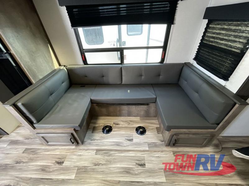 This travel trailer is perfect for two people who wish to escape the hustle and bustle of everyday life! You will enjoy a good night's rest on the sleep tight queen bed with shelves and wardrobes on either side to hang your clothes, and if you want an extra guest or two to tag along then you can transform the 88" x 42" U-shaped dinette into an extra sleeping space. Everyone will stay clean with a rear corner bathroom that has a 34" radius shower. Grab your dry goods from the walk-in pantry, your perishables from the 10 cu. ft. refrigerator, and cook them all on the three burner cooktop with Furrion oven. The bar top with two bar stools is the perfect place to enjoy your morning coffee and eggs!