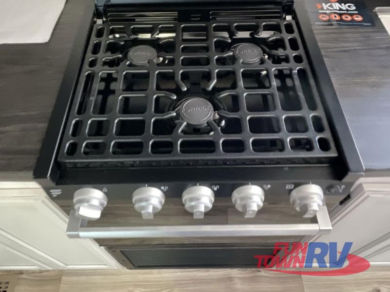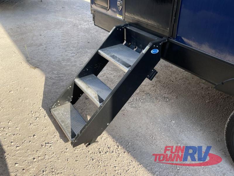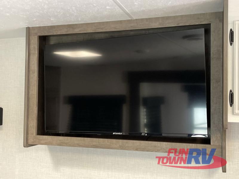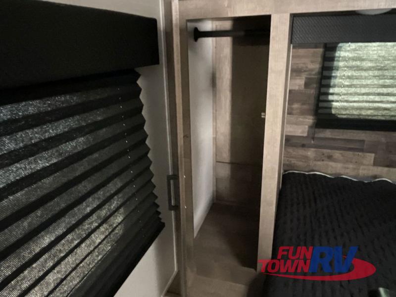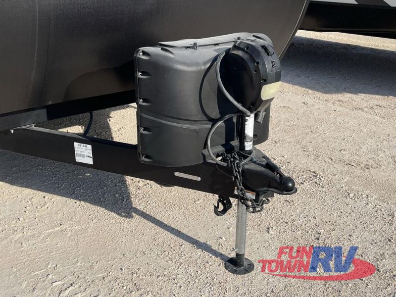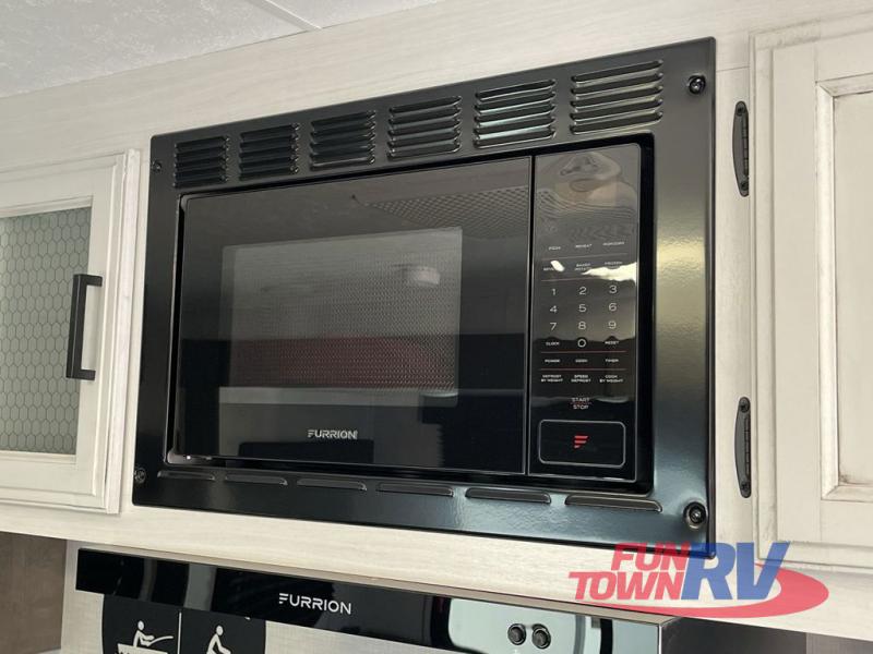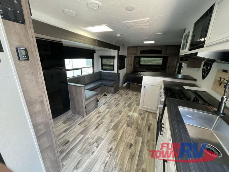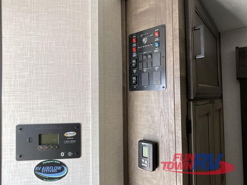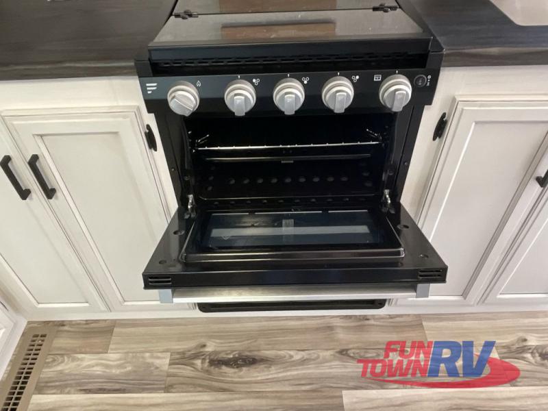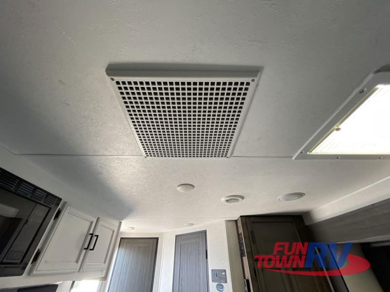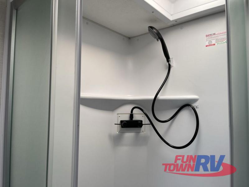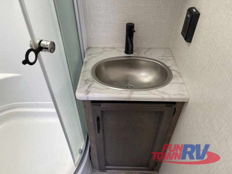 This travel trailer is perfect for two people who wish to escape the hustle and bustle of everyday life! You will enjoy a good night's rest on the sleep tight queen bed with shelves and wardrobes on either side to hang your clothes, and if you want an extra guest or two to tag along then you can transform the 88" x 42" U-shaped dinette into an extra sleeping space. Everyone will stay clean with a rear corner bathroom that has a 34" radius shower. Grab your dry goods from the walk-in pantry, your perishables from the 10 cu. ft. refrigerator, and cook them all on the three burner cooktop with Furrion oven. The bar top with two bar stools is the perfect place to enjoy your morning coffee and eggs!