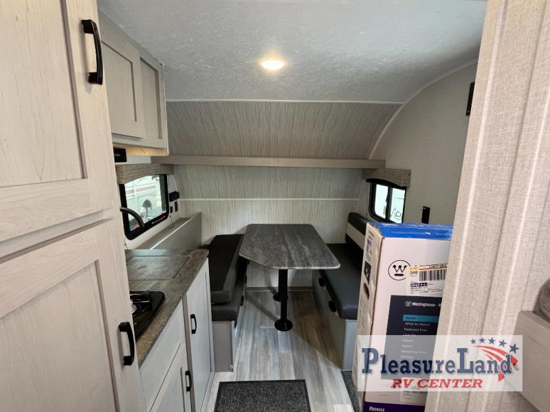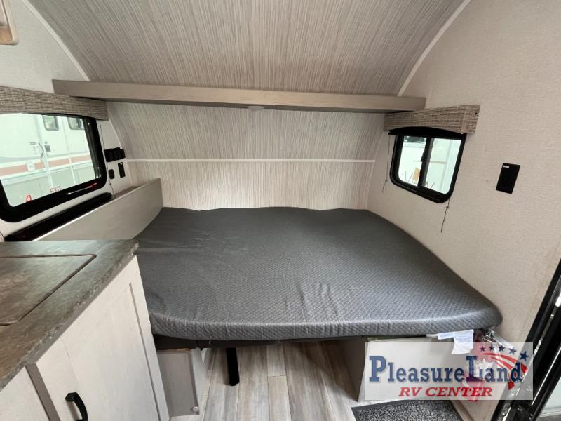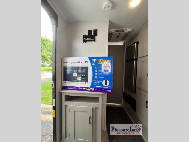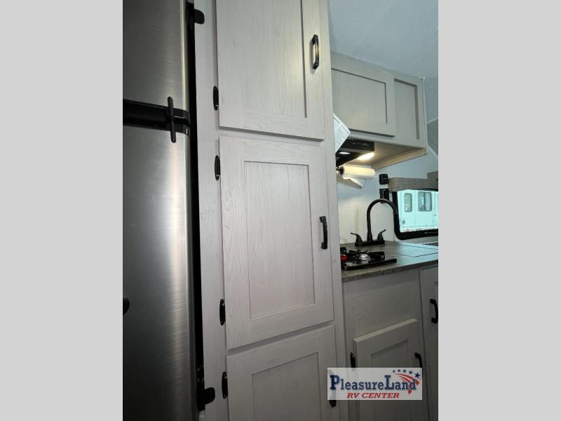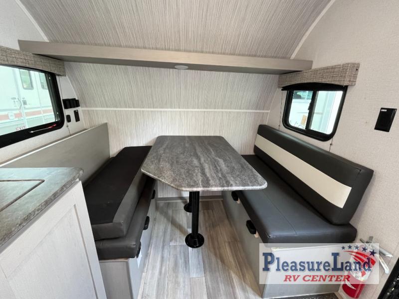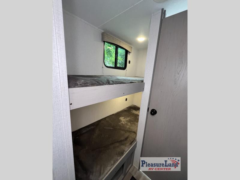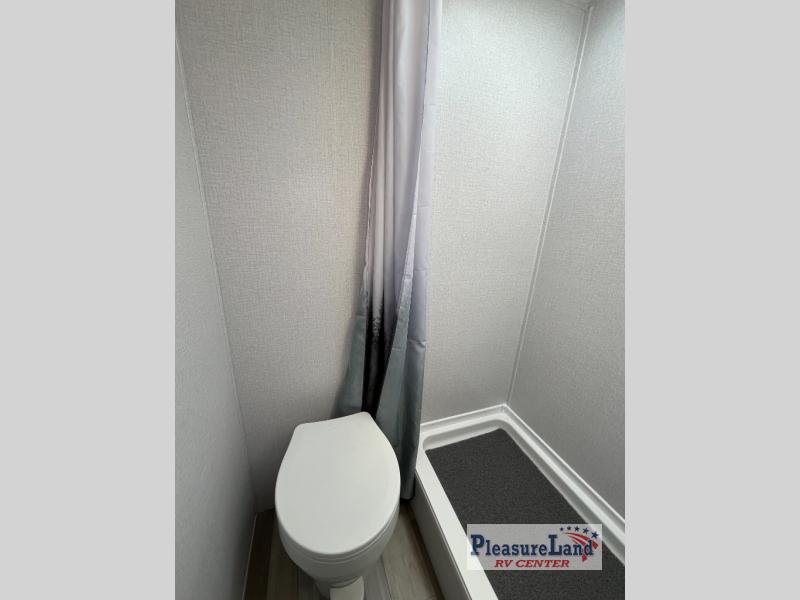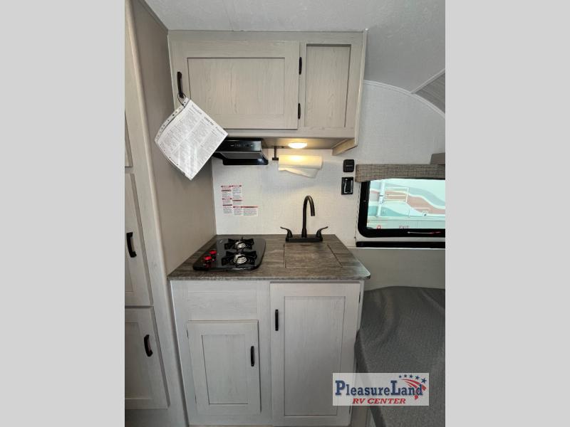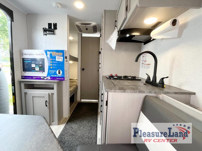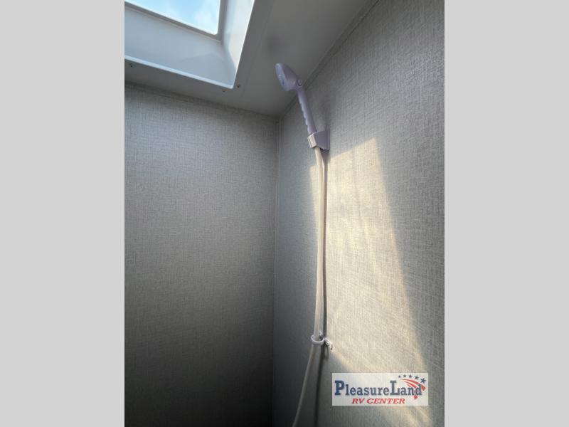 The perfect bunk model for your family or group of four. Twin bunks in the rear corner provide sleeping for the kids, and two can sleep on the front both dinette once converted at night. There is a two burner cooktop and single sink for inside meals, with plenty of storage cabinets both above the kitchen area and along the roadside wall. This is where you will also find a refrigerator for your perishables. The rear corner bath includes a private shower and toilet. You will love the skylight over the shower to provide more headroom and natural lighting inside. There is also an entertainment center just inside the entry/exit door with TV prep area above.