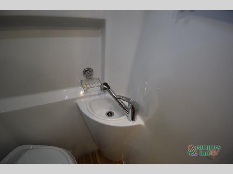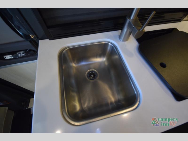 Prepare your meals wherever adventure takes you using the two-burner gas cooktop with an integrated cover, convection microwave, and the 3.2 cu. ft. 12V refrigerator/freezer. A slide-out pantry keeps your dry goods organized, and the stainless steel sink makes cleanup easy.