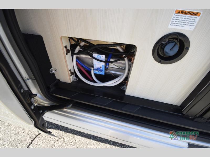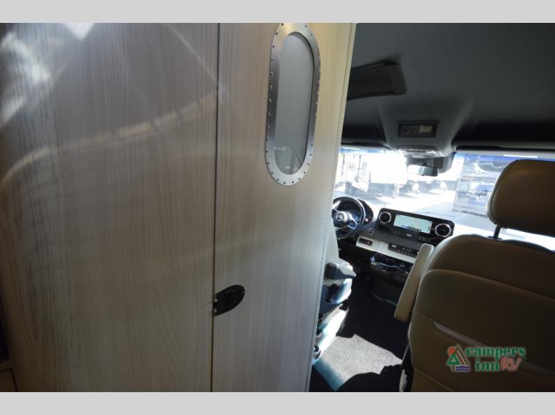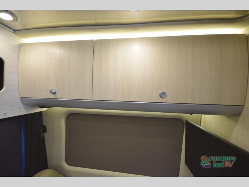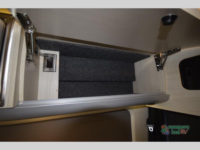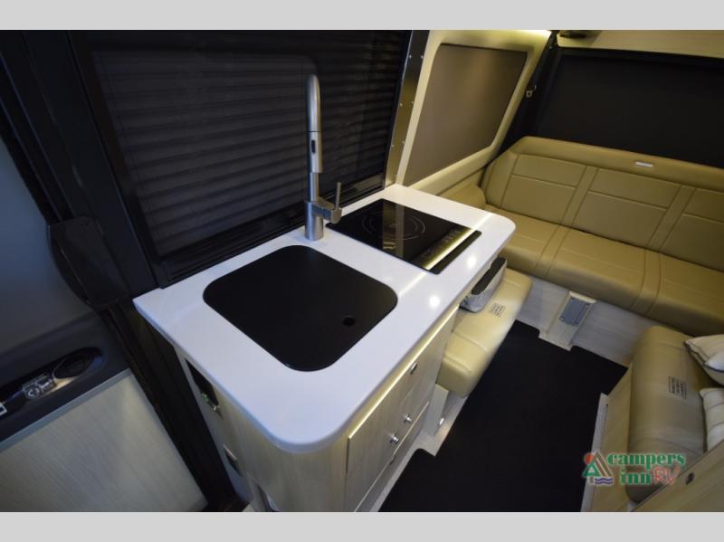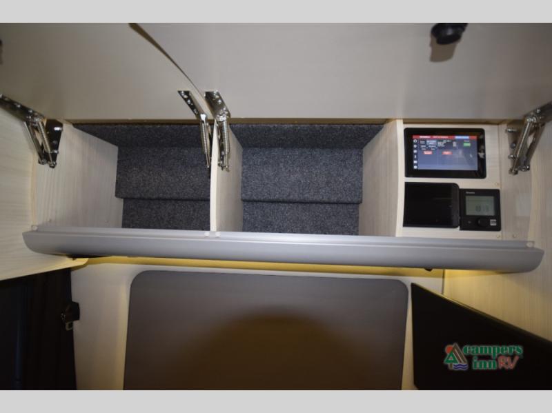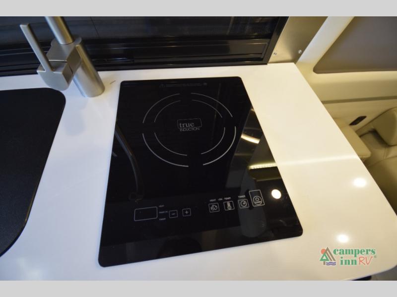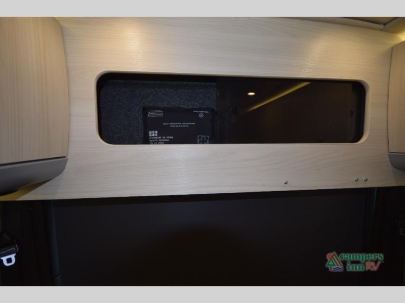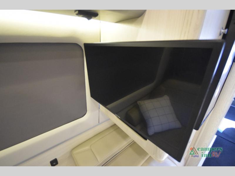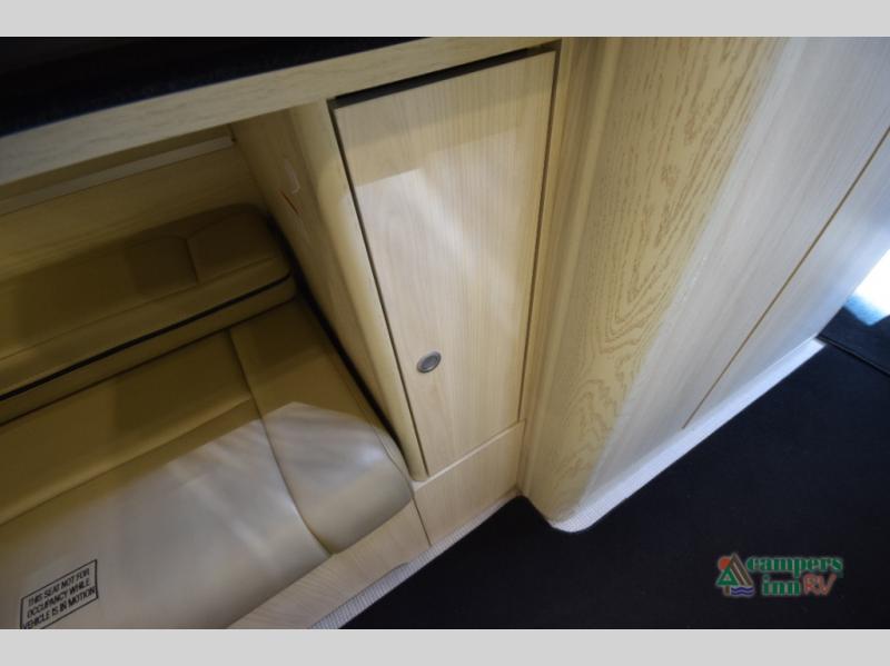 Inside, you’ll find a surprisingly spacious layout with smart storage throughout, a sleek galley kitchen, and a full wet bath—all thoughtfully designed to make life on the road easy and enjoyable. The rear power sofa and side seats convert into a spacious lay-flat bed, giving you the largest bed in its class, perfect for two travelers to stretch out and recharge.
