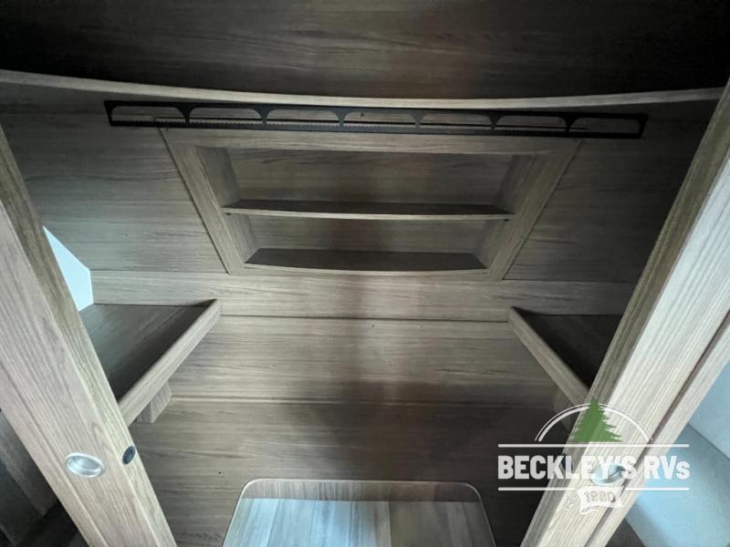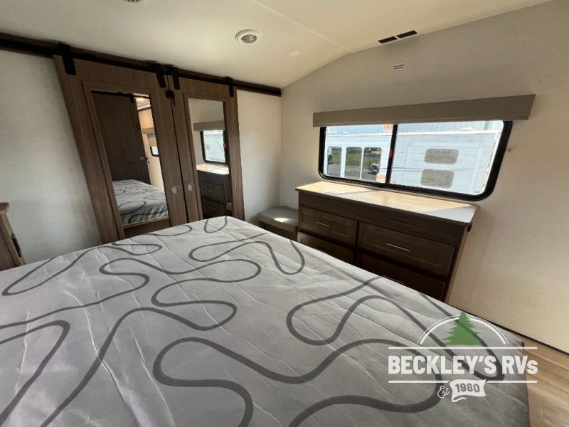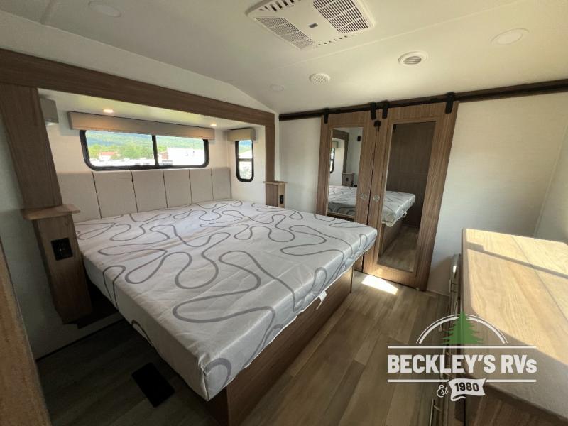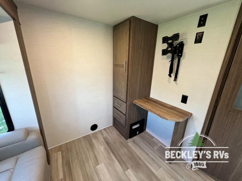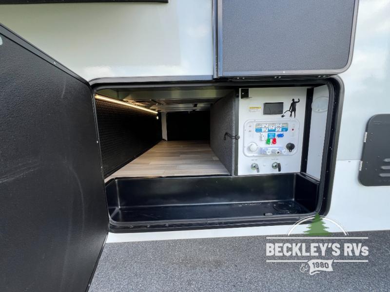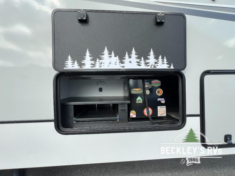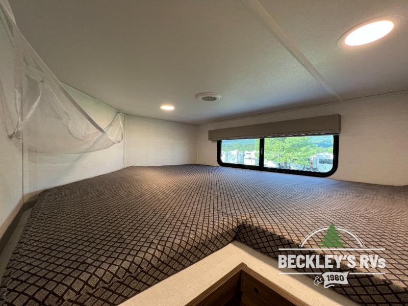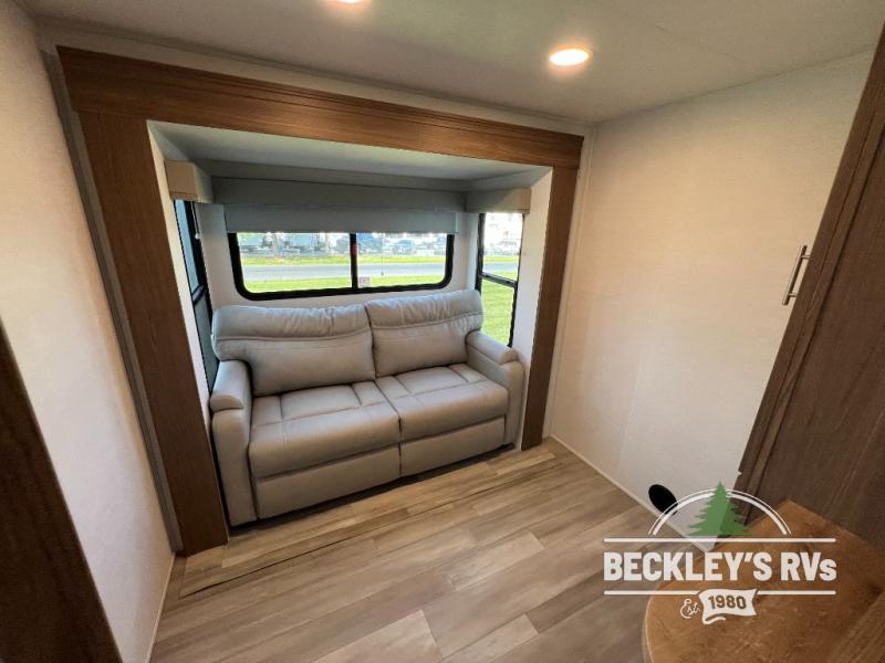 This fifth wheel is packed full with comfortable features! The front private bedroom has a queen bed slide that can be switched out for an optional king bed, a dresser, and a front wardrobe that is prepped to add an optional washer and dryer. Freshen up each morning in the full bathroom with a 30" x 50" shower then head to the full kitchen to prepare breakfast using the kitchen island and three burner cooktop. The second bedroom has a sofa slide with a loft above it all accessible from a staircase at the top of the steps up to the front master bedroom and bath, right before the bathroom door on your left. Relax each night on the dual recliner theater seating across from the swing mount 50" HDTV with hidden storage behind it, or play a few games at the U-shaped dinette. This model also has the option to switch out the U-shaped dinette for an optional floating dinette table beside the theater seat. You also have an outside refrigerator and outside griddle by a flip-up baggage door for storage!