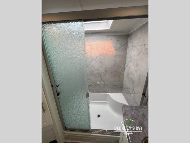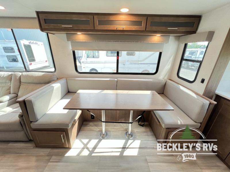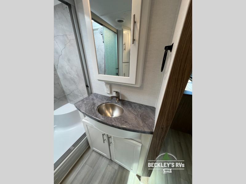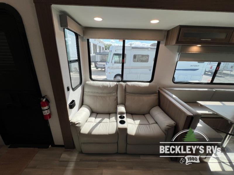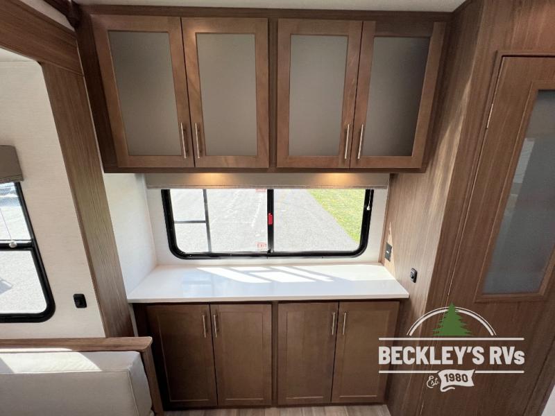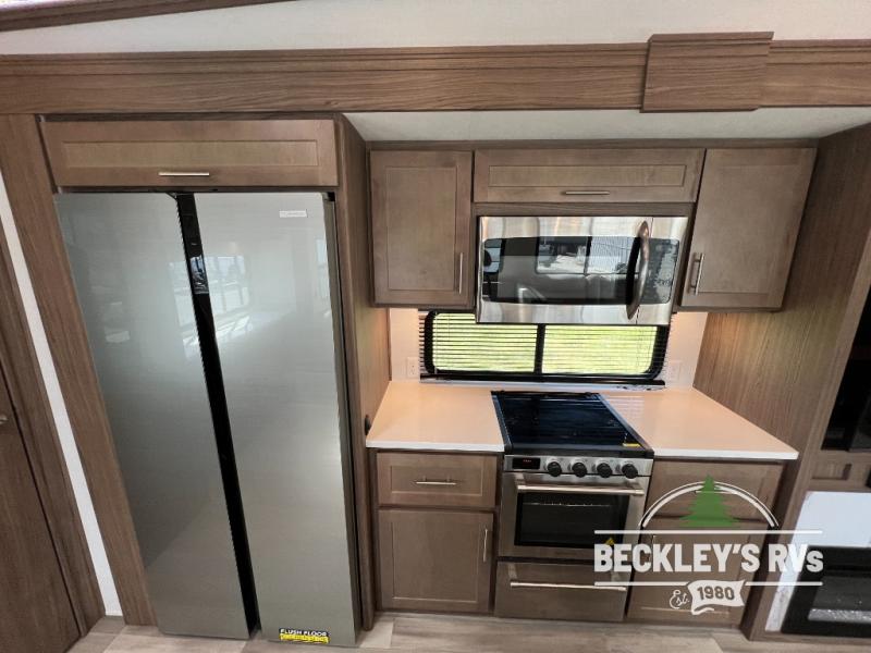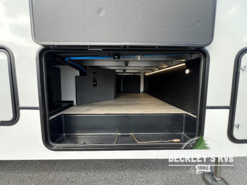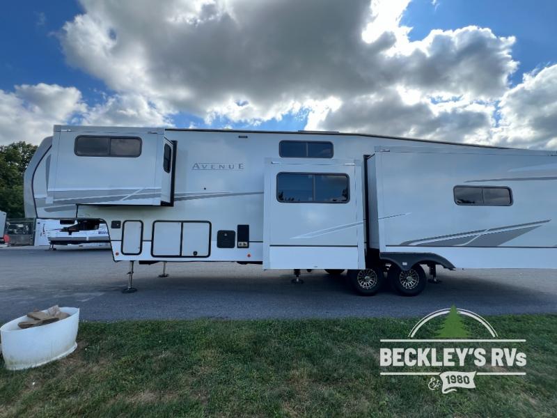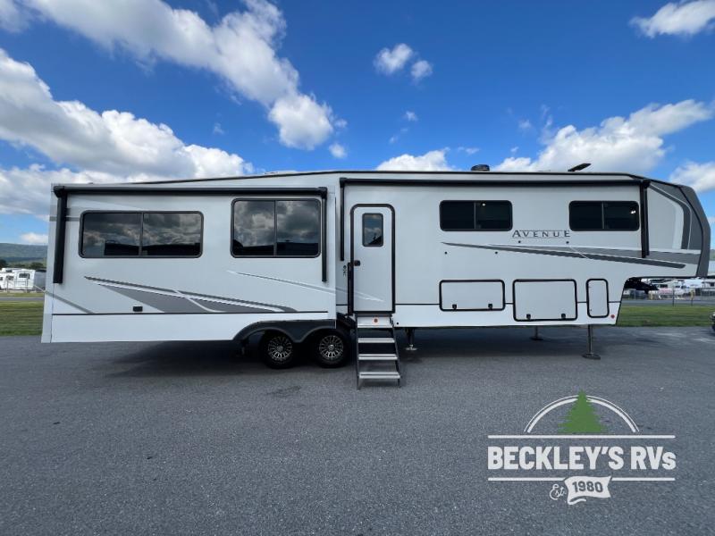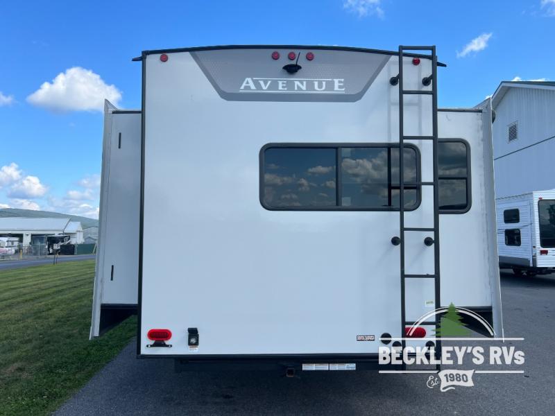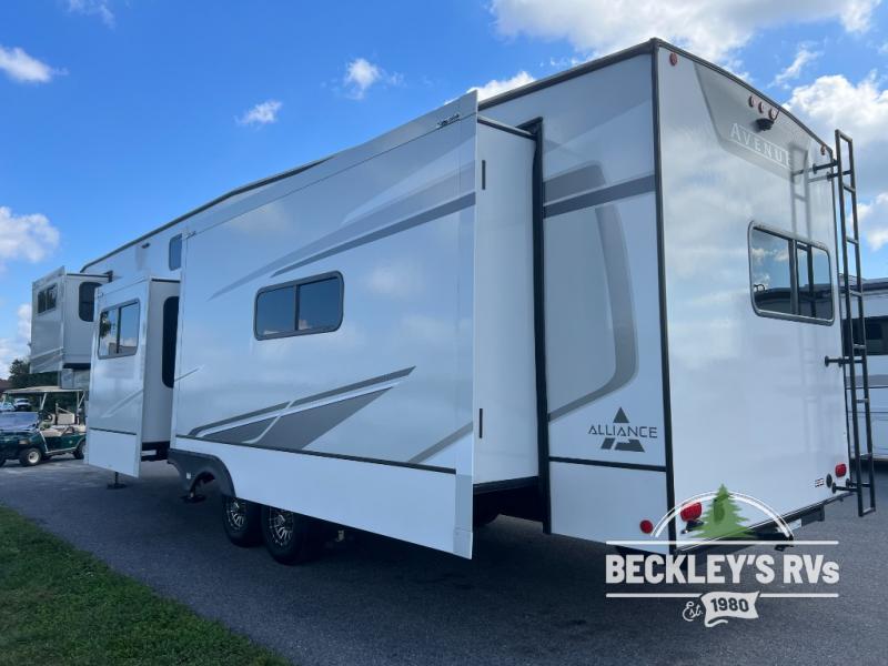 A benchmark chassis creates a space saver upper deck with each one of these Avenue fifth wheels by Alliance RV! The 101 in. wide-body construction gives you more room to walk around and the flush slide out floors throughout prevent any tripping. There are Azdel composite sidewalls inside and out, and a seamless fully walkable PVC roof for extreme durability, zero maintenance, and it is more solar reflective because of the bright white color. Twin 13,500 BTU A/C units provide 27,000 BTUs of cooling power which are ultra quiet and independently controlled keeping you comfortable during your entire trip. And, the fully enclosed and heated underbelly means that you can extend your camping season into the colder months if you like. You are sure to love the "no carpet zone" making each Avenue easy to clean and allergen free, not to mention pet friendly with vinyl flooring throughout. And, strategically placed Atrium windows in the bedroom and living area will not only provide more light, cross ventilation and fresh air, but bring a spectacular view of your surroundings right inside. You can maximize your space throughout with innovative storage solutions like the hidden storage behind the TV, inside the end tables, ottoman, and dinette chairs. Come choose your favorite model today!