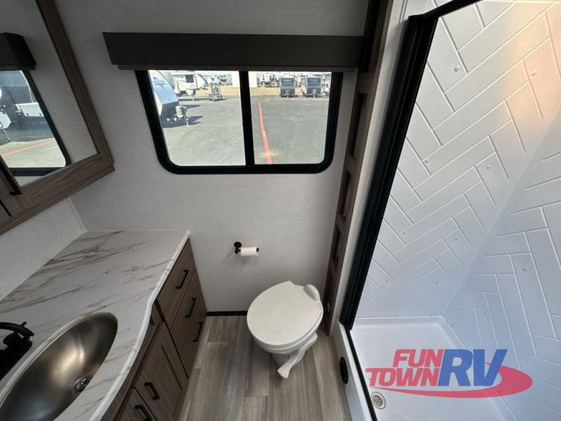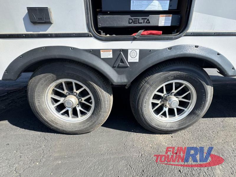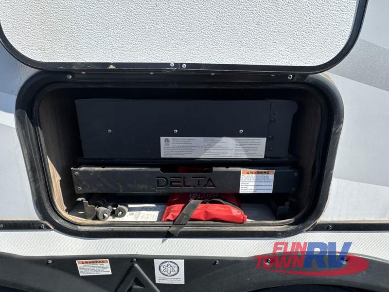 You will love all of your adventures with this Delta travel trailer in tow! This unit is perfect for a couple or even a family of four or six with a queen bed in the front private bedroom, and also using the sofa and U-shaped dinette once converted for more sleeping space. The U-shaped dinette is great for gathering for meals, a board game or game of cards, and the sofa is directly opposite a 40" HDTV which makes viewing enjoyable. You can easily prepare all of your favorite meals and snacks with the kitchen amenities provided inside. A three burner range allows you to easily cook indoors, or you can cook outside using the outdoor griddle/grill if you like. There is a 10 cu. ft. 12V  refrigerator to keep all of your perishables and drinks nice and cold, plus a large sink for dishes and cleaning up, and a convenient pull-out trash can and flip-up counter extension as well. You will also appreciate the full rear bath featuring a 30" x 36" shower, toilet, vanity with sink, and linen cabinet for your towels and toiletries.
