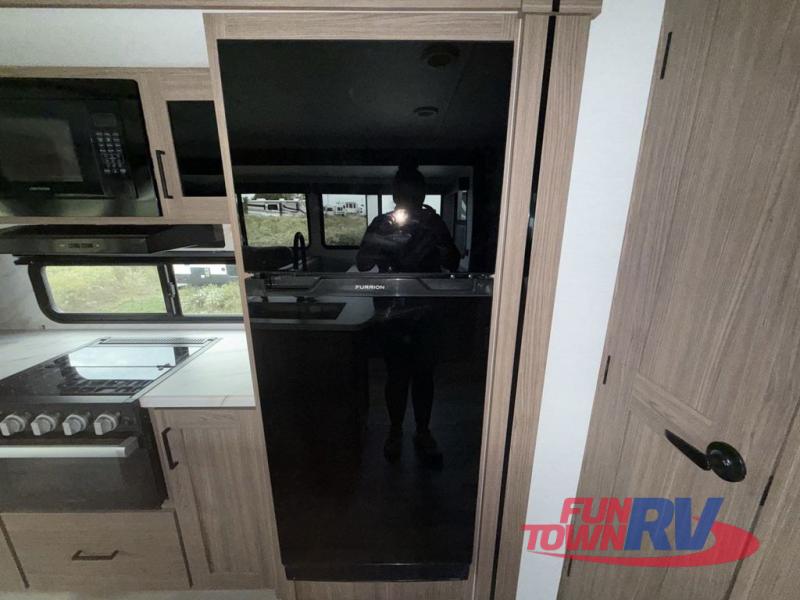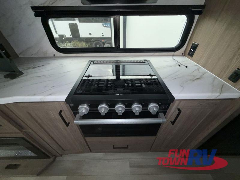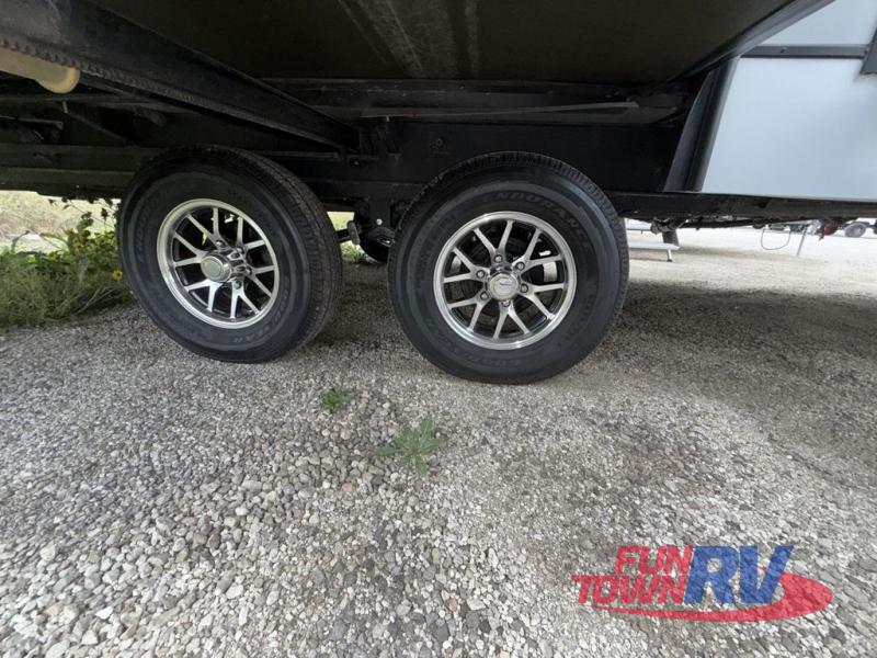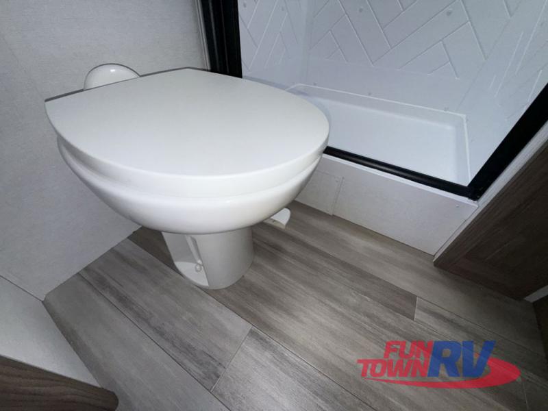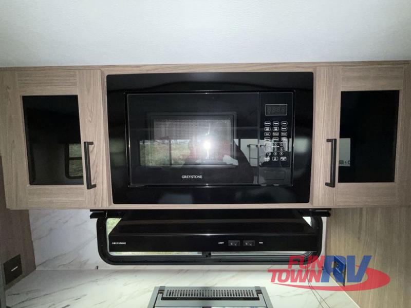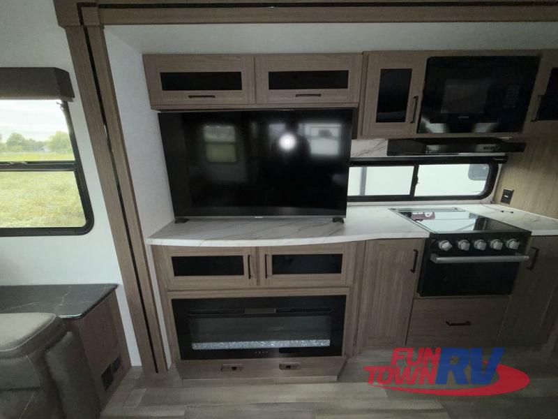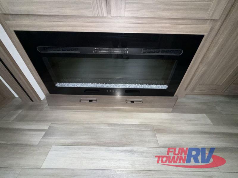 You will feel right at home camping in this travel trailer! The rear living area has a rear sofa and a set of theater seating conveniently across from the entertainment center with a 50" class HDTV above a pull-out fireplace storage for a cozy evening indoors. Prepare your best home cooked meals with the three burner cooktop, kitchen island which even has a tip-out trash can, and 10 cu. ft. 12V refrigerator. Enjoy your meals at the free standing dinette then either freshen up in the full bathroom with the 30" x 36" shower or head outside to relax under one of the two awnings. The front private bedroom has a queen bed for you to lay your head on at night and has wardrobe nightstands for your items!