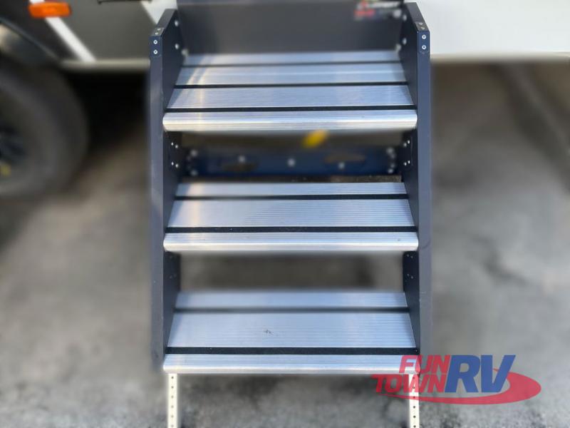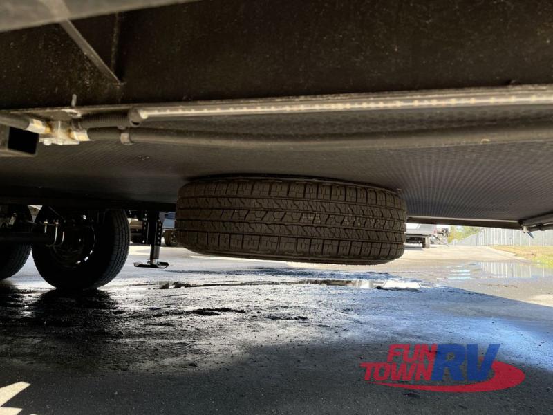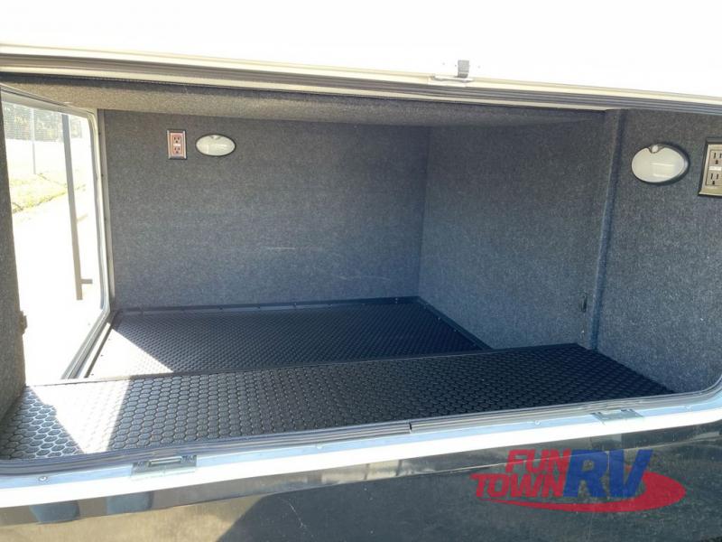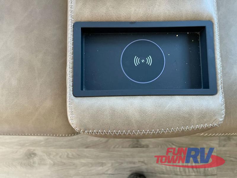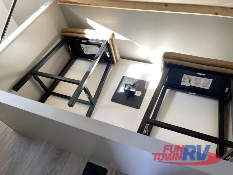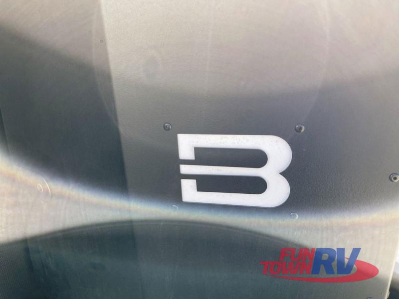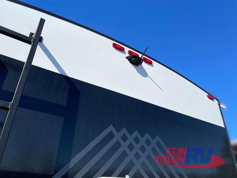 Camping with family or friends just got easier in this spacious travel trailer. There is a rear private bunkhouse with double-size bunks and storage space for your guests' things. You will appreciate your own space in the front private bedroom that includes a queen bed and built-in bedside storage with outlets and USB ports. And the full bath includes a 30" x 42" one-piece fiberglass shower so everyone can stay clean throughout your trip. The combined kitchen and living area will be a favorite place to visit together since there is theater seating with two recliners and a removable table, a TV with swivel, plus a fireplace! You will also enjoy the kitchen island with bar stools, along with additional kitchen counter space, a pantry with adjustable shelves, and a spacious 16 cu. ft. refrigerator that can still open when the slide out is in. Head outside to find drop-frame pass-thru storage and rear storage, two patio awnings, LED chassis lighting, quad step entry, and more!