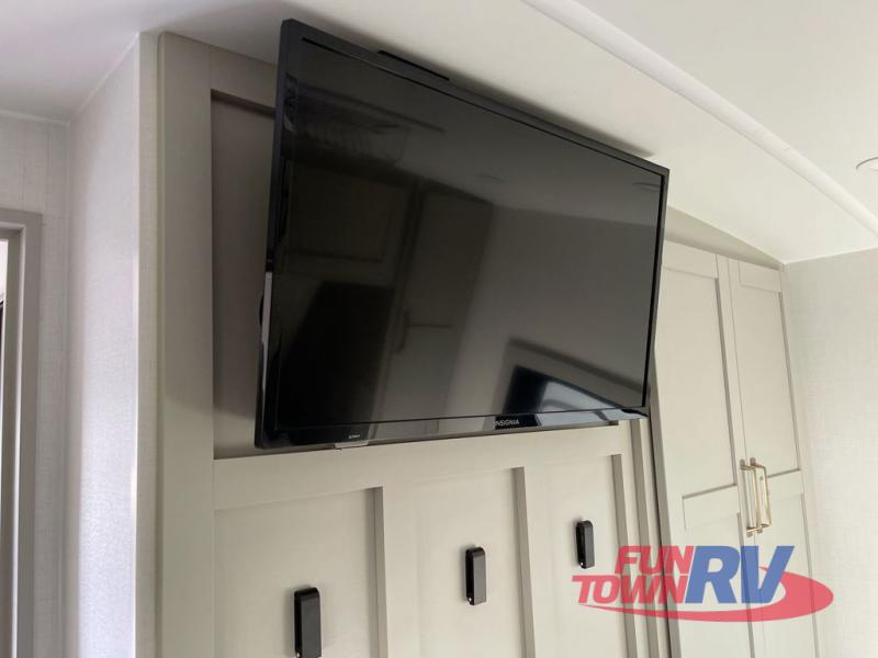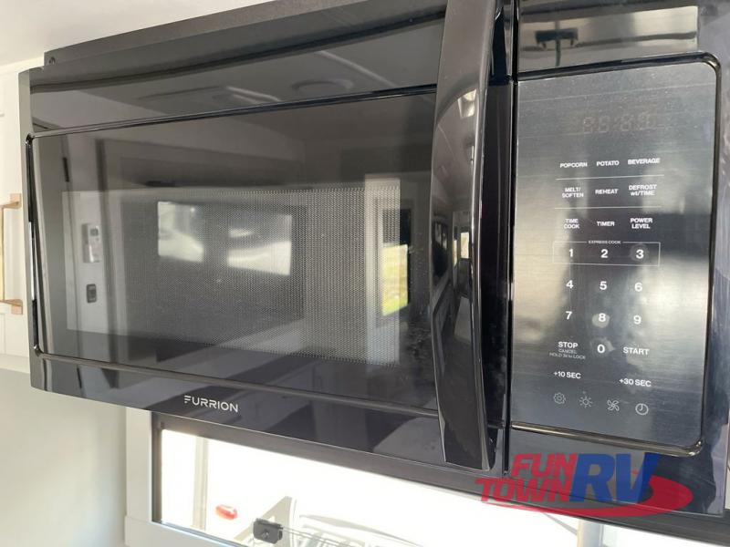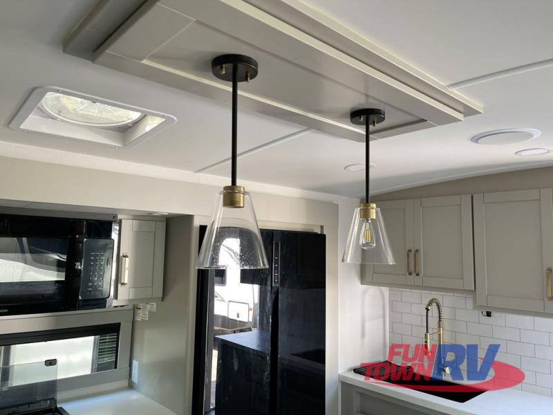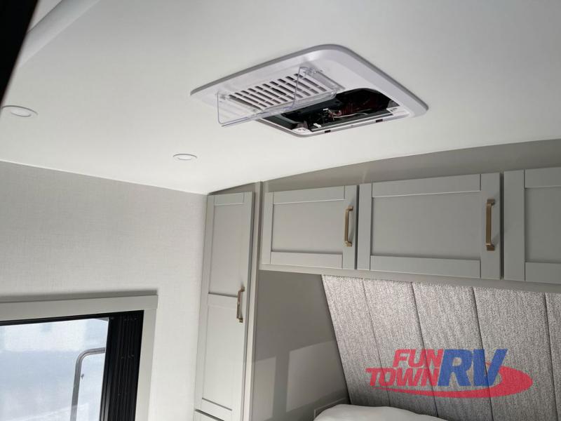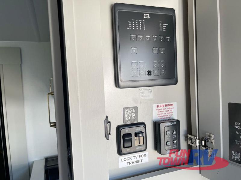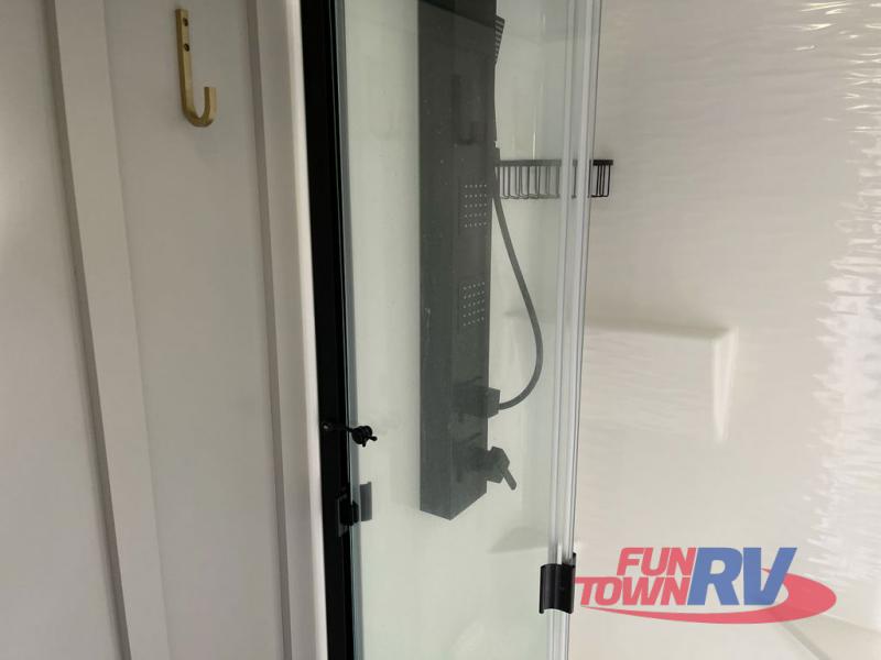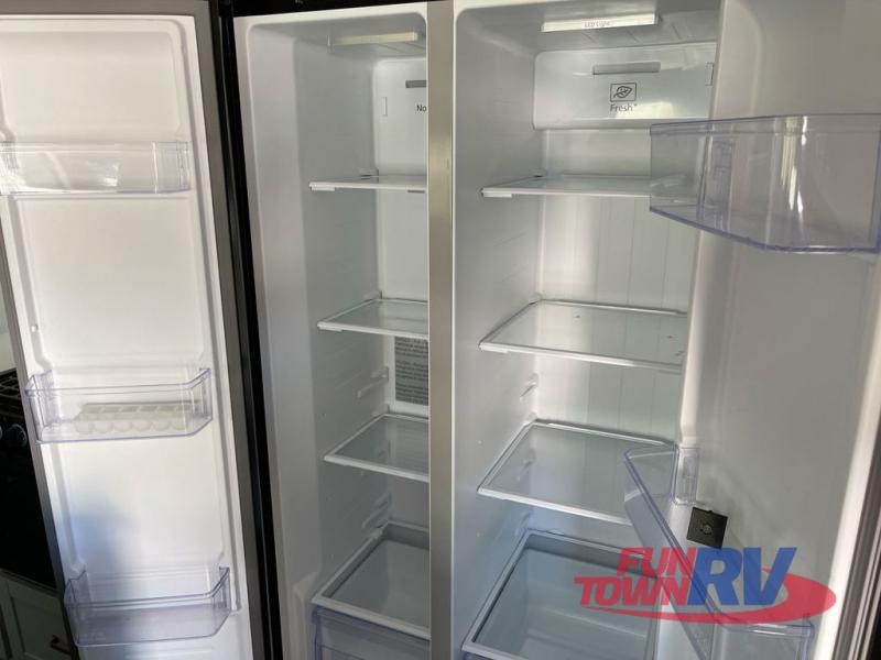 Camping with family or friends just got easier in this spacious travel trailer. There is a rear private bunkhouse with double-size bunks and storage space for your guests' things. You will appreciate your own space in the front private bedroom that includes a queen bed and built-in bedside storage with outlets and USB ports. And the full bath includes a 30" x 42" one-piece fiberglass shower so everyone can stay clean throughout your trip. The combined kitchen and living area will be a favorite place to visit together since there is theater seating with two recliners and a removable table, a TV with swivel, plus a fireplace! You will also enjoy the kitchen island with bar stools, along with additional kitchen counter space, a pantry with adjustable shelves, and a spacious 16 cu. ft. refrigerator that can still open when the slide out is in. Head outside to find drop-frame pass-thru storage and rear storage, two patio awnings, LED chassis lighting, quad step entry, and more!