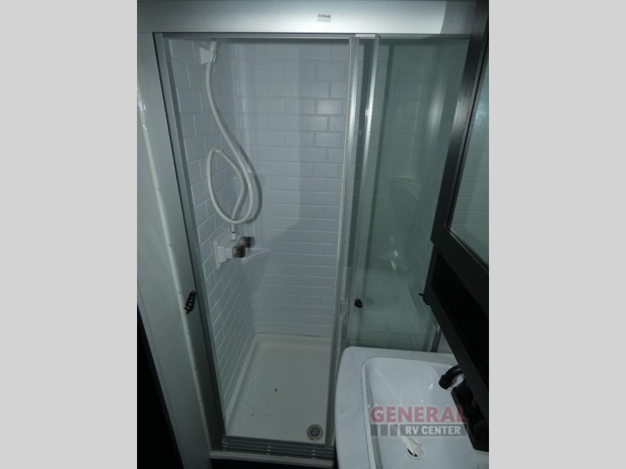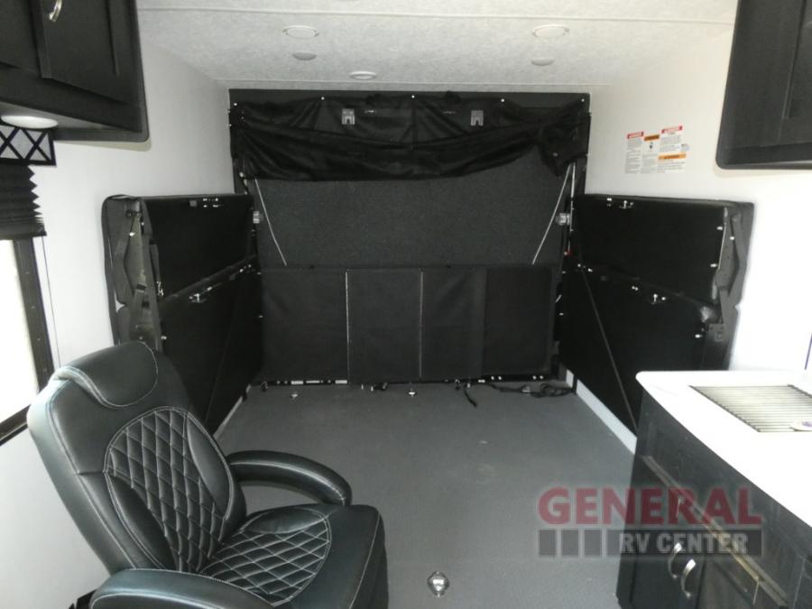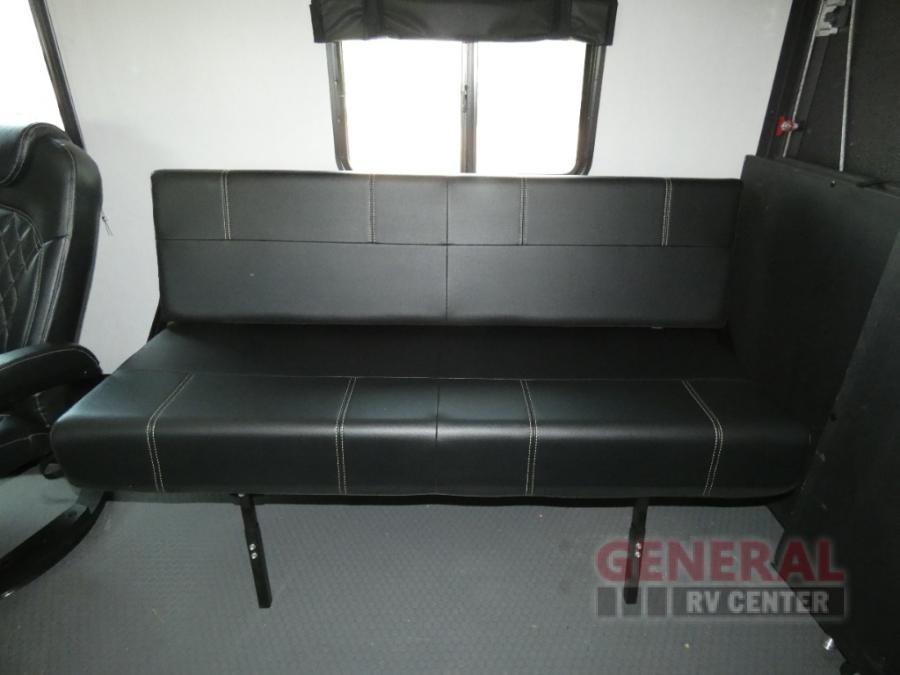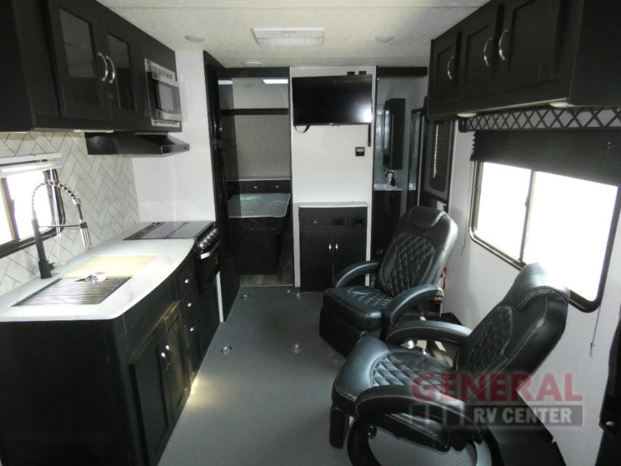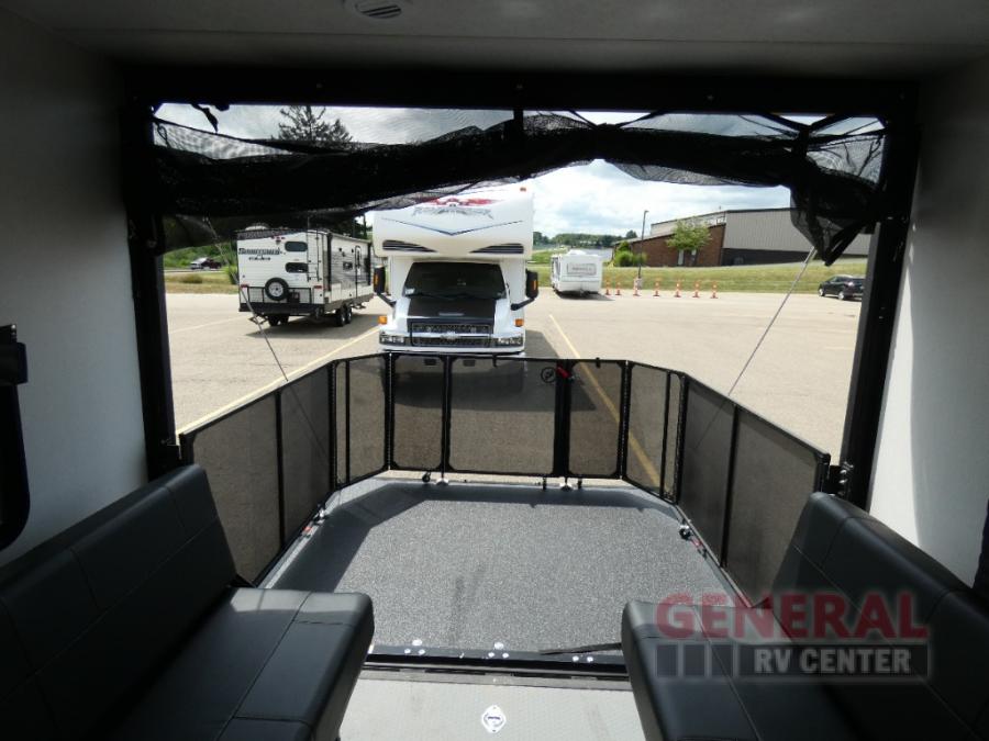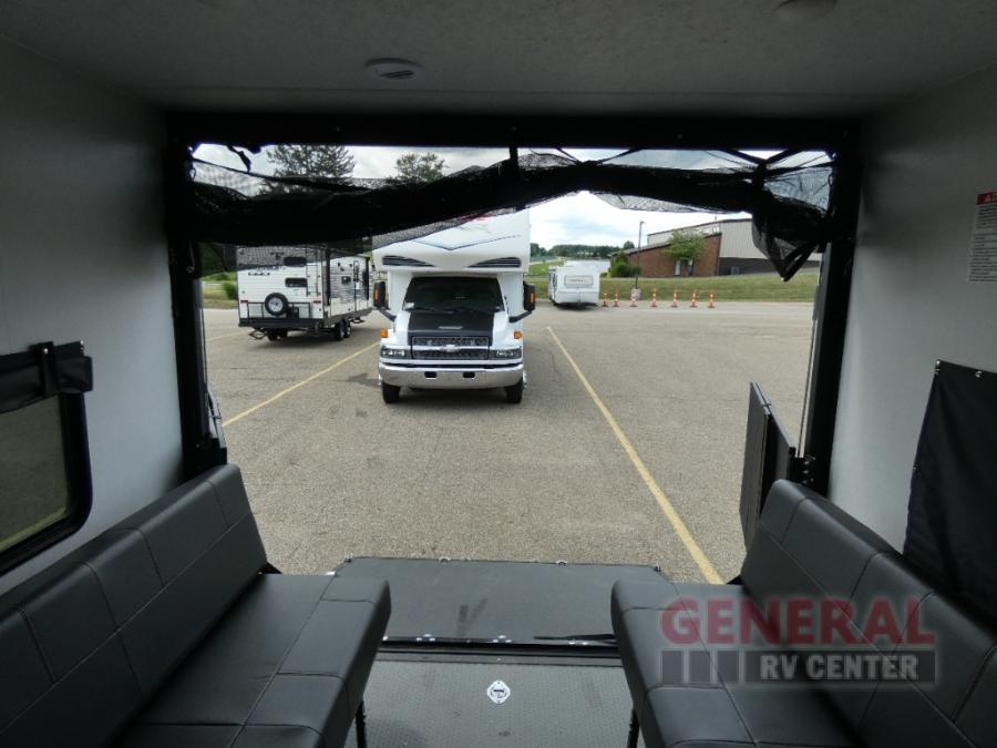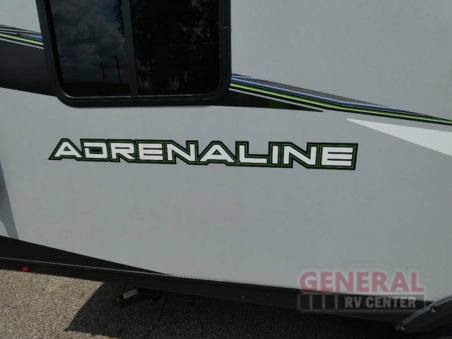 With any Adrenaline toy hauler travel trailer by Coachmen, the required Exterior Value package includes a one-piece Tufllex PVC roof membrane, a fiberglass front cap with rock guard to help against road debris, heavy duty Dexter axles with Nev-R-Adjust brakes and E-Z Lube, and aluminum wheels. Some exterior standards include a heated and enclosed underbelly, a patio ready ramp door with cables for an outdoor above ground space to enjoy, a power tongue jack for easy setup, and an outside spray port to clean off your toys. The interior standards include HD rubberized oil/gas/moisture resistant flooring in the garage area, shaker style cabinets and doors, a rear detachable screen, and USB charging ports in multiple locations for your electronics to mention a few.