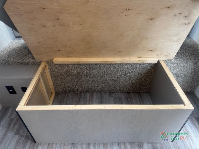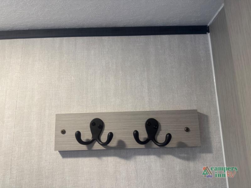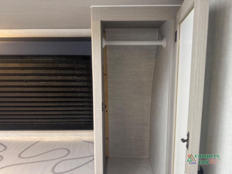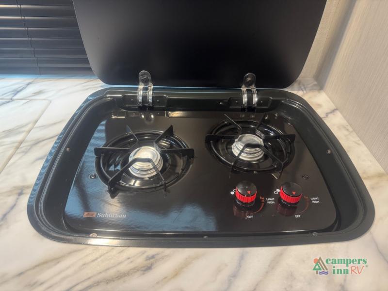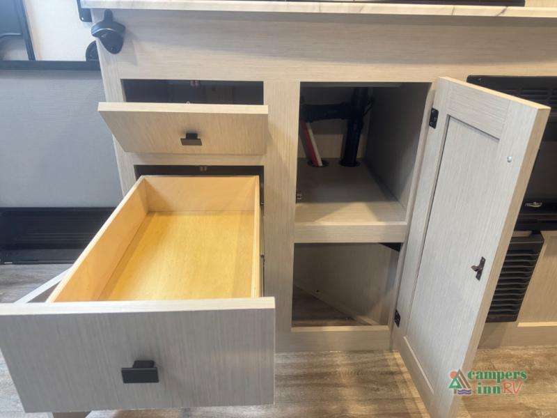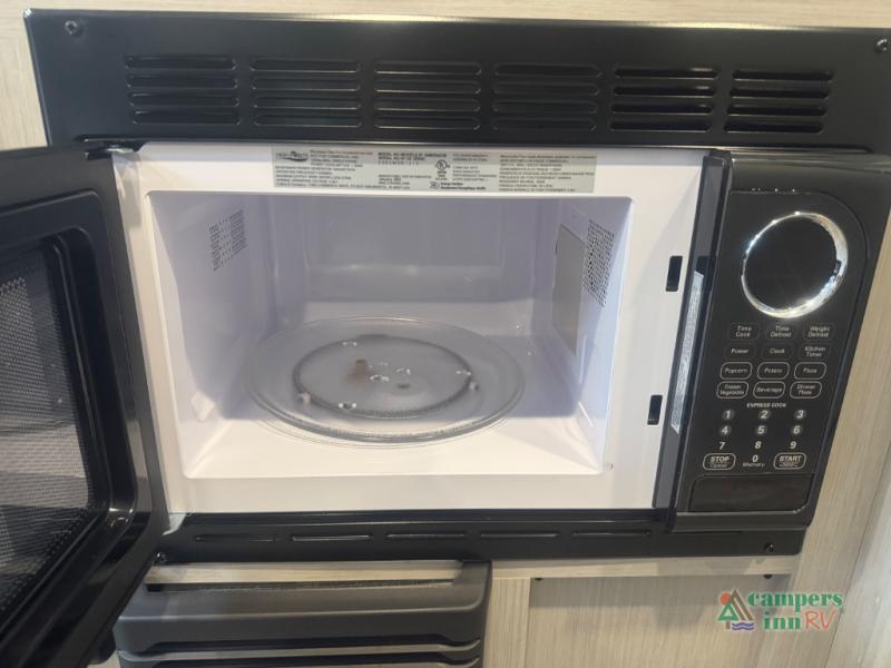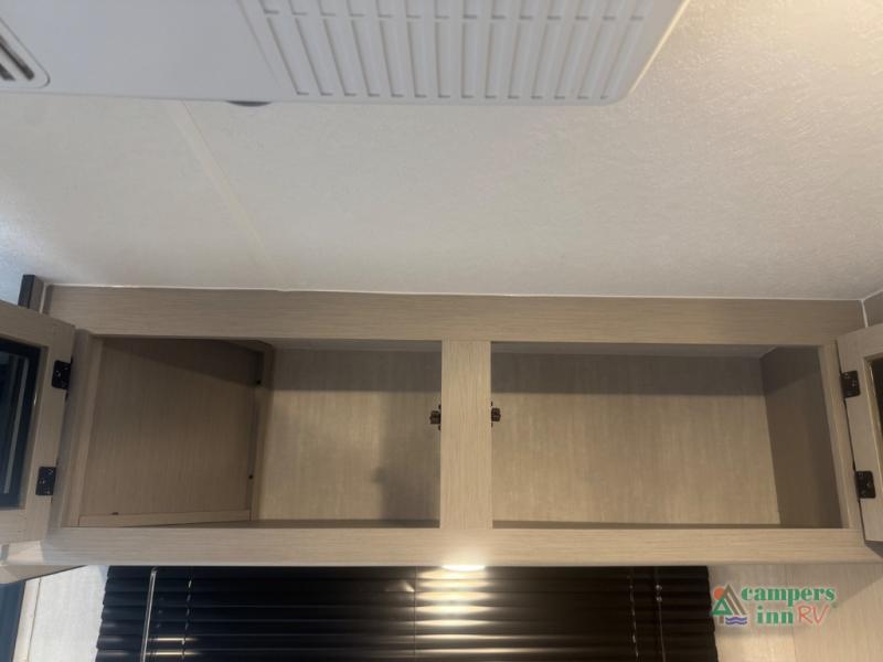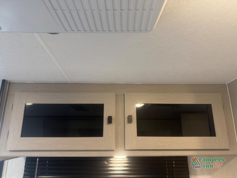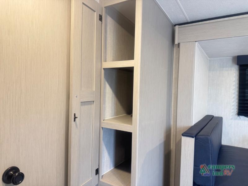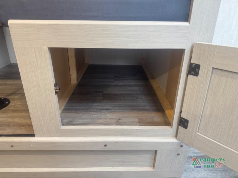 Whether you camp with friends, family or solo, this trailer gives you space for all with a spacious main living and kitchen area thanks to the booth dinette slide! The rear full bath offers a shower, sink, toilet and a wardrobe so you can get ready in privacy. The cook will love the two burner cooktop and microwave to whip up a meal or heat leftovers, and the pantry gives you space to store your snacks. The walk-around queen-size bed provides convenience when getting in and out of bed and there are two wardrobes and overhead cabinets to keep your belongings up and away. The power awning protects you from the elements when relaxing outside, and the exterior pass-through storage gives you a place to stow the outdoor equipment like camping chairs, tables, fishing poles and charcoal.