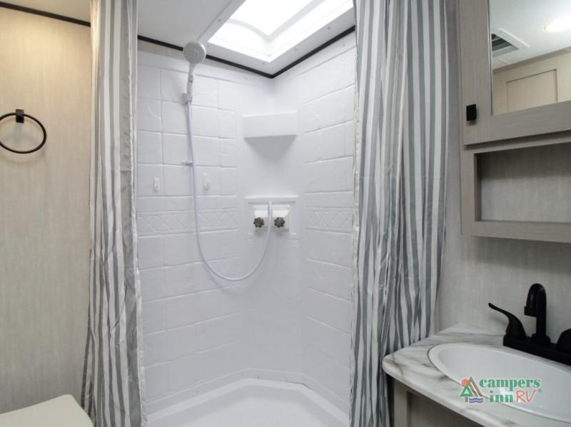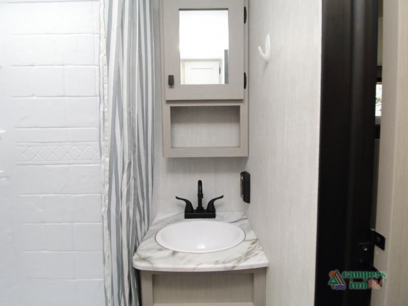 Inside, enjoy Shaw residential flooring, matte black galley hardware, seamless countertops, and a hand-crafted wood medicine cabinet for a stylish, home-like feel.