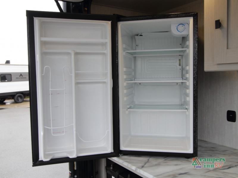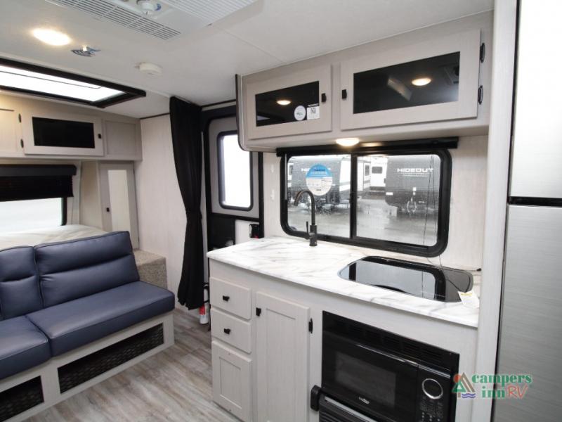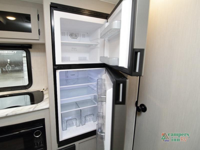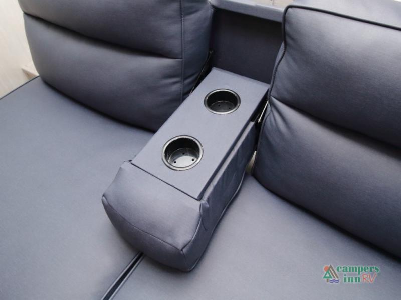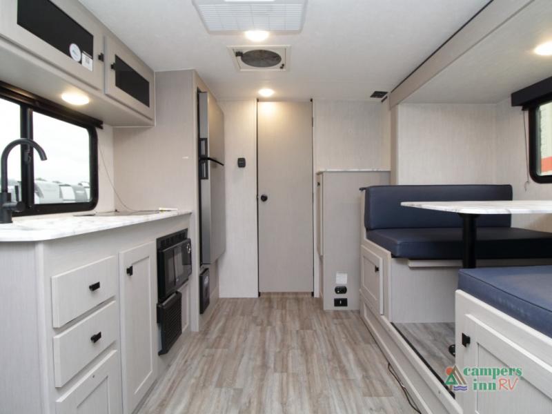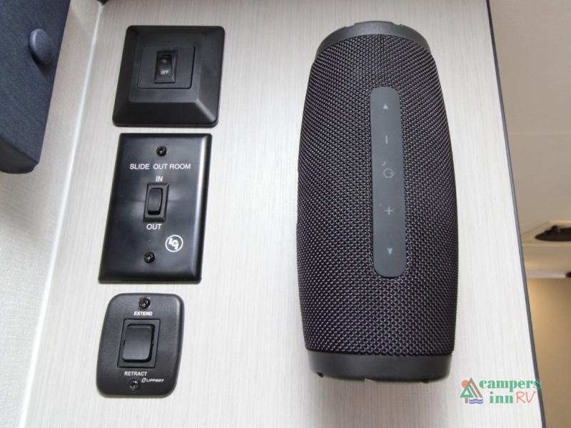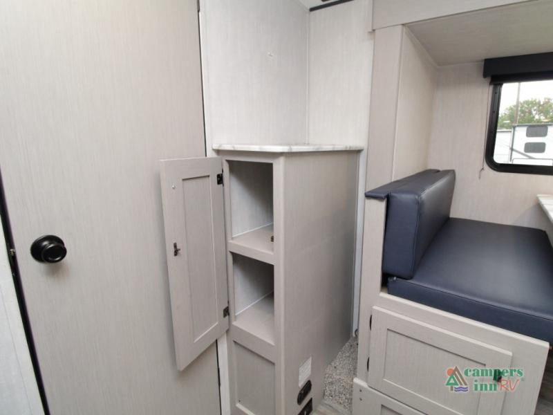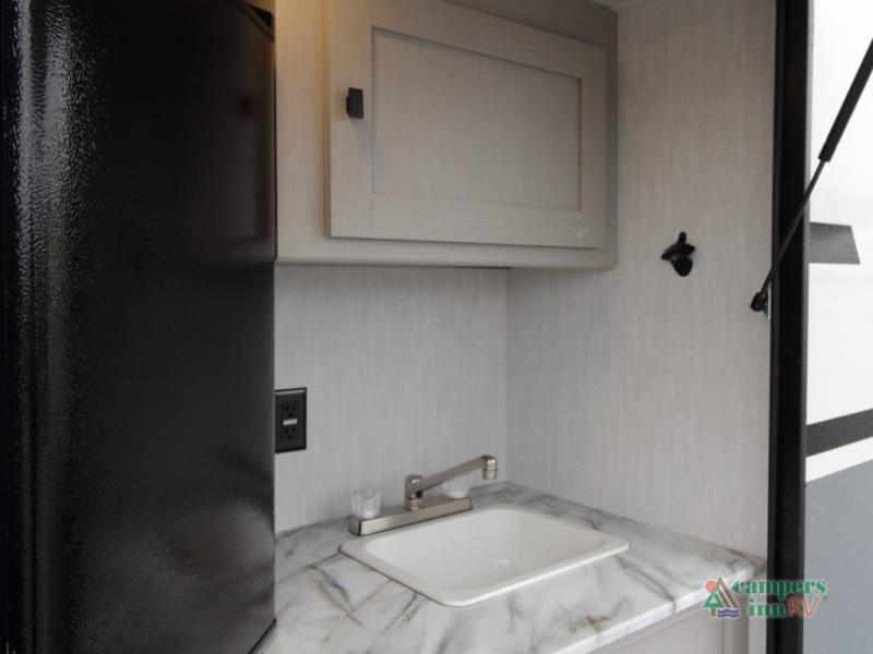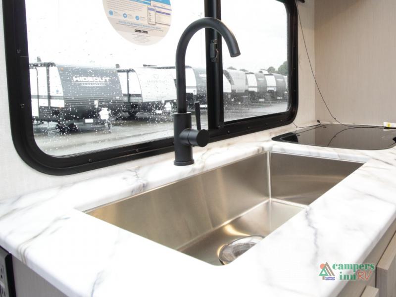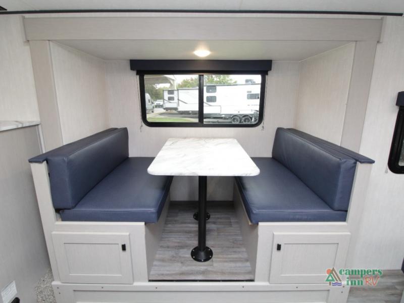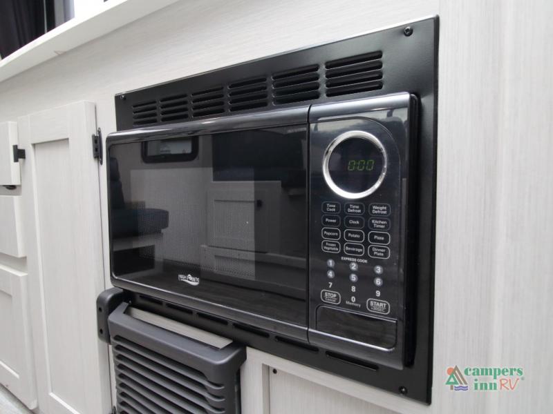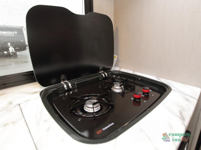 Setting up camp is quick and simple with a power awning and slide-out dinette that extend at the touch of a button. Cook indoors using the two-burner range, microwave, and pantry, or take your culinary skills outside at the outdoor kitchen.