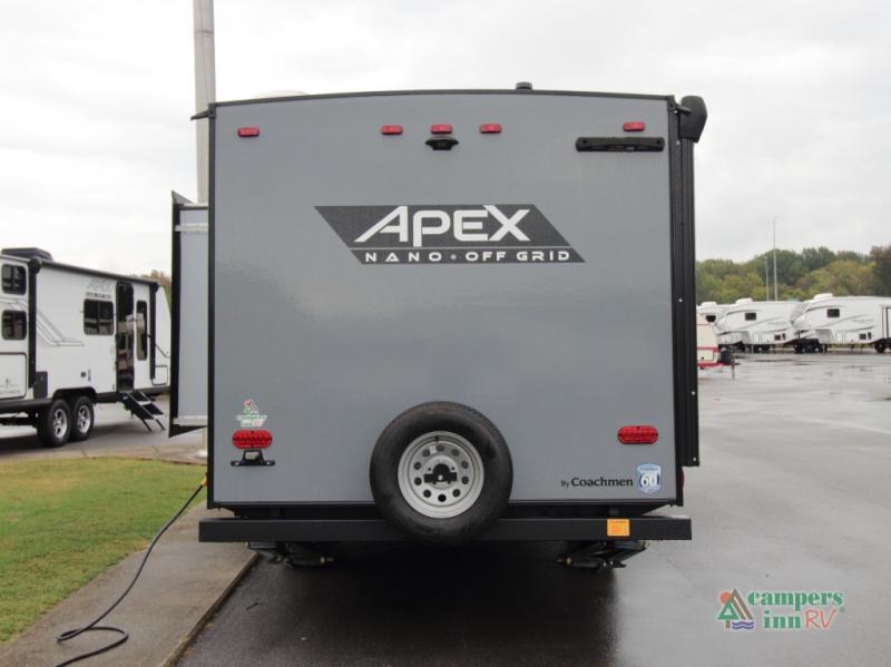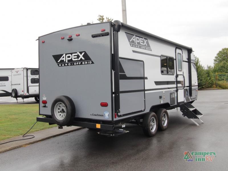 Each Coachmen Apex Nano features Aluma-Cage construction, an I-beam chassis, and vacuum-bonded laminated Azdel fiberglass walls for superior strength and weather protection. The Off-Grid Package includes a 200-watt solar panel with a 30-amp controller, two 20 lb. LP tanks, and 12V outlets—keeping you powered up wherever you roam. Additional highlights include:
