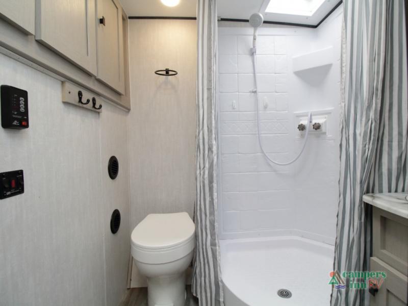 The rear bathroom includes a wardrobe and plenty of space to freshen up in privacy, while the front queen bed or optional Murphy bed provides a cozy spot to recharge for the next day’s adventure.