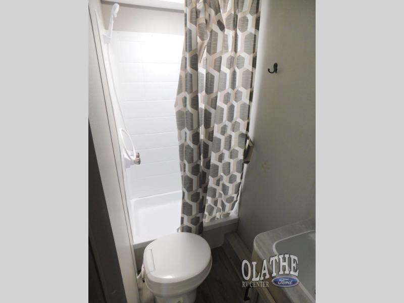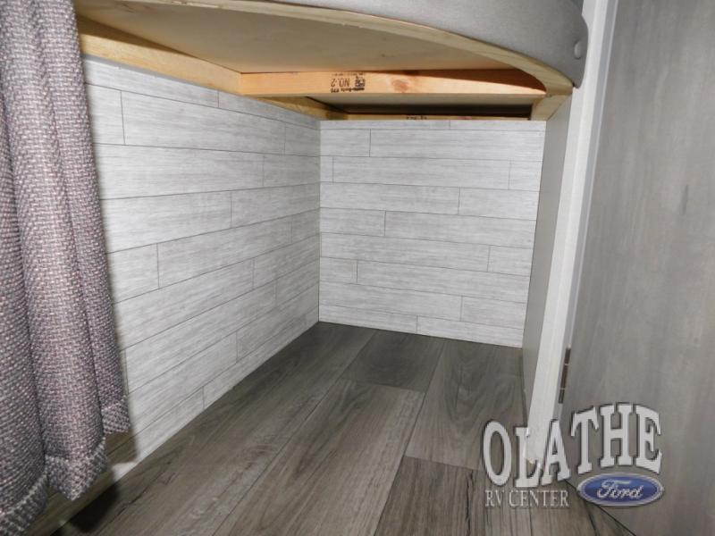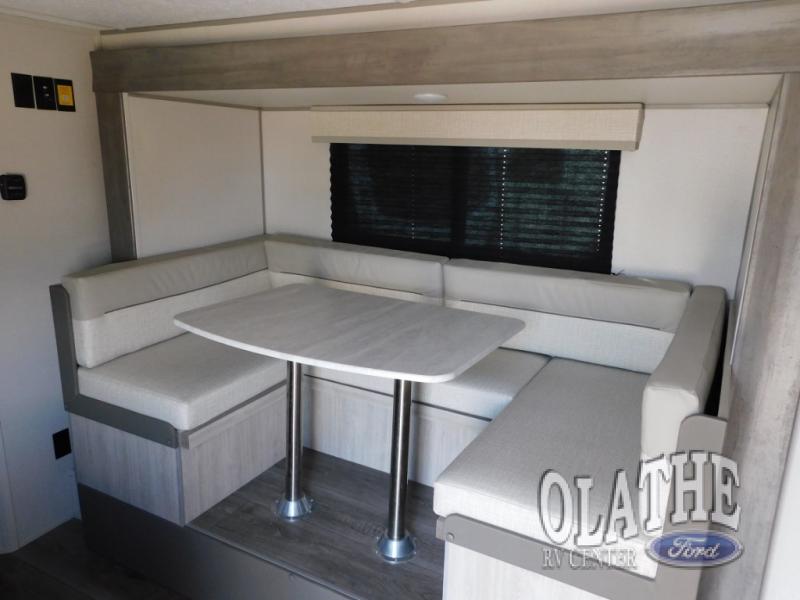 This trailer is easy to tow, store, and maneuver at campgrounds into parking spots! After a day of exploring, everyone can enjoy napping or falling asleep on the double-size bunks next to the full bathroom, or on the Murphy bed up front. There is also under-bunk storage for lake gear or extra luggage! This front multi-use space offers both a living area and bedroom depending on the time of day.  The U-shaped dinette gives everyone a place to dine inside, or you can head outside to grab your camping chairs from the pass-through storage and dine under the 15' power awning with multicolor LED lights. There is much more to enjoy inside and outside, and you might like to add the optional camper kitchen as well.