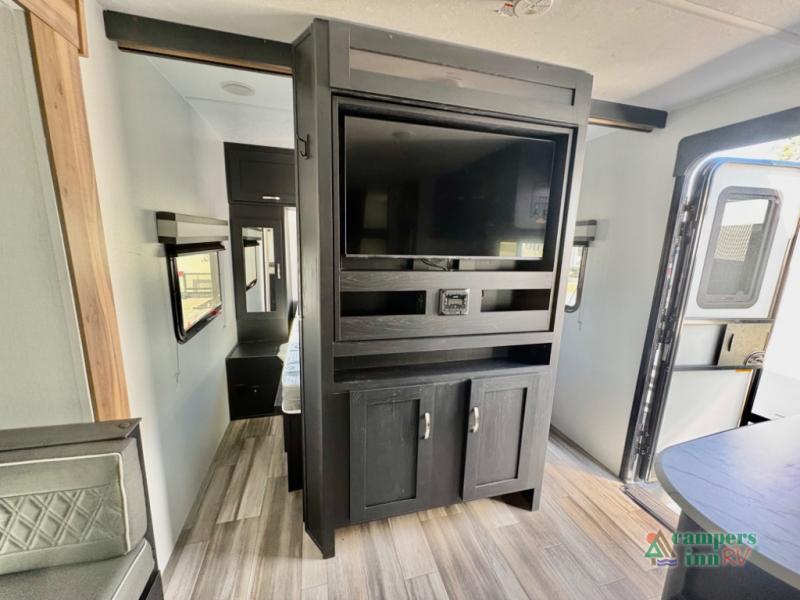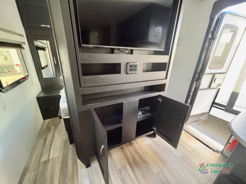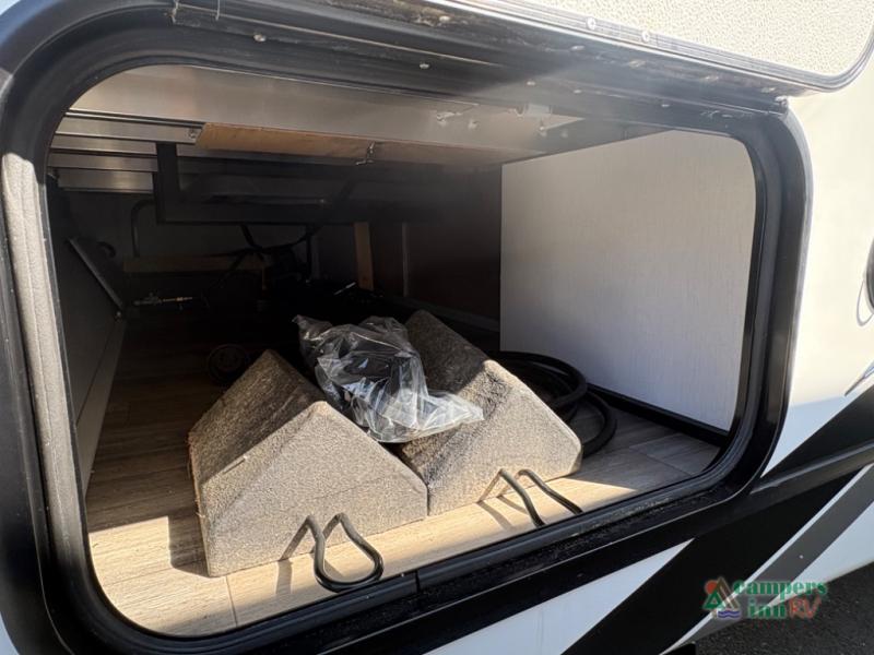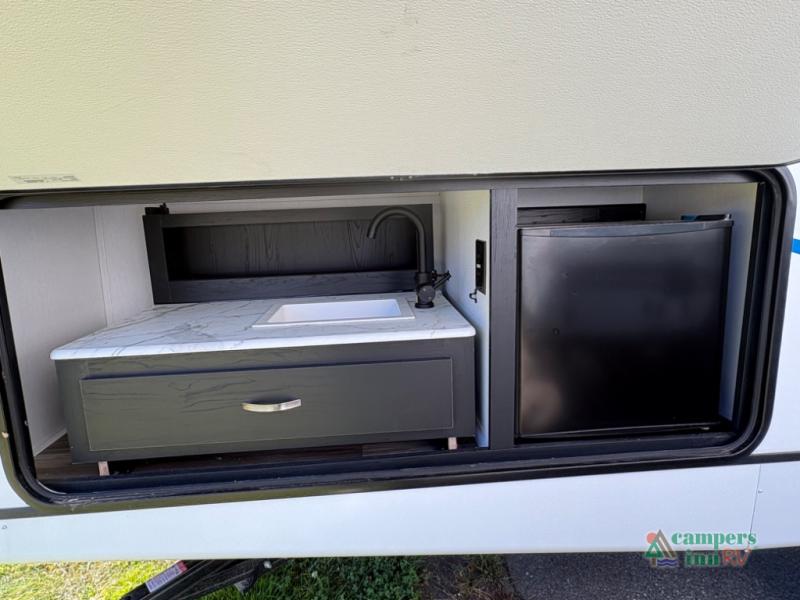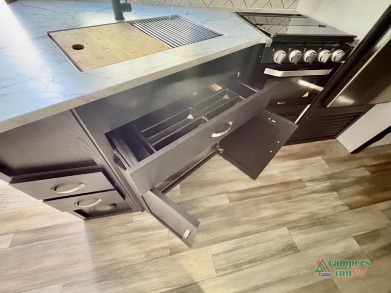 Enjoy all the benefits of outdoor living with features like an outdoor kitchen, hot/cold spray port, and exterior pass-through storage for your camping gear. Setup is a breeze with the power tongue jack, stabilizer jacks, and quick-connect LP hookup for grilling under the stars.