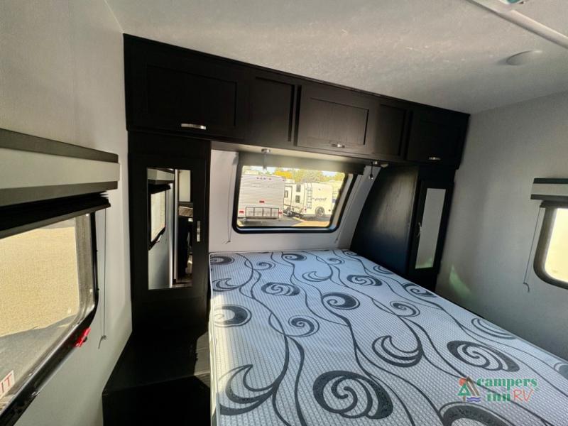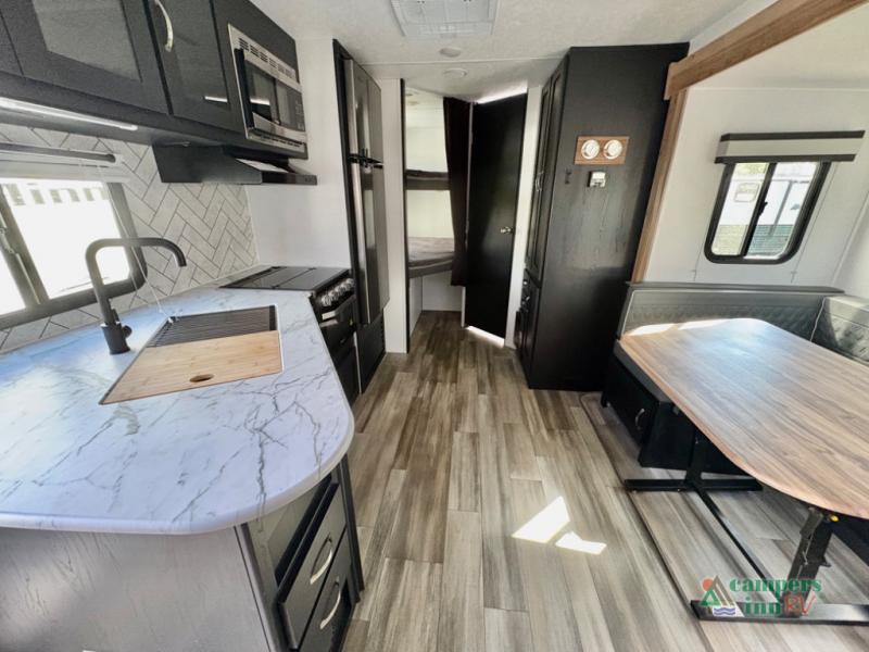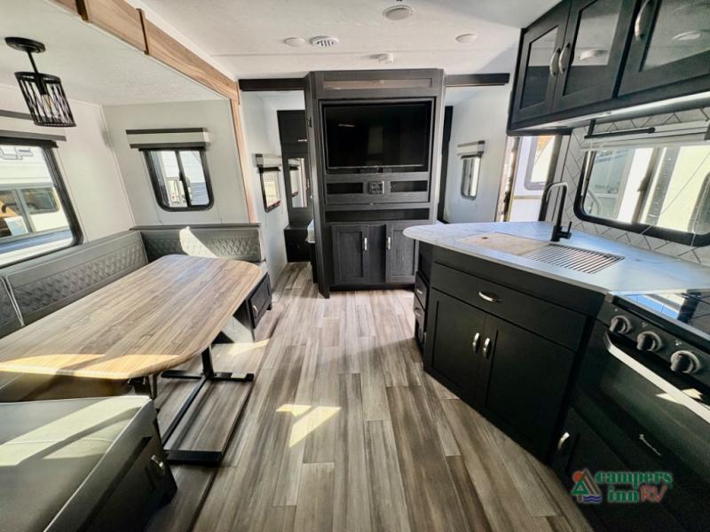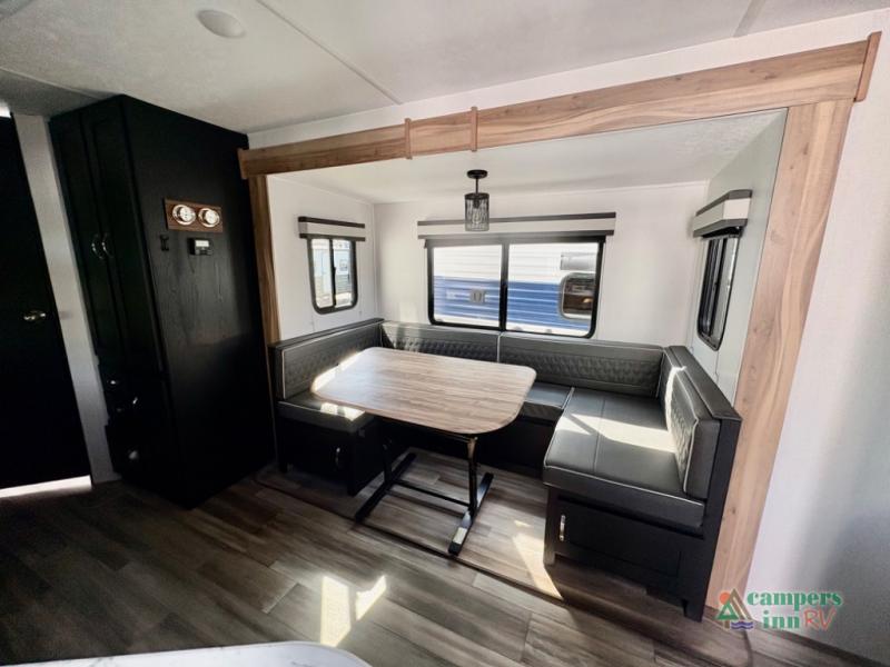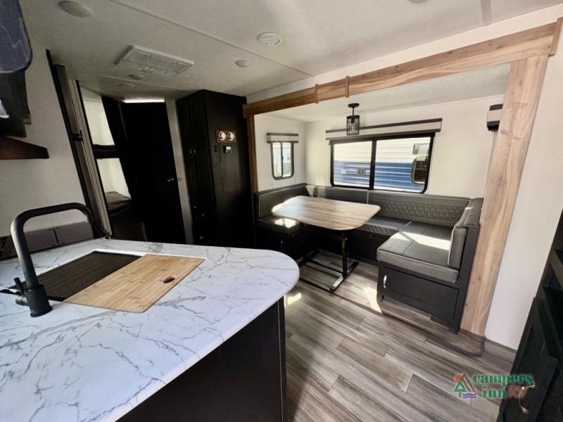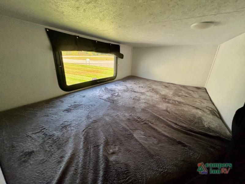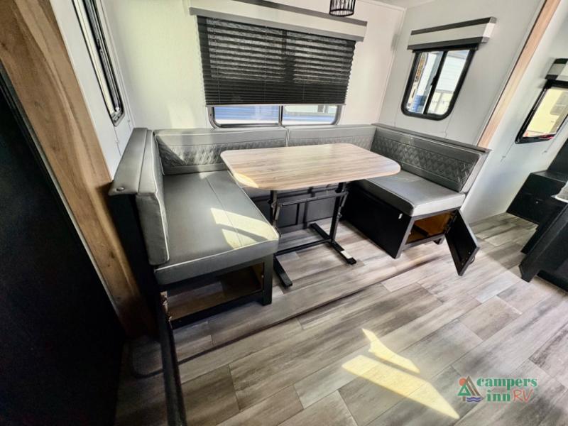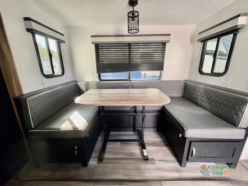 This popular floorplan is designed with families and groups in mind. The rear double-over-double bunk beds give the kids or guests their own cozy space, while the private front queen bedroom offers a peaceful retreat for parents. The large U-shaped dinette comfortably seats everyone for meals or game nights and easily converts into an additional sleeping area.