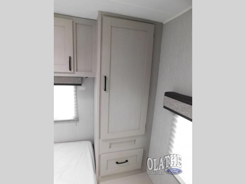 Sneak off for a getaway in this motorhome that has everything you might need! The private rear bedroom has a 60” x 80” queen bed with storage on either side and plenty of room to walk around. The bathroom is split with the shower on one side and the sink and toilet behind a separate door so sharing is a breeze. Relax up front on either the sofa or the roomy 42” x 71” dinette with cabinets above for all your supplies. A bunk over the cab provides yet another sleeping area that will be popular with little ones. Time to get out there in the Freelander!