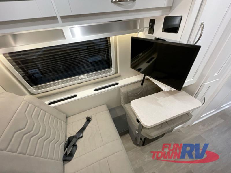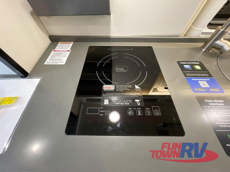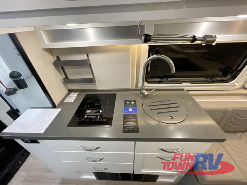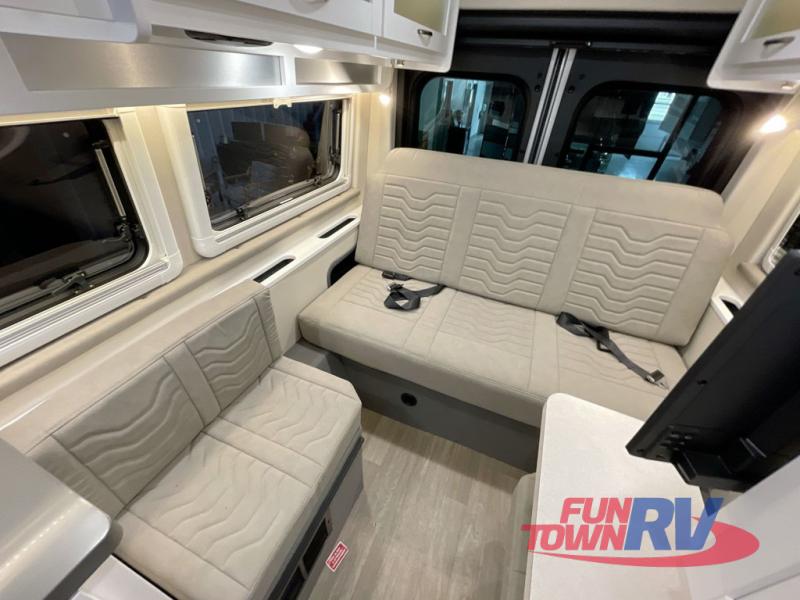 Grab your honey and head to your favorite camping spot in this cozy camper van. Once you park for the day, you can swivel the captain's seats around and enjoy coffee at the removable cockpit table. Lunch can be made on the induction cooktop, and the cold ingredients can go back in the 7.3 cu. ft. refrigerator. The convenient wet bath allows you to freshen up after a hike, and the rear lay-flat power sofa will provide comfortable sleeping space when you're ready to turn in for the night. There are also two jump seats and a lagun table if you want to say up and play a game of cards!
