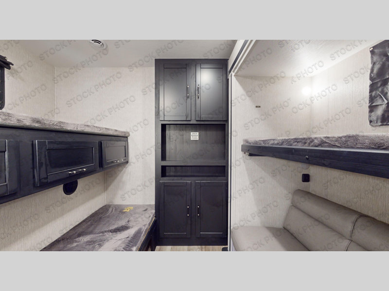 If you've been dreaming of camping with friends and family, take a look at this fifth wheel that can sleep nine people each night. The little ones will spend their time in the private bunkhouse when they're not outside riding their bikes. The half bath includes its own exterior entry door so your guests won't drag dirt through the whole trailer just to use the restroom, and the second entry door conveniently leads into the main living area. Here, you can relax on the booth dinette and tri-fold sofa within the large slide out, and if you're wanting even more comfort, just choose the optional power theatre seats in place of the tri-fold sofa. You will find all the appliances indoors to prepare meals each day, plus there is an exterior kitchen that will be perfect when frying fish or bacon!