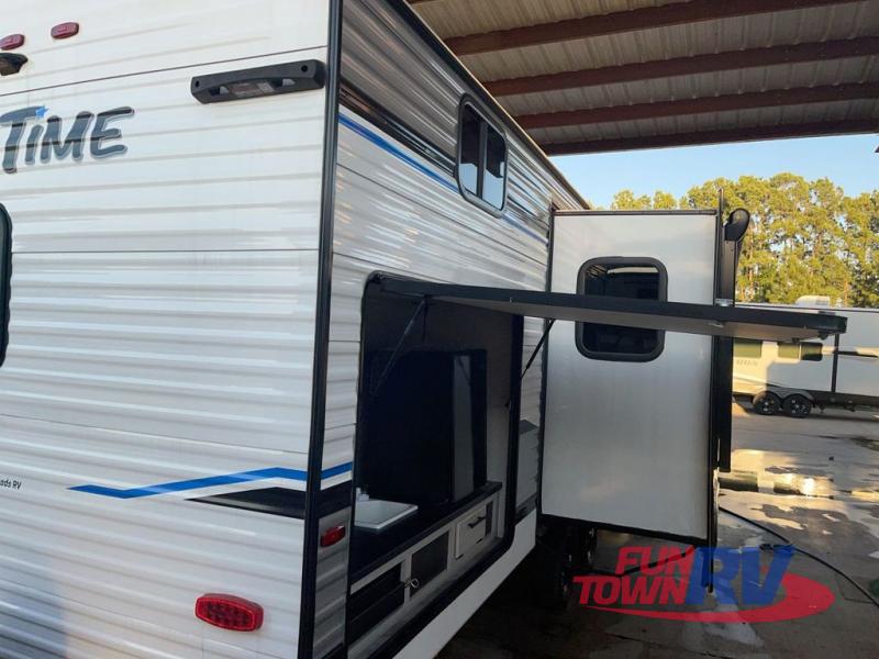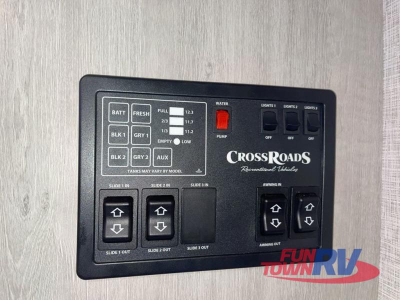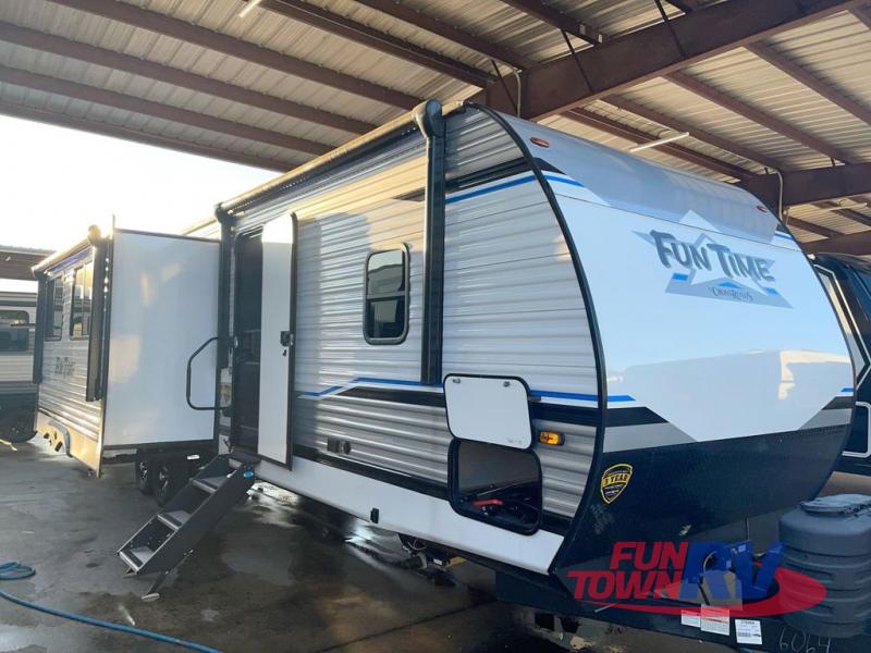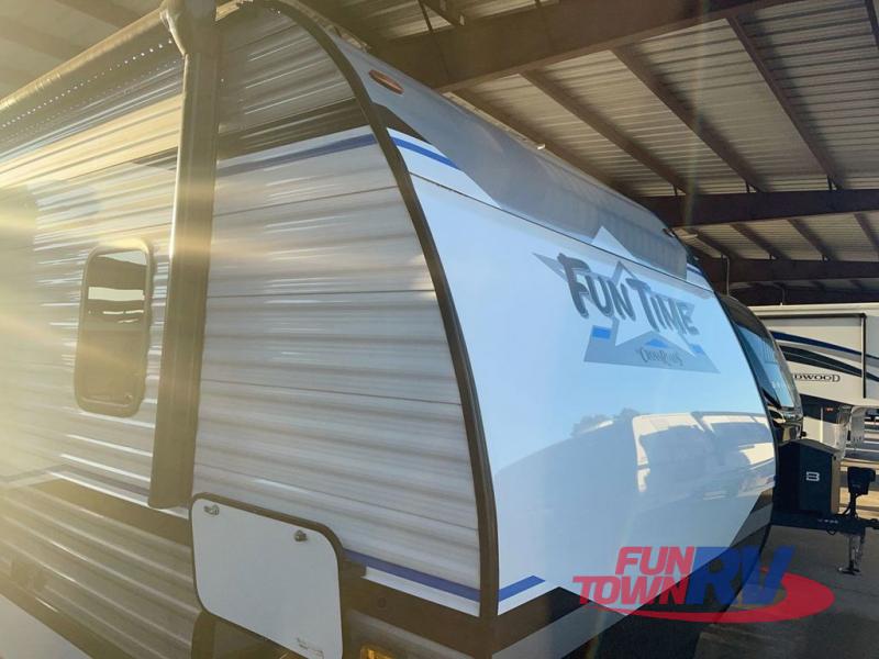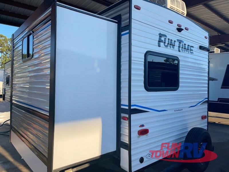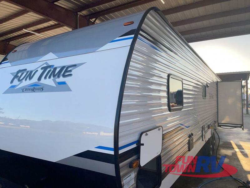 With any Fun Time travel trailer by CrossRoads RV, you can be sure to find comfort and convenience at every turn. The Super Flex Alpha roof will last through years of use and there is a front diamond plate for added protection. The pass-through storage will be perfect for lawn chairs, fishing poles, and more camp gear, and the Keyed-A-Like doors will help keep your trailer secure. Each model also includes back up camera prep and solar prep, radial tires, a friction hinge entry door, and many more exterior conveniences. Head inside to find at-home comforts such as, pleated shades/mini blinds/fabric window treatments, WiFi prep, and a wall mounted monitor panel to easily control your trailers functions. Choose a Fun Time travel trailer today to discover more stand-out features!