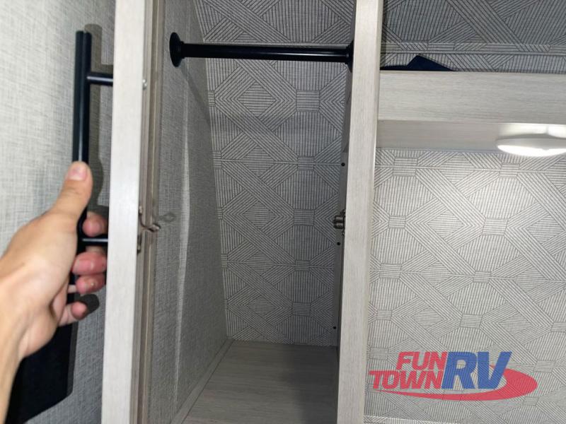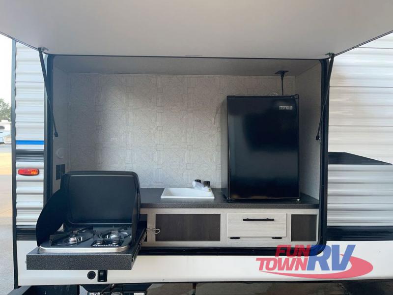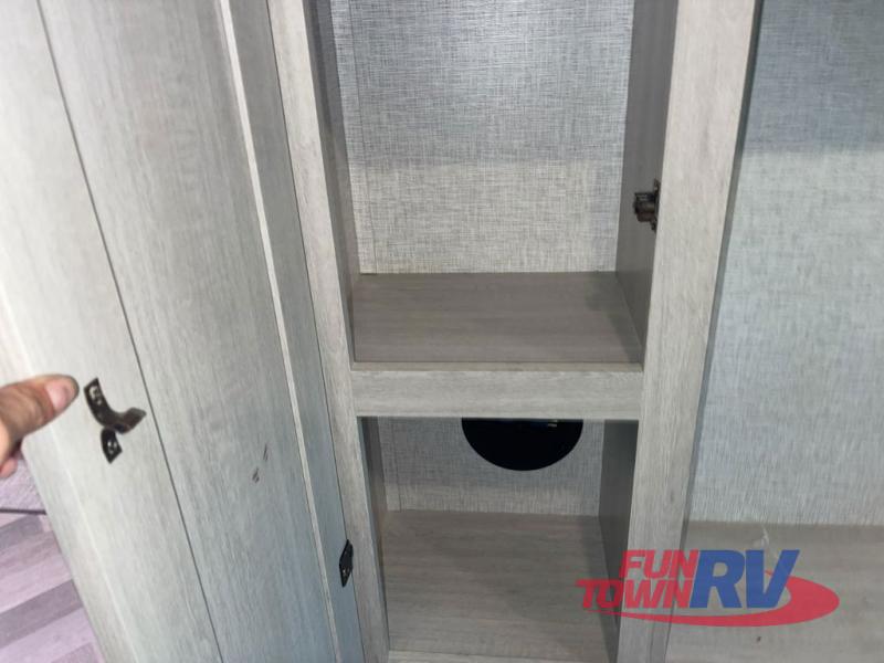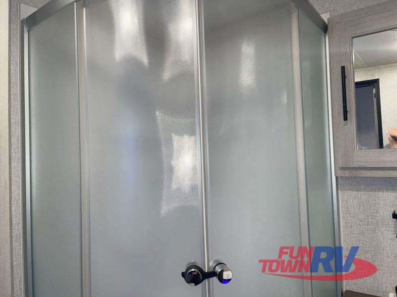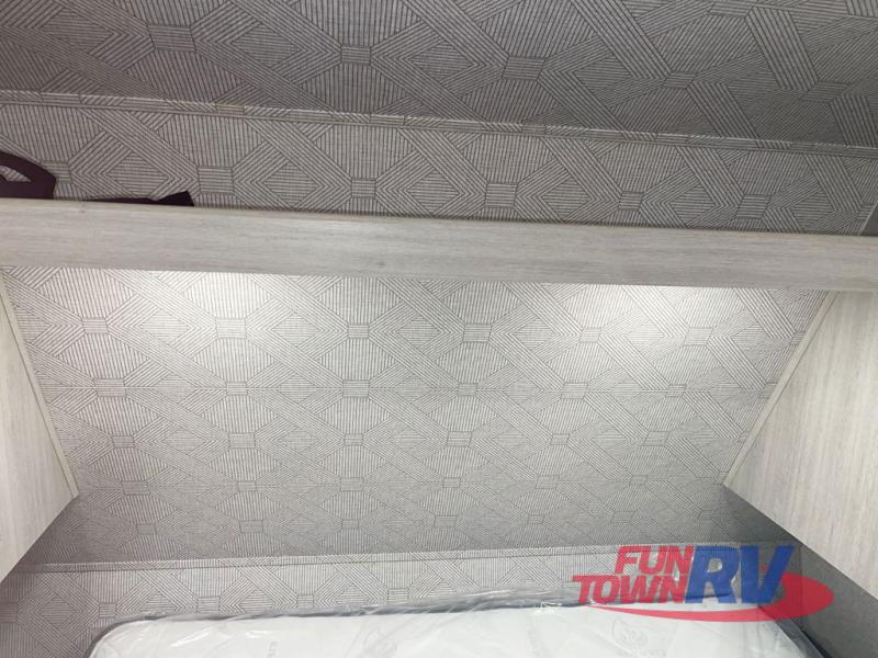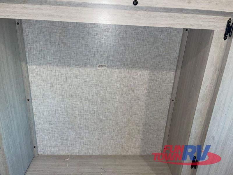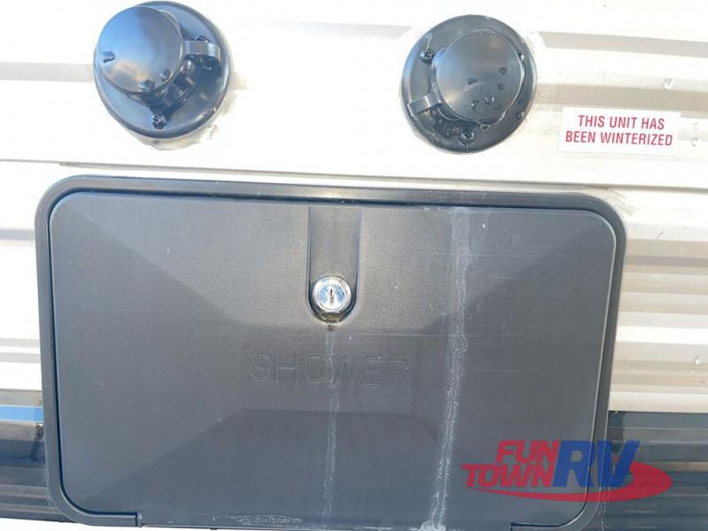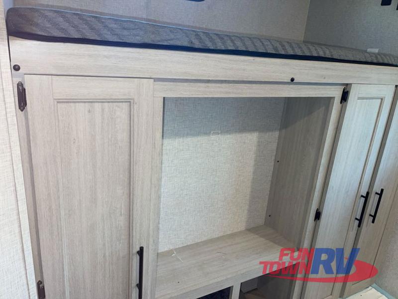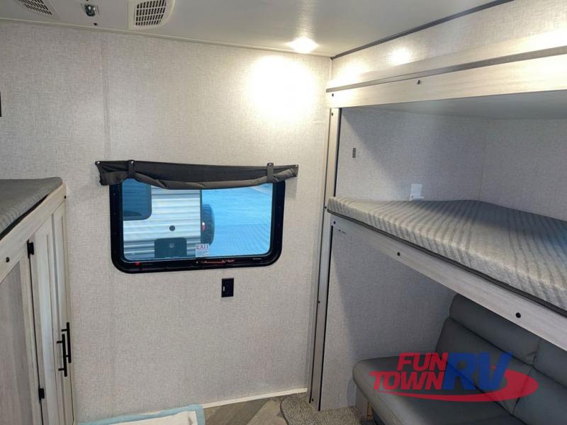 The whole family will love camping in this travel trailer! It features a front private bedroom with a 60" x 74" RV queen bed and a private entrance into the dual-entry bathroom. There is a rear private bunkhouse for the kids or guests to sleep on the 38" x 74" flip-up bunk above the 72" tri-fold sofa which is across from a 38" x 74" bunk above a wardrobe. There's room for everyone to watch a movie at the entertainment center between the 60" sofa and the 80" U-shaped dinette, which creates a Z-Lounge. The dual-entry bathroom is easy to access and has a 34" radius shower, a linen closet, and a medicine cabinet for you to get ready all in one place!