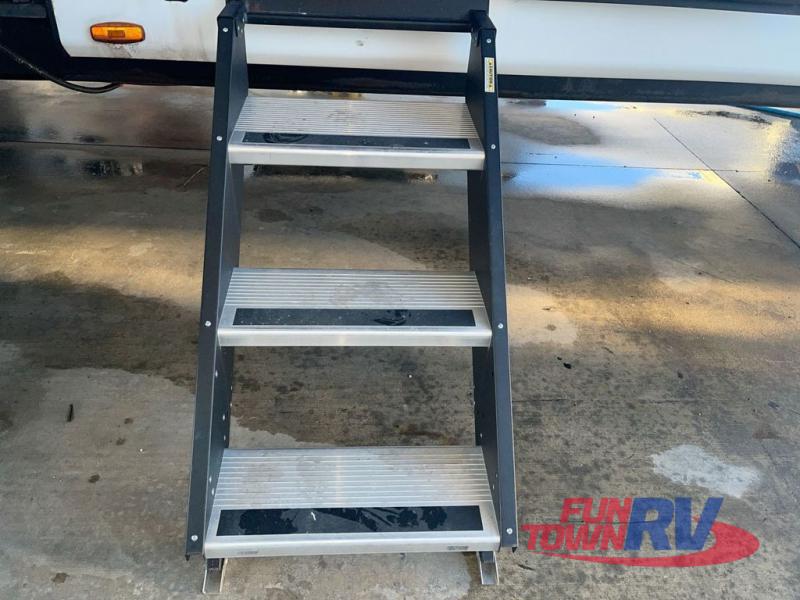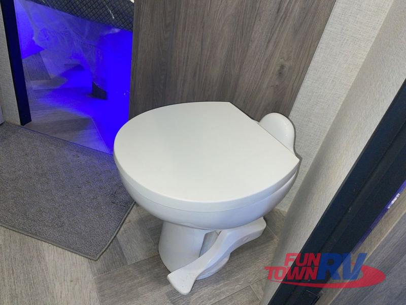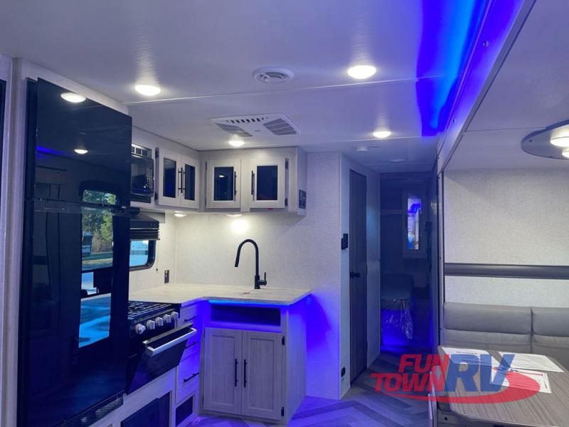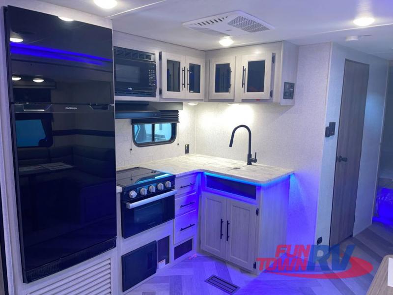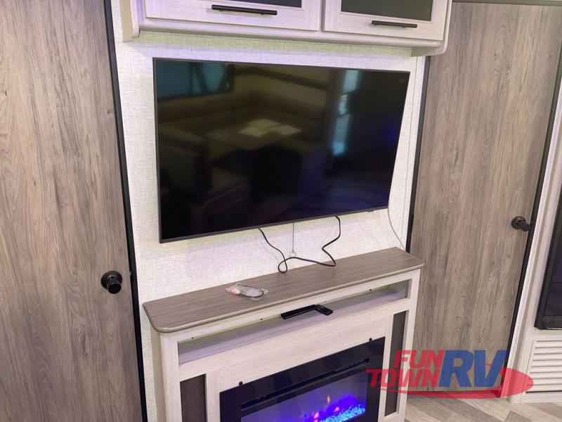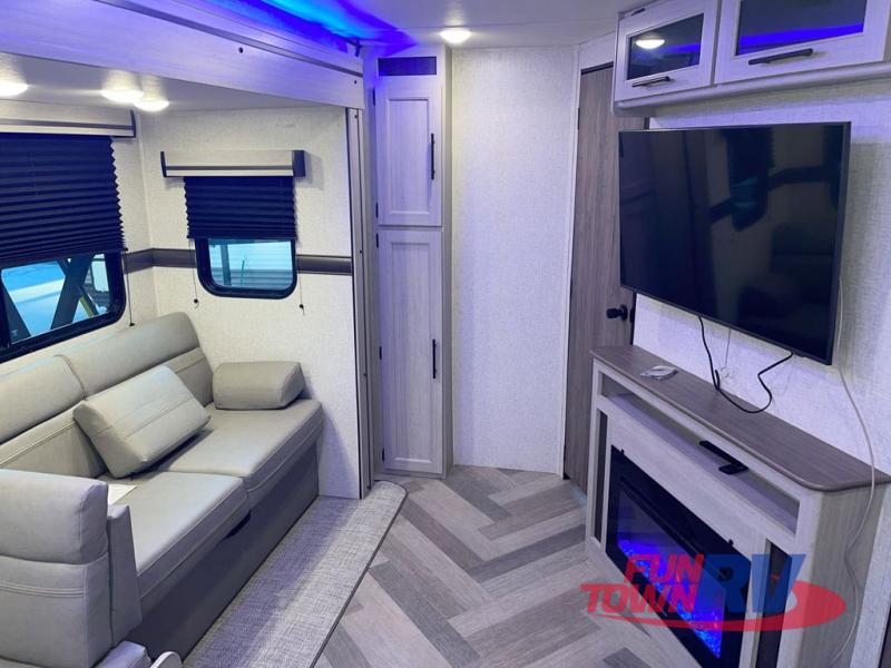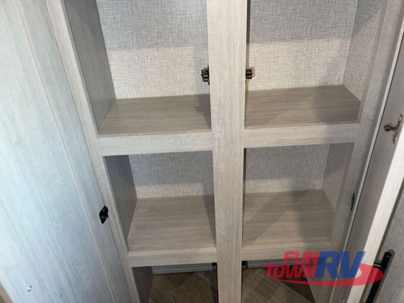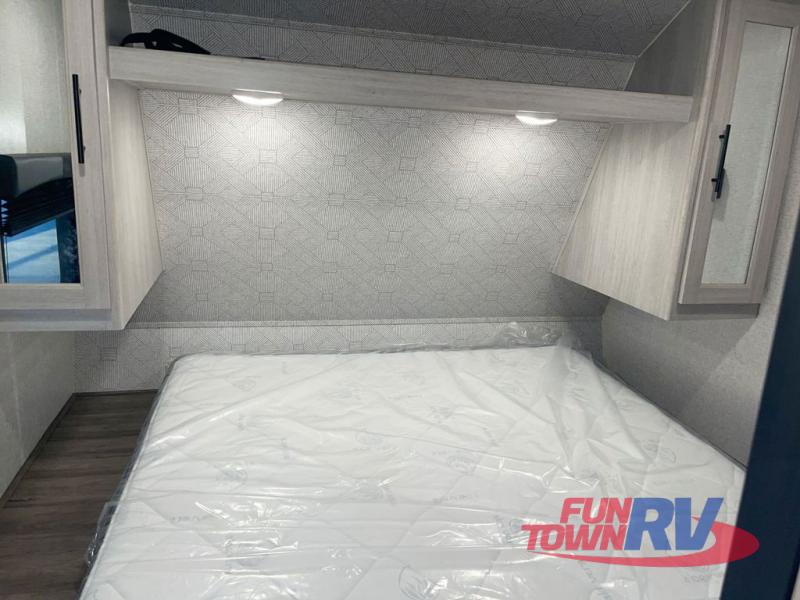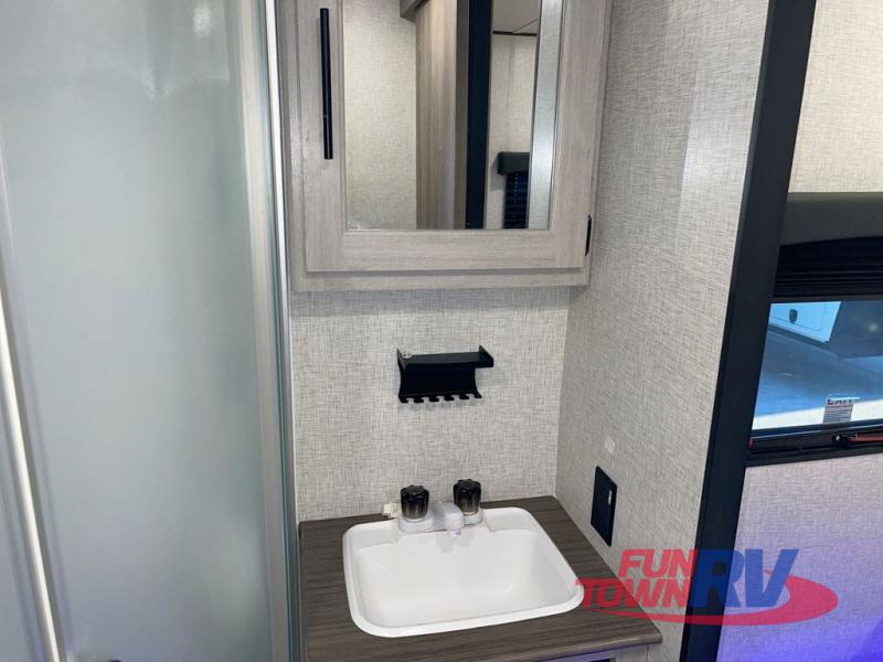 The whole family will love camping in this travel trailer! It features a front private bedroom with a 60" x 74" RV queen bed and a private entrance into the dual-entry bathroom. There is a rear private bunkhouse for the kids or guests to sleep on the 38" x 74" flip-up bunk above the 72" tri-fold sofa which is across from a 38" x 74" bunk above a wardrobe. There's room for everyone to watch a movie at the entertainment center between the 60" sofa and the 80" U-shaped dinette, which creates a Z-Lounge. The dual-entry bathroom is easy to access and has a 34" radius shower, a linen closet, and a medicine cabinet for you to get ready all in one place!