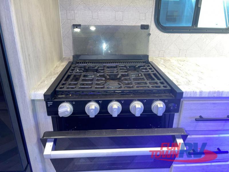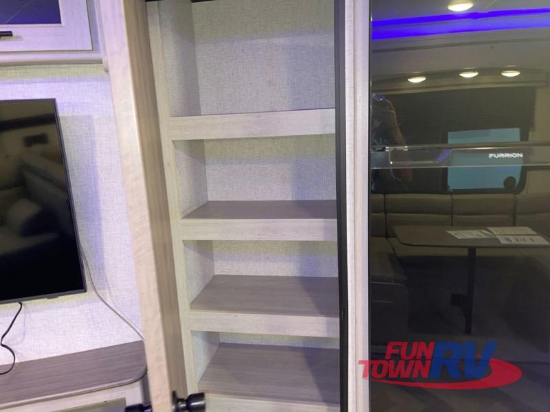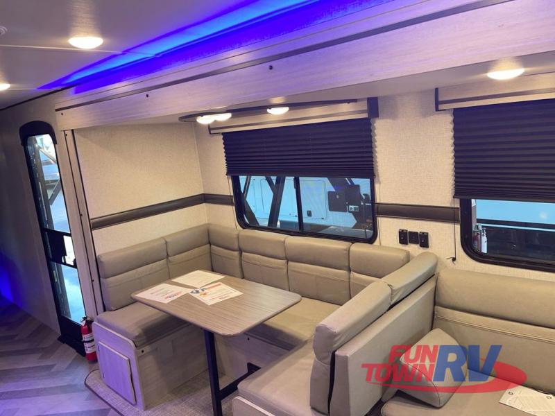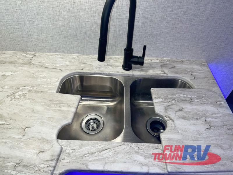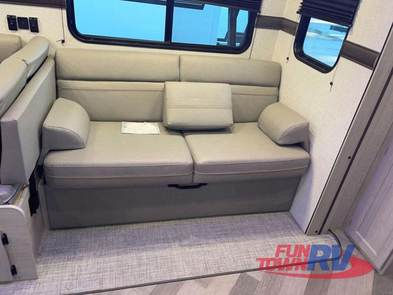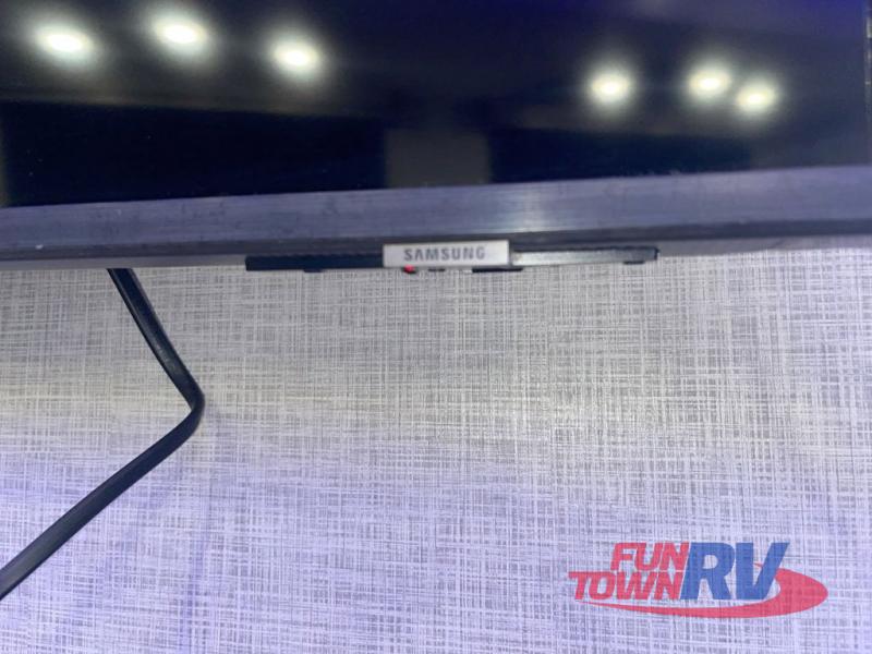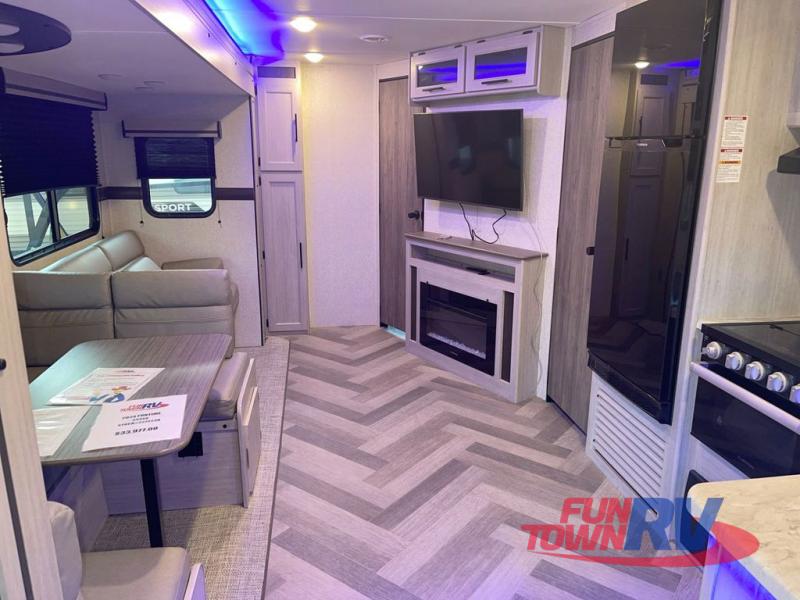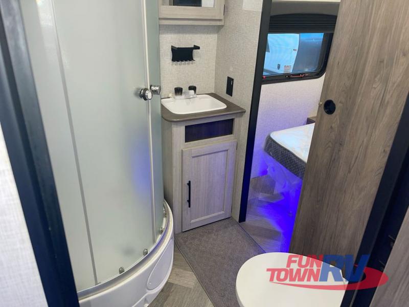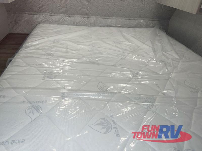 The whole family will love camping in this travel trailer! It features a front private bedroom with a 60" x 74" RV queen bed and a private entrance into the dual-entry bathroom. There is a rear private bunkhouse for the kids or guests to sleep on the 38" x 74" flip-up bunk above the 72" tri-fold sofa which is across from a 38" x 74" bunk above a wardrobe. There's room for everyone to watch a movie at the entertainment center between the 60" sofa and the 80" U-shaped dinette, which creates a Z-Lounge. The dual-entry bathroom is easy to access and has a 34" radius shower, a linen closet, and a medicine cabinet for you to get ready all in one place!