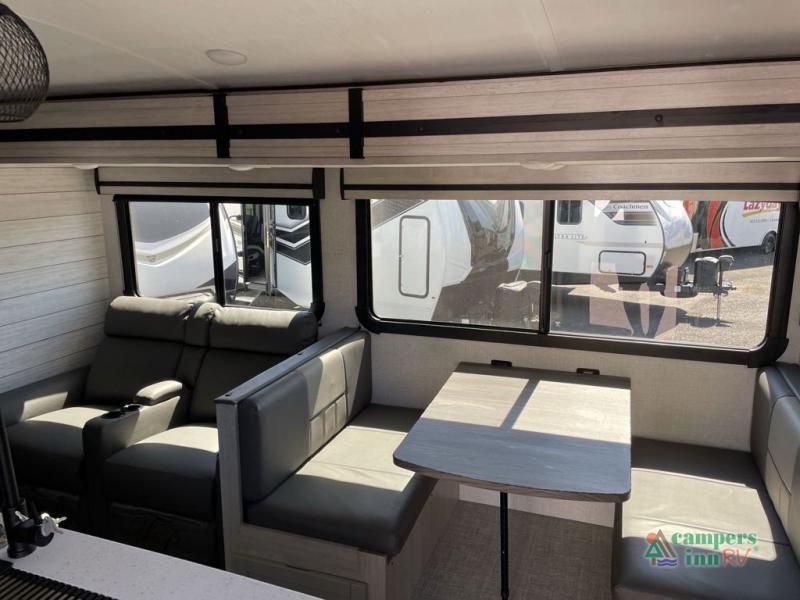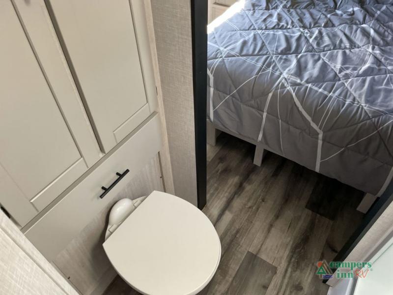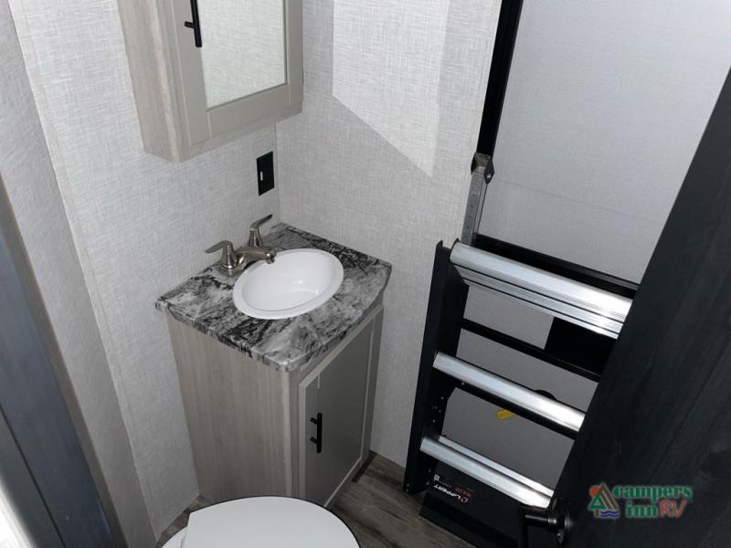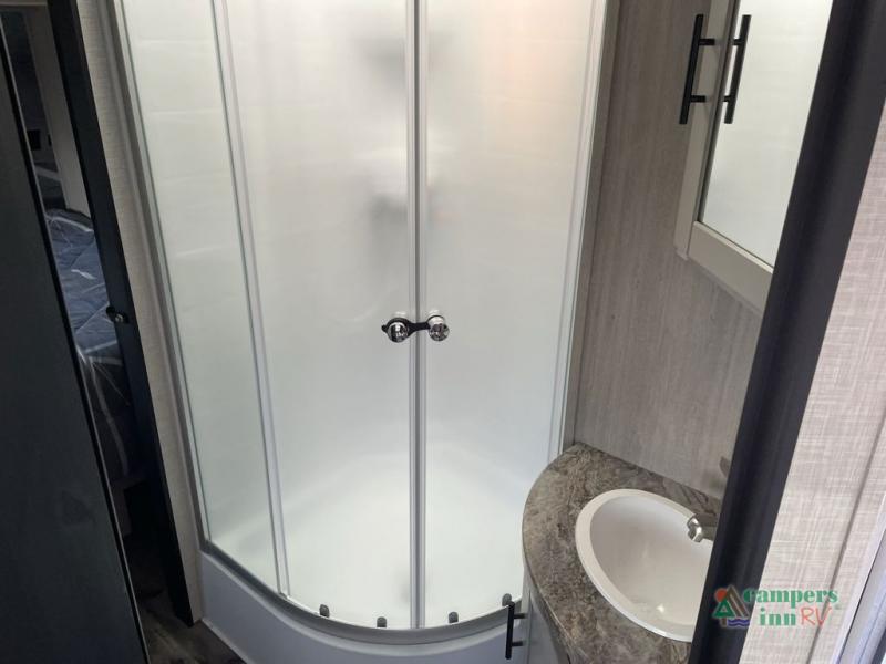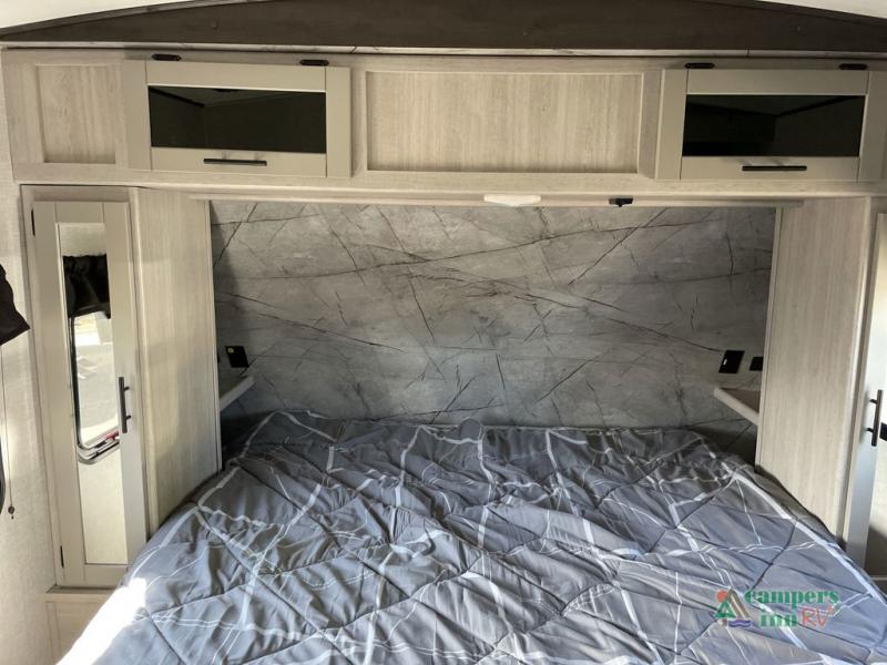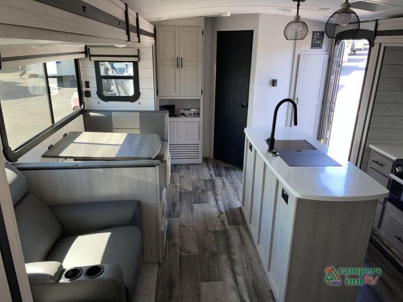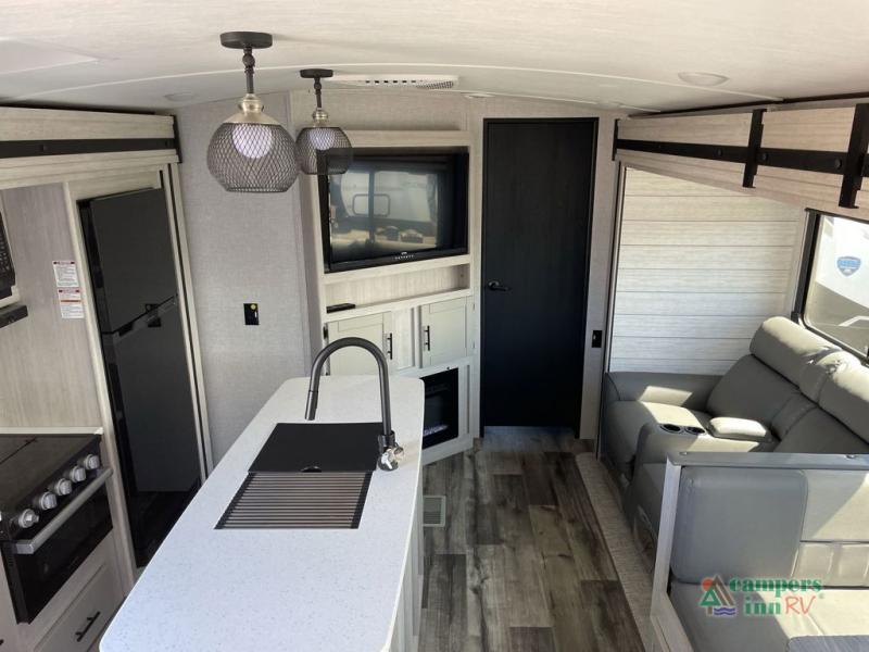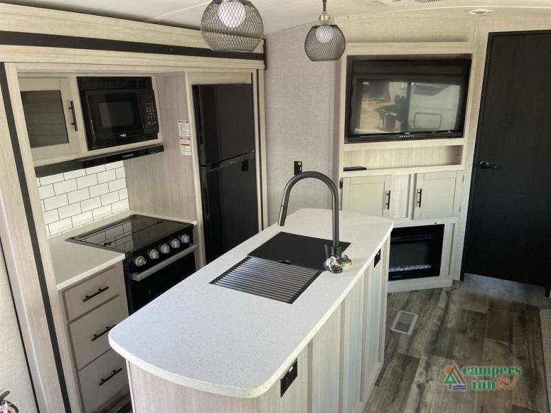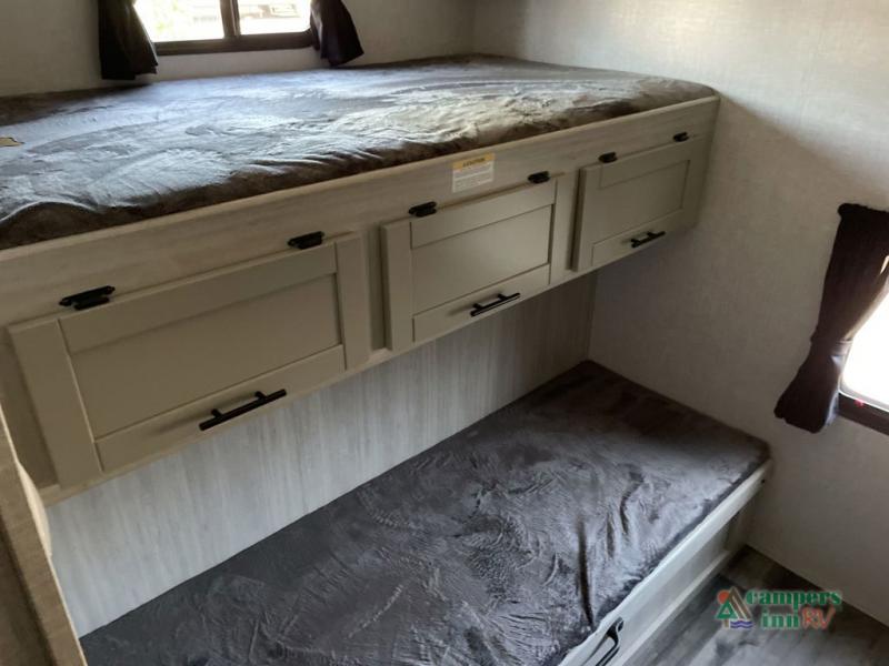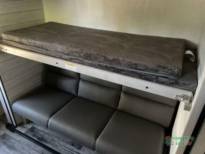 This travel trailer is packed with convenient features and luxury comforts for a camping trip you won't soon forget. Once you arrive at the campground, put out the electric awning and make a quick lunch on the exterior camp kitchen. The kitchen island inside will be the perfect place to cut up all the fixings for the burgers and you can grab the chips from the pantry. The kids will love the private bunkhouse that includes two bunks, a jackknife sofa with a kick, plus a dual entry half bath for convenience. The full walk-through bath will create a front master bedroom you are sure to love. Here, the king bed will provide a great night's rest and there are dual wardrobes for all your clothes. Plus there is a convenient shoe storage and pet station for your trusted loyal friends!