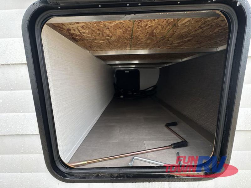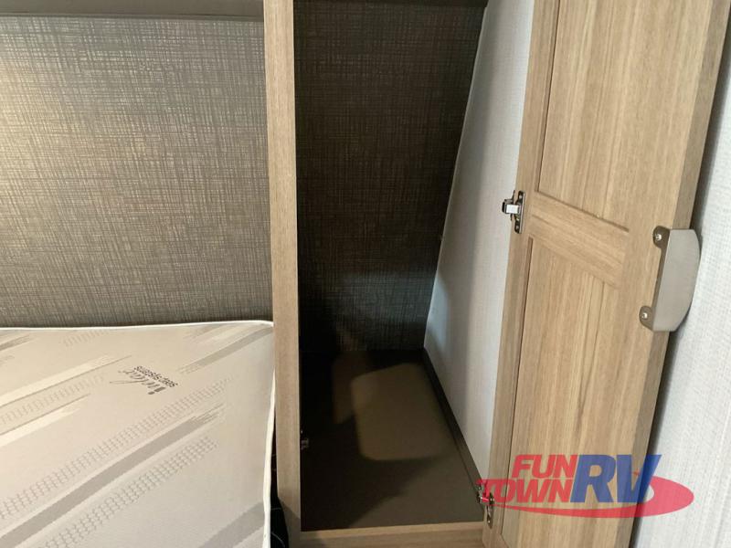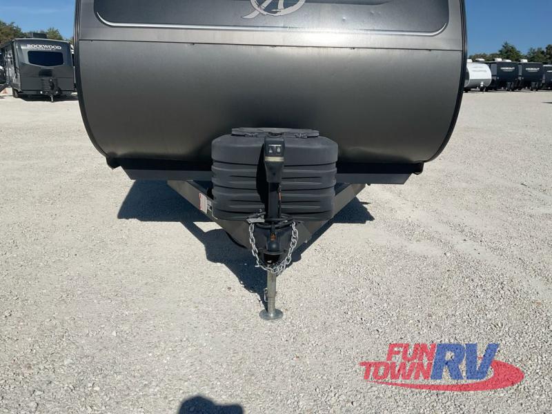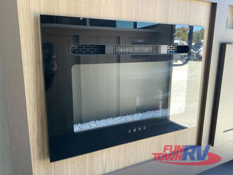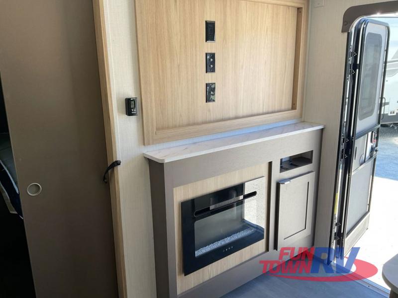 Dual entry doors, sleeping space for nine, and a spacious interior make this model perfect for camping with a larger group! Your crew can relax by the fireplace in the evening on the Lux Lounge, which will convert to sleeping space. There is also a booth dinette that will provide a place to dine each day, as well as a place for more guests to sleep if needed. You can be sure the double-size bunks will be claimed by the littles ones, and the queen bed in the front private bedroom will provide a great night's rest after adventuring in the woods. Whip up your best meals on the three burner cooktop, freshen up in the full bath with its own exterior entry door, grab a cold drink from the exterior refrigerator, and do so much more in this spacious trailer!