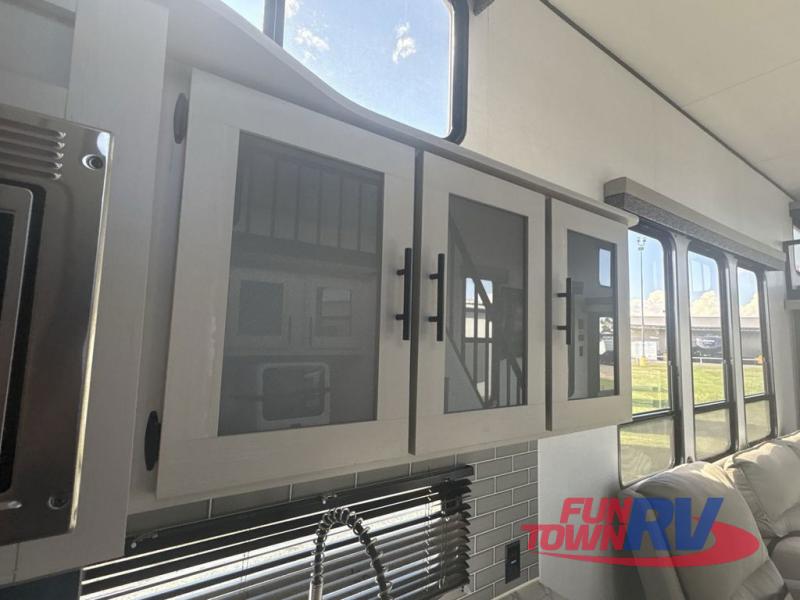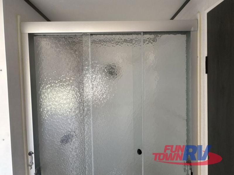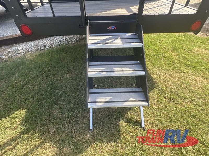 Big brother and similar to 260THLOFT, model 360THLOFT is longer and includes an added front bedroom beneath the front loft. The rear entry steps lead to the back patio where you can set up your chairs and enjoy evenings outdoors, and there is a loft area with twin-size sleeping above the patio for guests or added storage. You'll have the main front bedroom with private entry below the front loft with a queen-size bed for even more sleeping, plus there is a fireplace in the loft above to keep you warm at night. The lower living area of this unit includes theater seating, a recliner, and table with two stools. A full kitchen with an oven and three burner cooktop will let you cook meals each day, and there is also a washer and dryer plus a dishwasher as well! The walk through bath on the way to the front bedroom features a shower on one side and a toilet and vanity with sink opposite. You will love all of the windows providing tons of natural lighting inside as well.