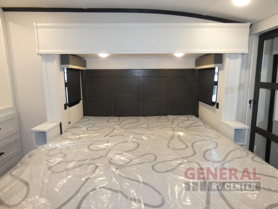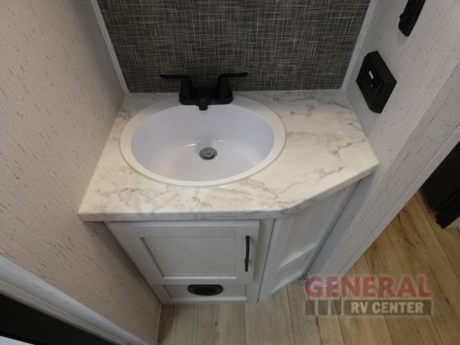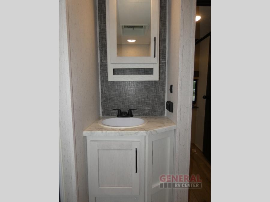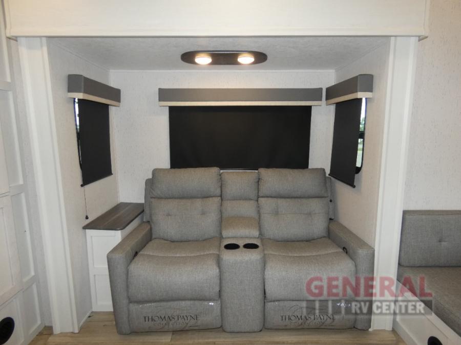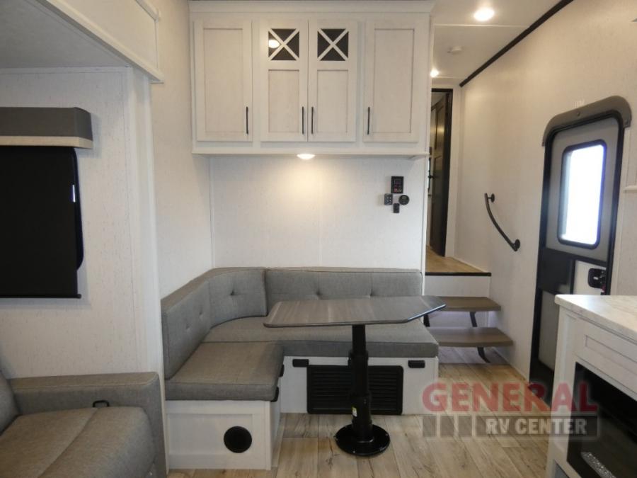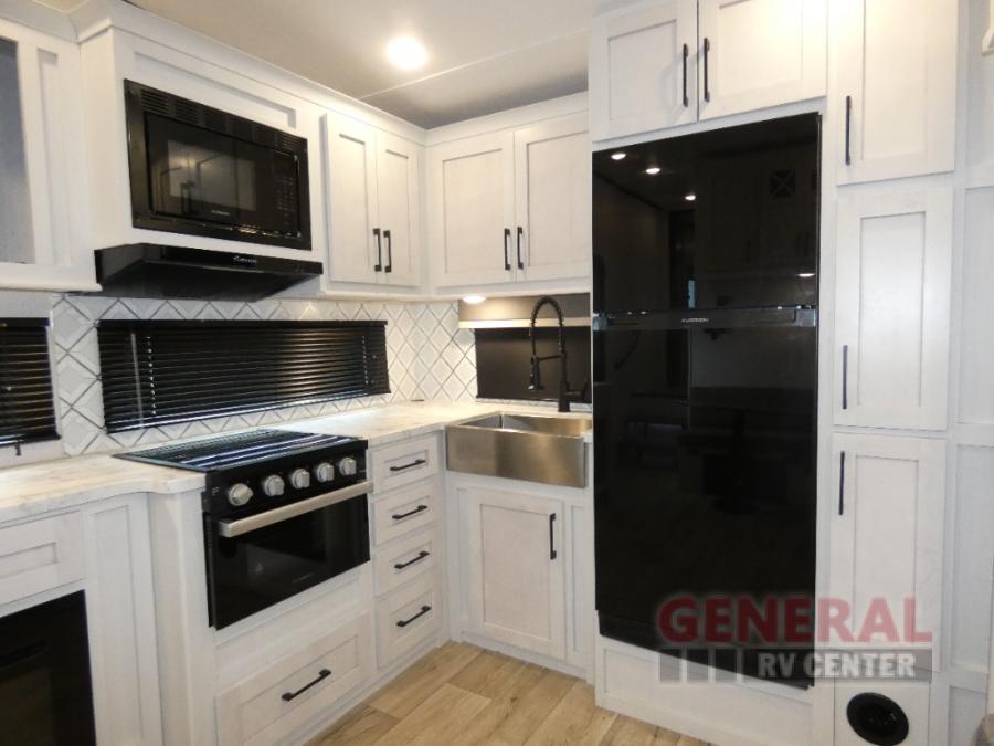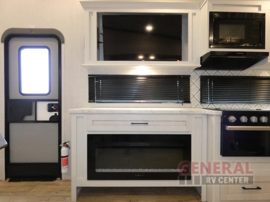 Plan to say awhile in this rear kitchen fifth wheel! You will fall in love with the front bedroom with a king bed slide out, large front closet, a dresser, plus a mounted TV for movies in bed. The rear kitchen includes plenty of space to prep meals, a farm style sink, plus a 10 cu. ft. 12V refrigerator and a pantry for food storage! You can get cozy on the theater seating slide out or at the cafe dinette, and the LED TV will ensure you'll never go bored on rainy days!