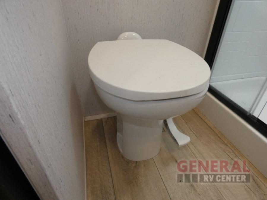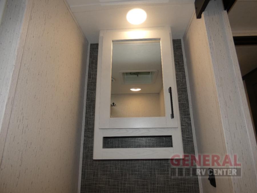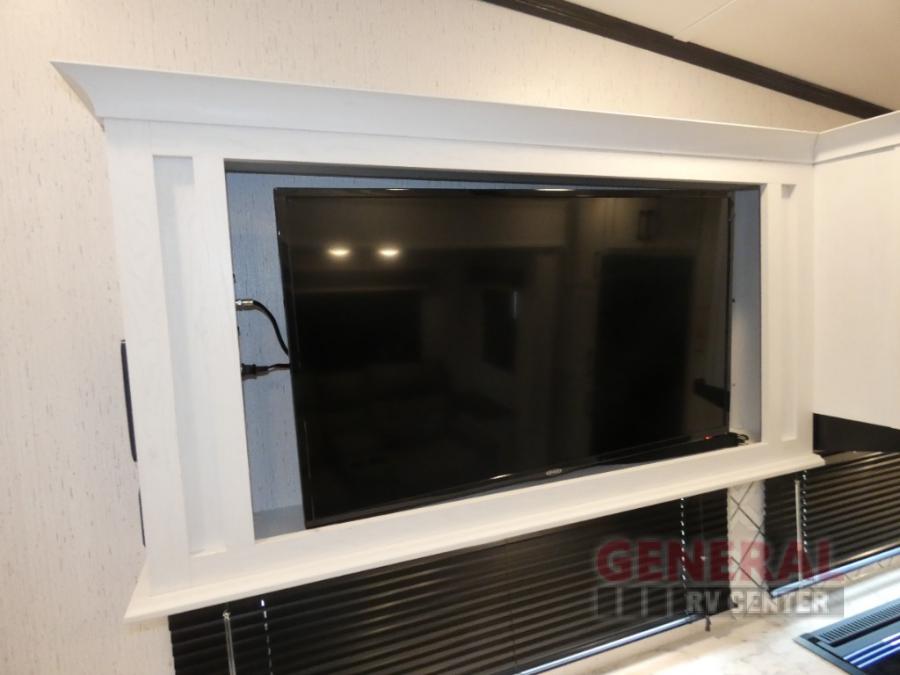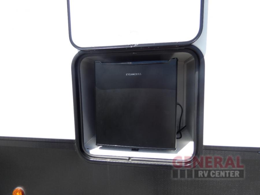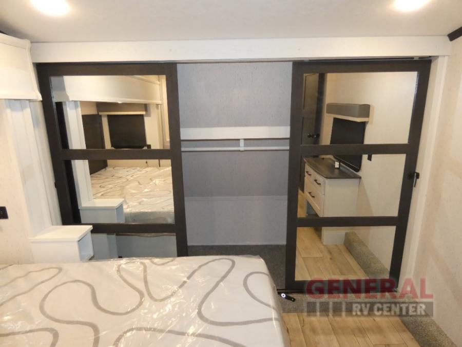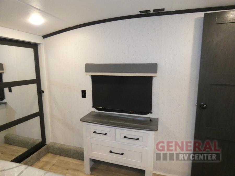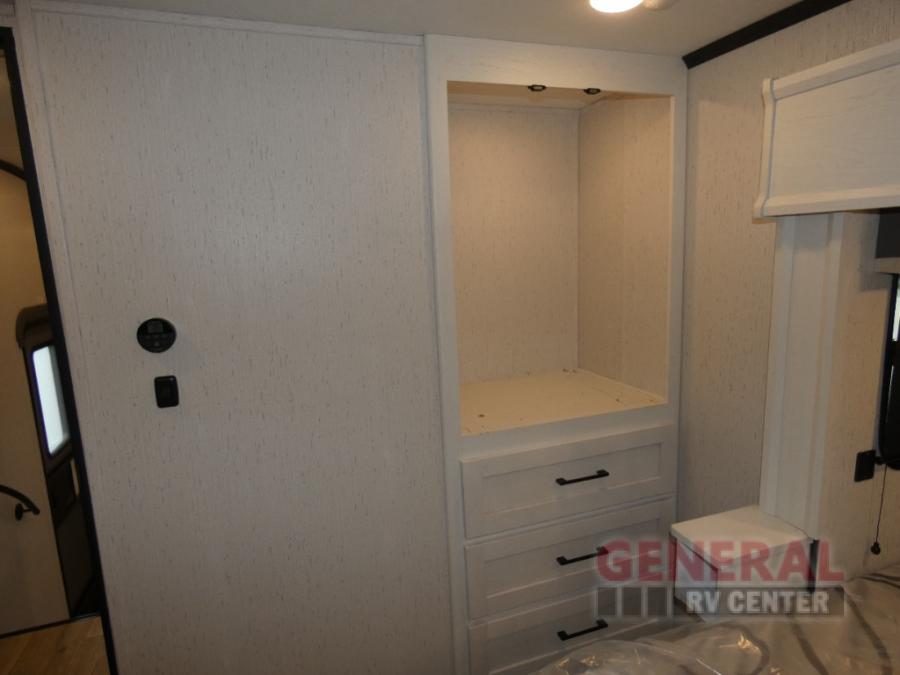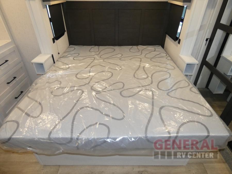 Plan to say awhile in this rear kitchen fifth wheel! You will fall in love with the front bedroom with a king bed slide out, large front closet, a dresser, plus a mounted TV for movies in bed. The rear kitchen includes plenty of space to prep meals, a farm style sink, plus a 10 cu. ft. 12V refrigerator and a pantry for food storage! You can get cozy on the theater seating slide out or at the cafe dinette, and the LED TV will ensure you'll never go bored on rainy days!
