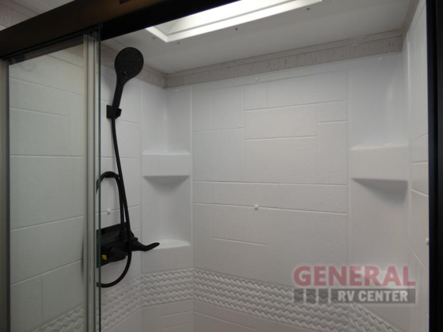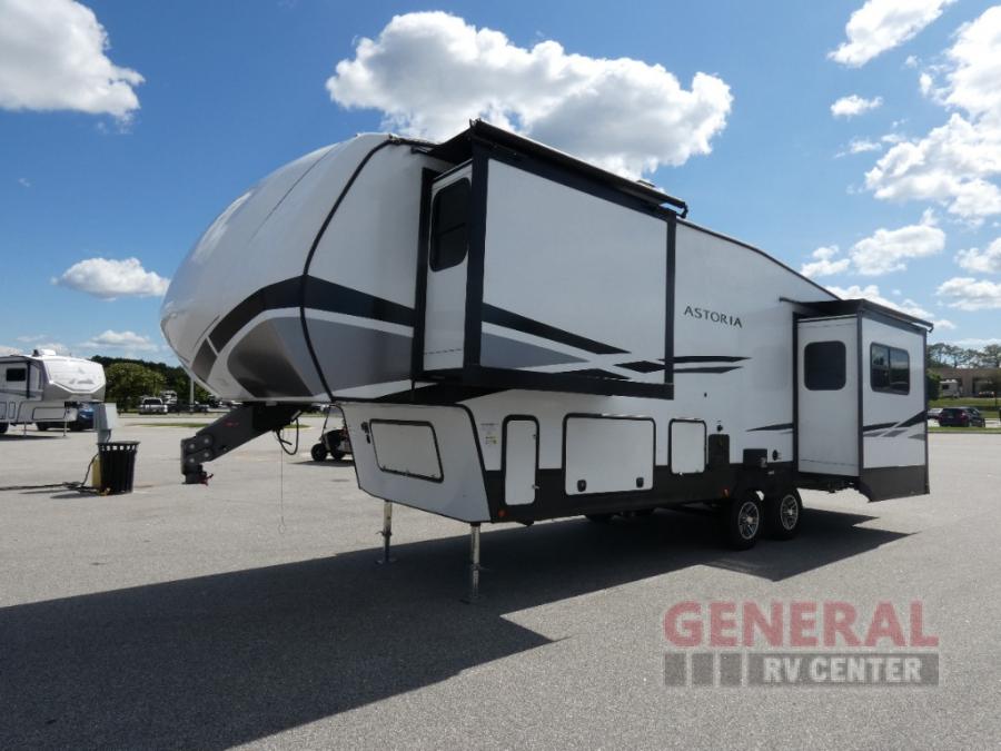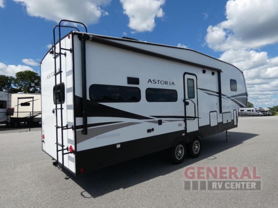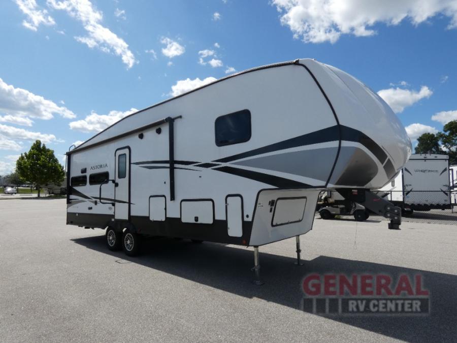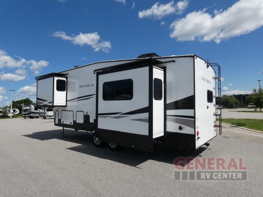Each one of these Dutchmen RV Astoria Half-Ton fifth wheels feature a fiberglass exterior for added durability and an All Weather Thermal Package so you can camp all year long! There are also Secure Stance entry steps, slam latch baggage doors, an outside shower port, and many more exterior conveniences. You'll enjoy a 200W solar panel for off-grid capabilities, a back up camera for easy parking, and a power awning with LED lights for an inviting outdoor space. The interior is designed with high-gloss acrylic backsplash, night shades throughout the living area, and slick black appliances. The 60,000 BTU tankless water heater will provide endless hot showers, and the dual ducted A/C will keep you cool all summer long.