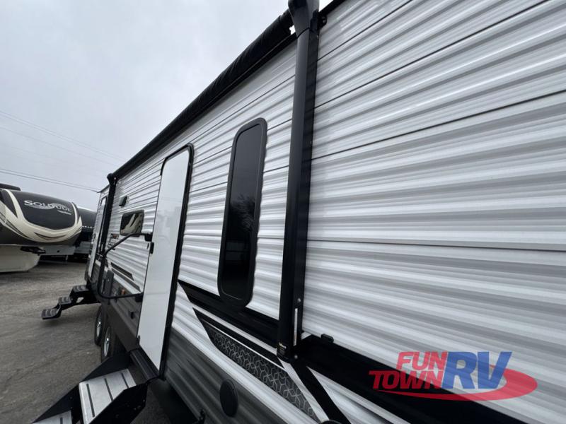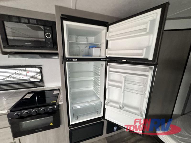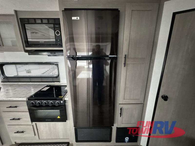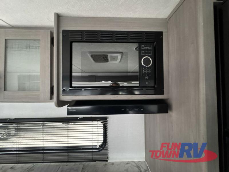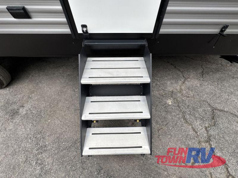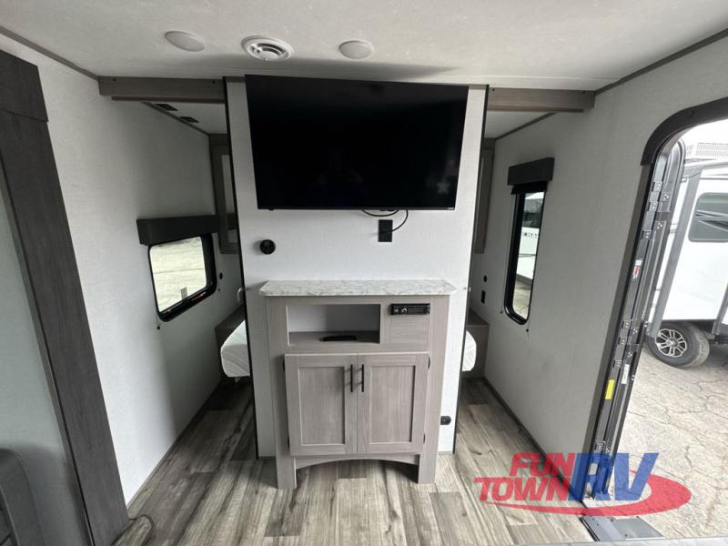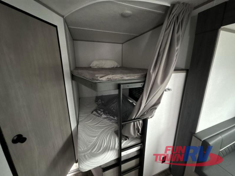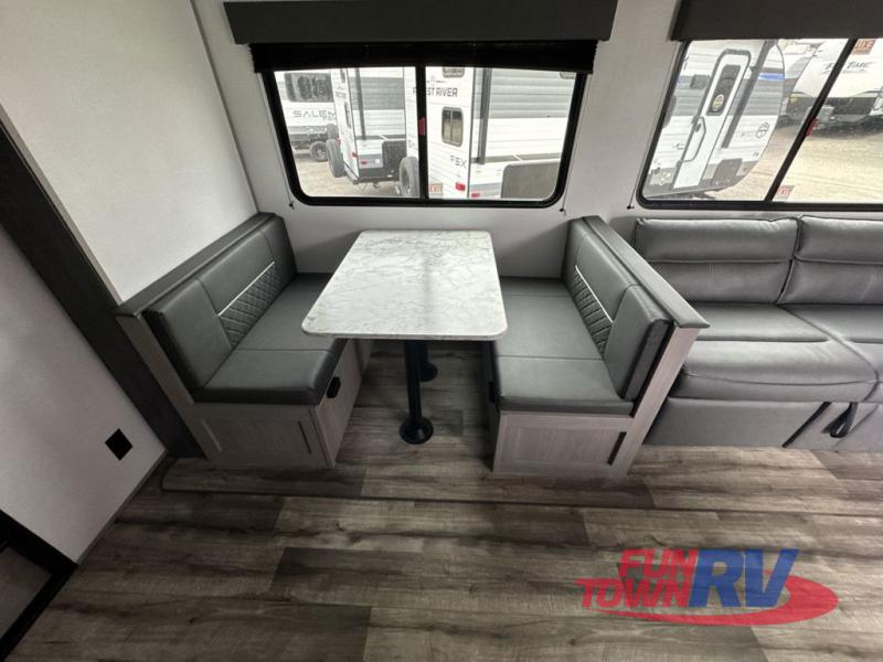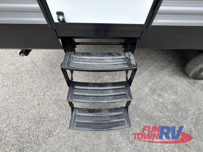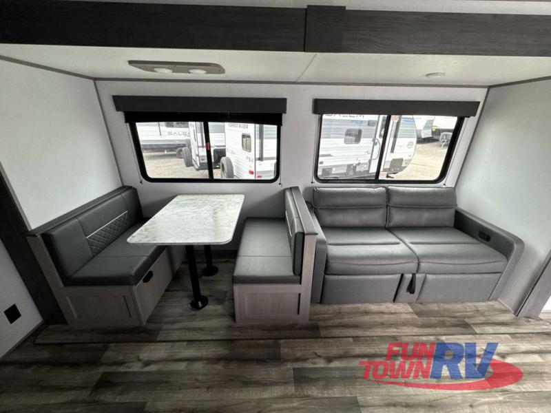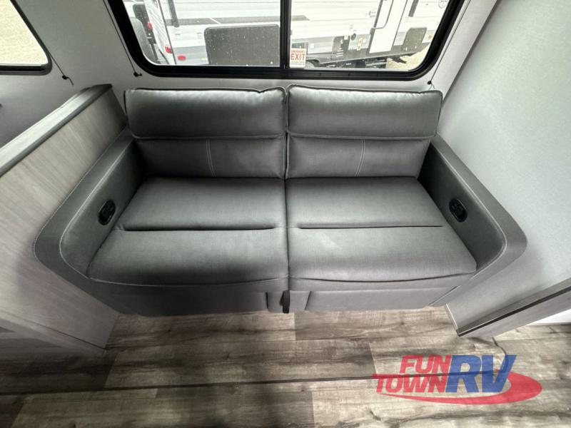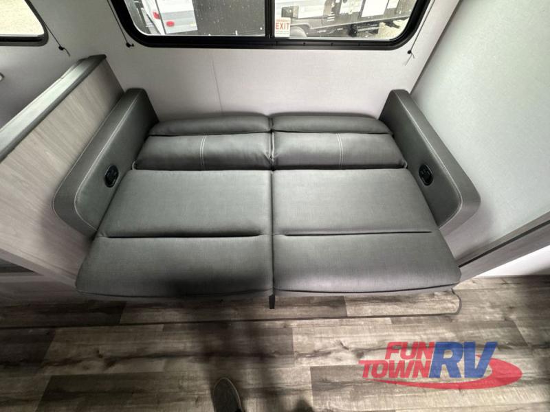 Camp comfortably with your larger group in this trailer that gives you privacy in the front bedroom with a queen bed and dual access, rear double-size bunks next to the full bathroom with the second entry/exit door to the trailer that is super convenient, and a furniture slide that includes a booth dinette and a reclining sofa that some will surely love sleeping on. The main area also includes a fireplace and kitchen appliances including a 10 cu. ft. refrigerator, a farm style sink with high rise faucet, and storage. There is more storage found outside in the pass-through compartment allowing you to take along the larger camping items like camp chairs and tables, charcoal and even fishing poles.