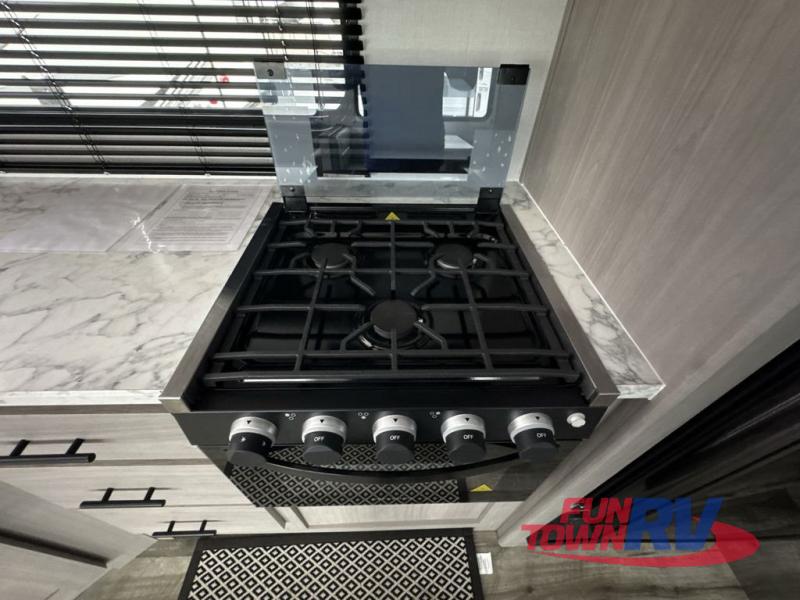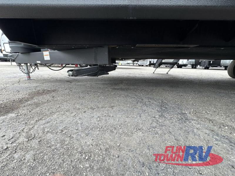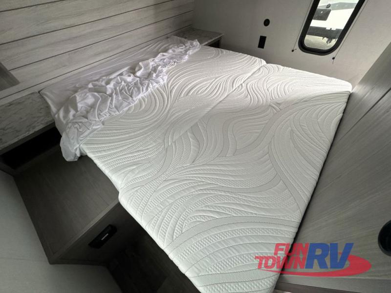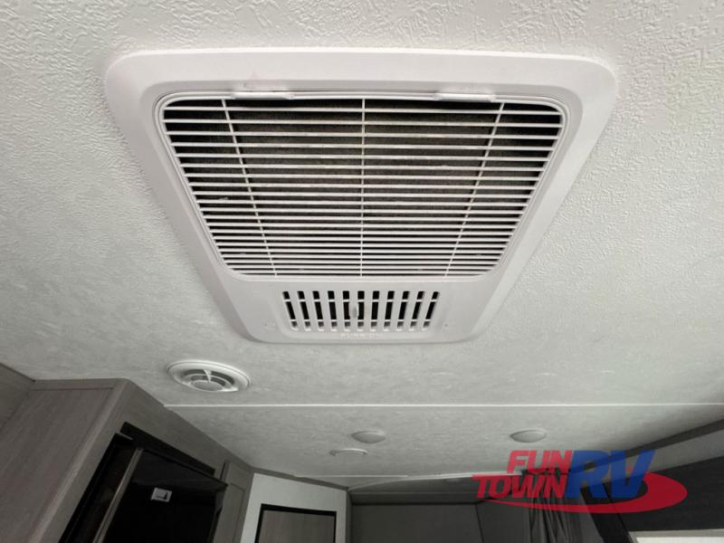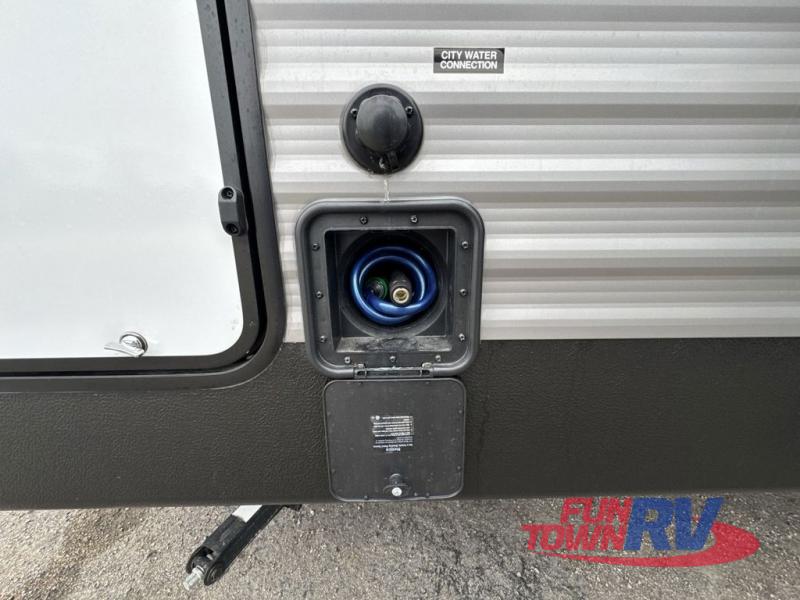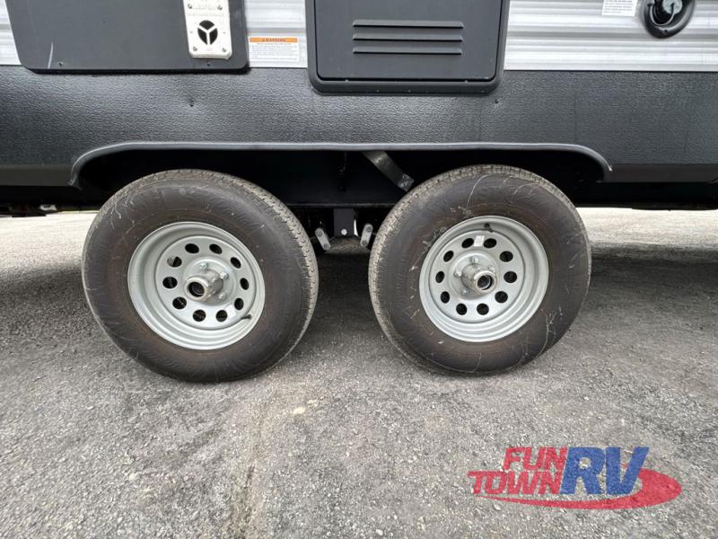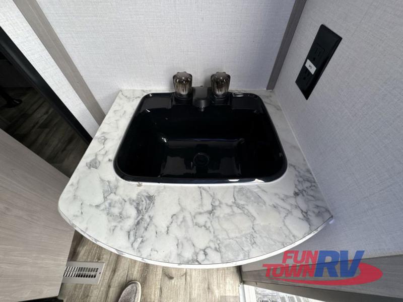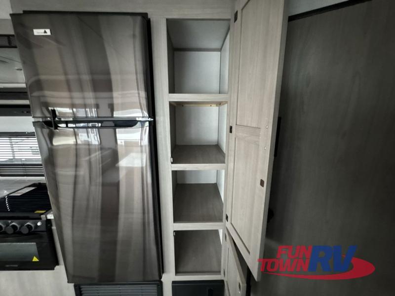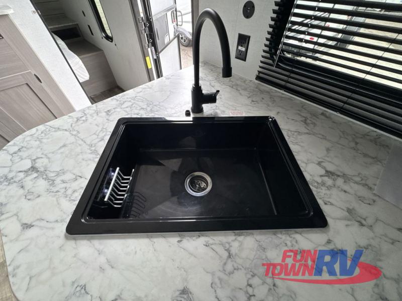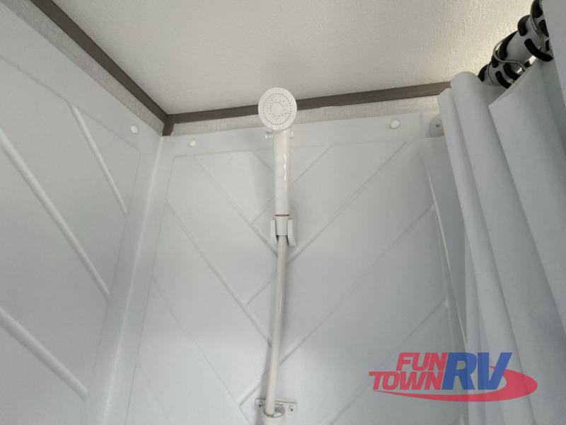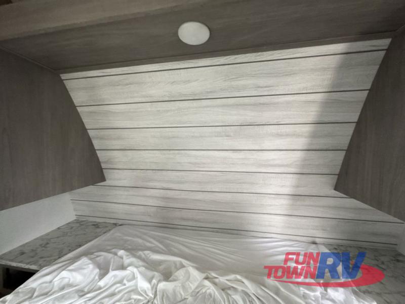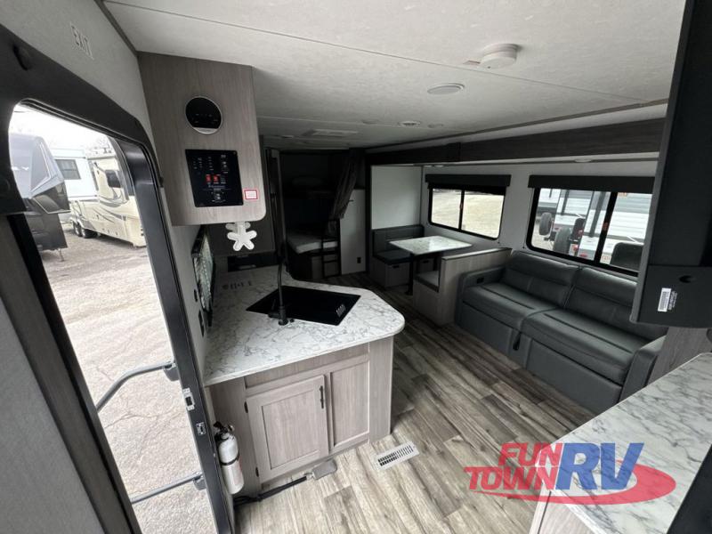 Camp comfortably with your larger group in this trailer that gives you privacy in the front bedroom with a queen bed and dual access, rear double-size bunks next to the full bathroom with the second entry/exit door to the trailer that is super convenient, and a furniture slide that includes a booth dinette and a reclining sofa that some will surely love sleeping on. The main area also includes a fireplace and kitchen appliances including a 10 cu. ft. refrigerator, a farm style sink with high rise faucet, and storage. There is more storage found outside in the pass-through compartment allowing you to take along the larger camping items like camp chairs and tables, charcoal and even fishing poles.