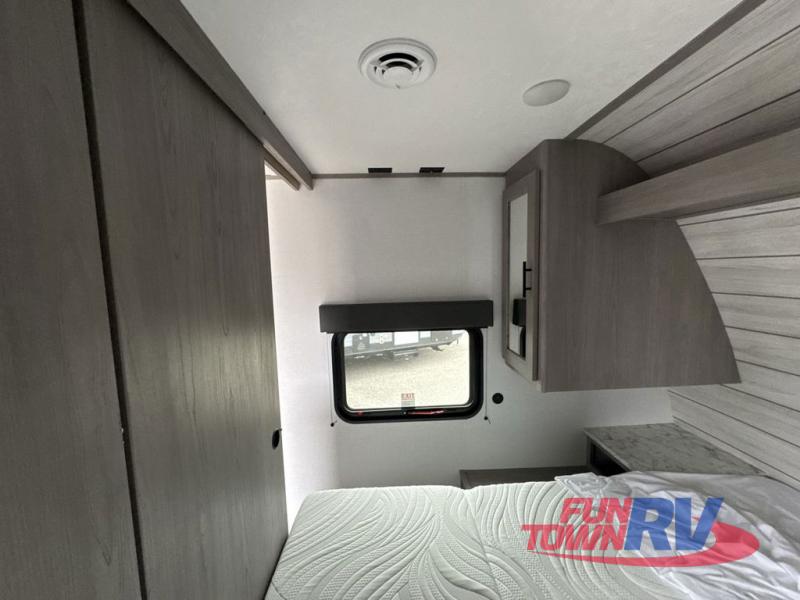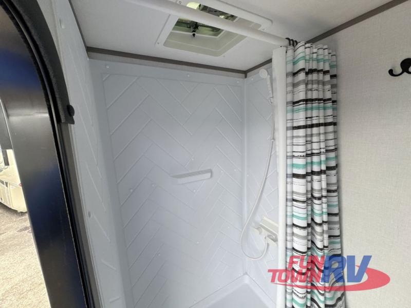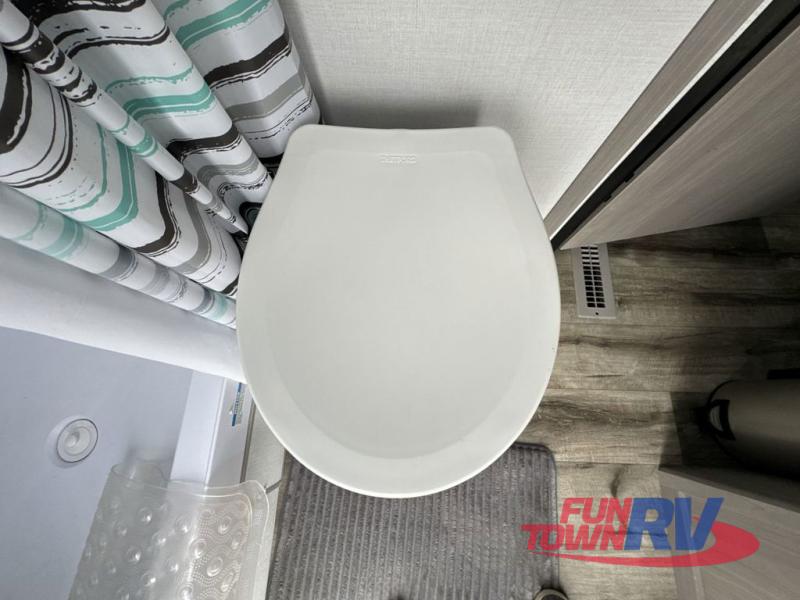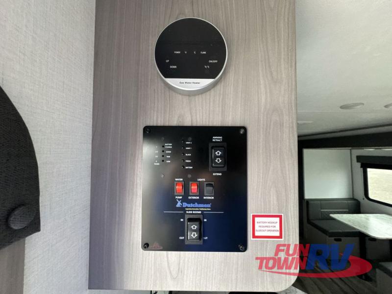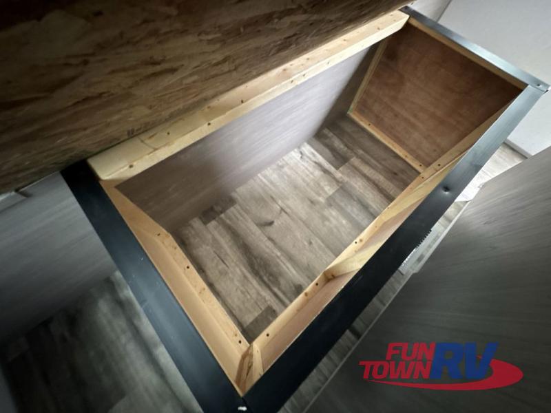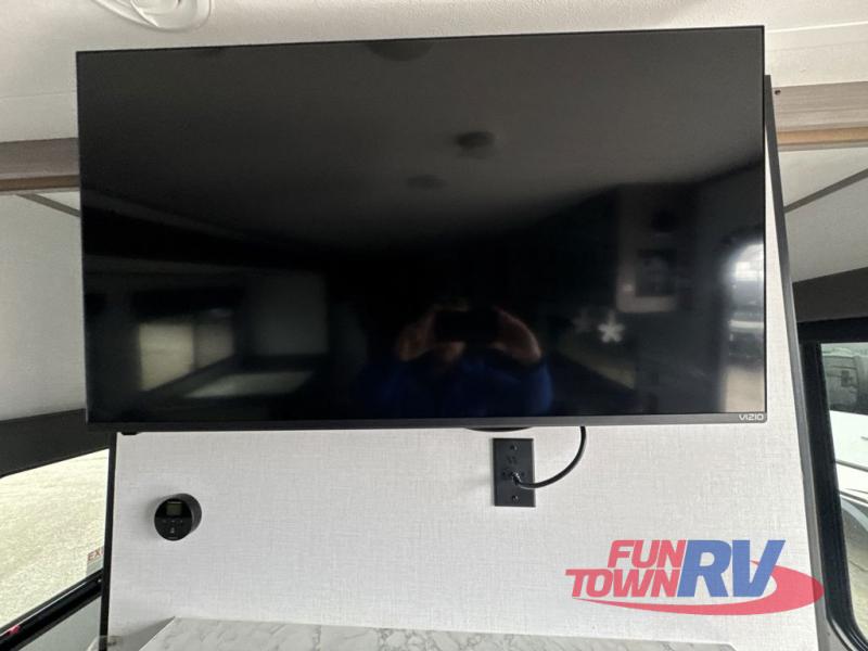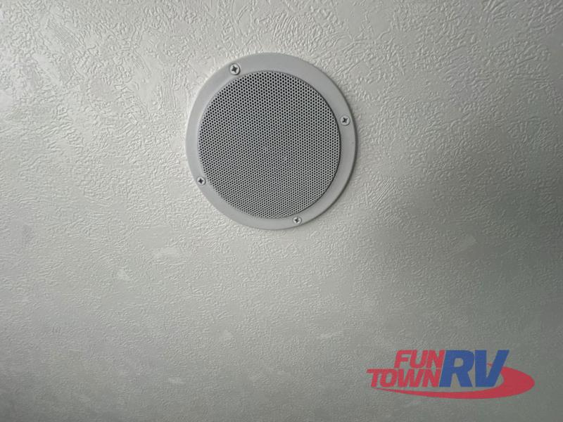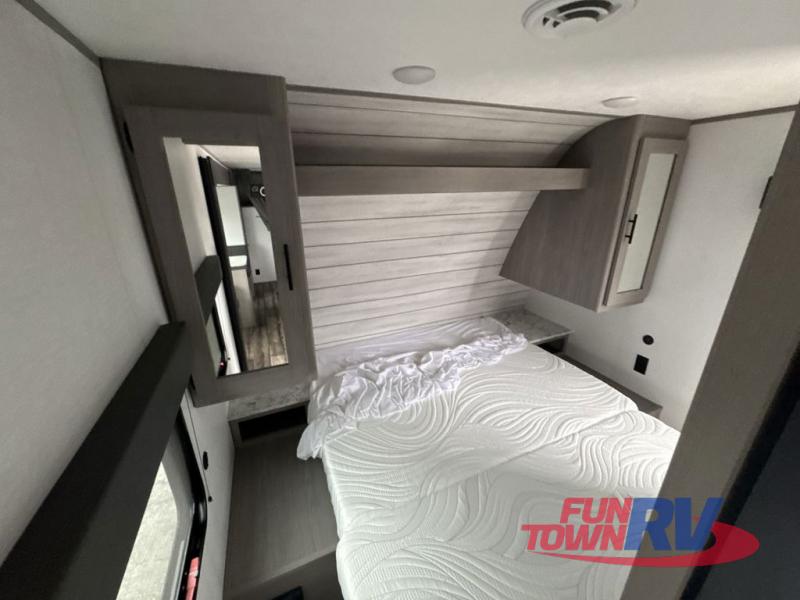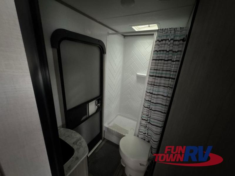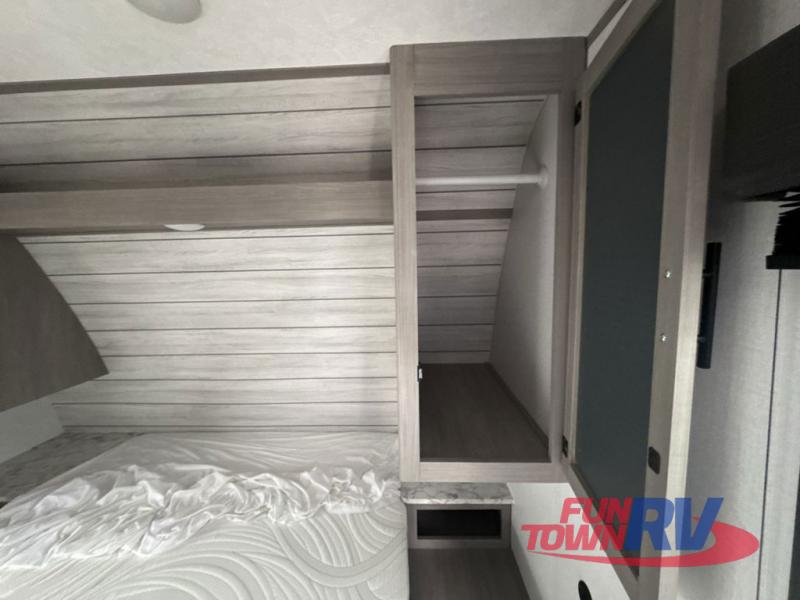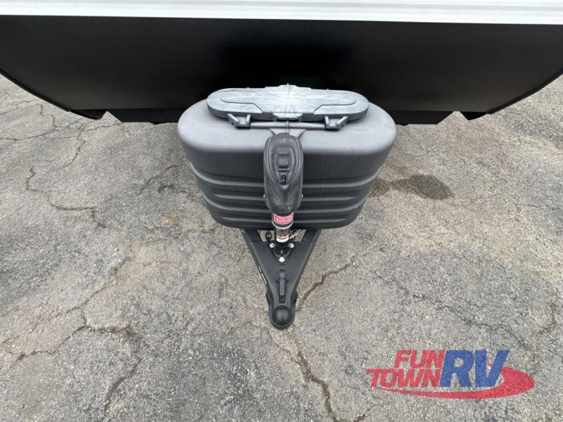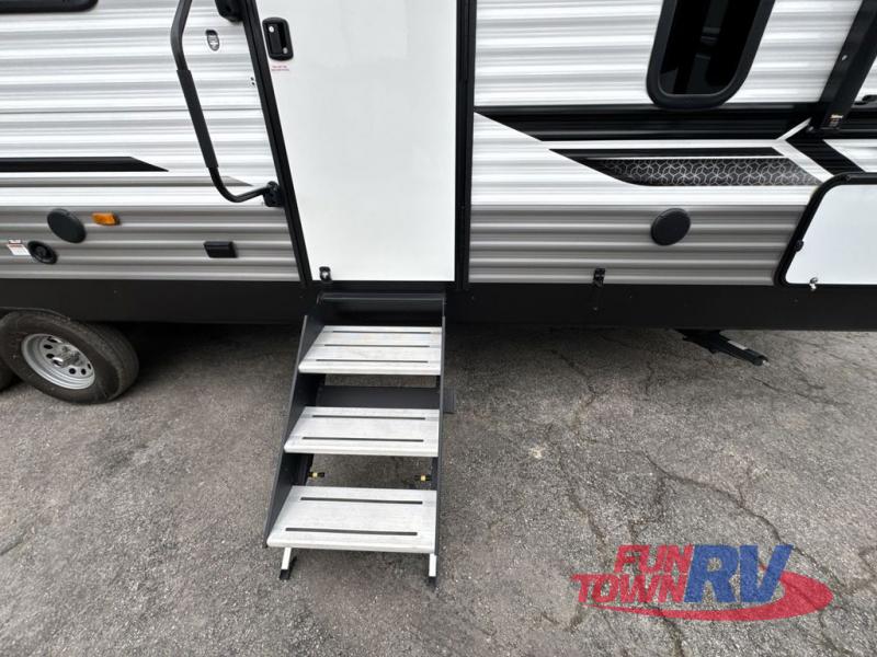 Camp comfortably with your larger group in this trailer that gives you privacy in the front bedroom with a queen bed and dual access, rear double-size bunks next to the full bathroom with the second entry/exit door to the trailer that is super convenient, and a furniture slide that includes a booth dinette and a reclining sofa that some will surely love sleeping on. The main area also includes a fireplace and kitchen appliances including a 10 cu. ft. refrigerator, a farm style sink with high rise faucet, and storage. There is more storage found outside in the pass-through compartment allowing you to take along the larger camping items like camp chairs and tables, charcoal and even fishing poles.