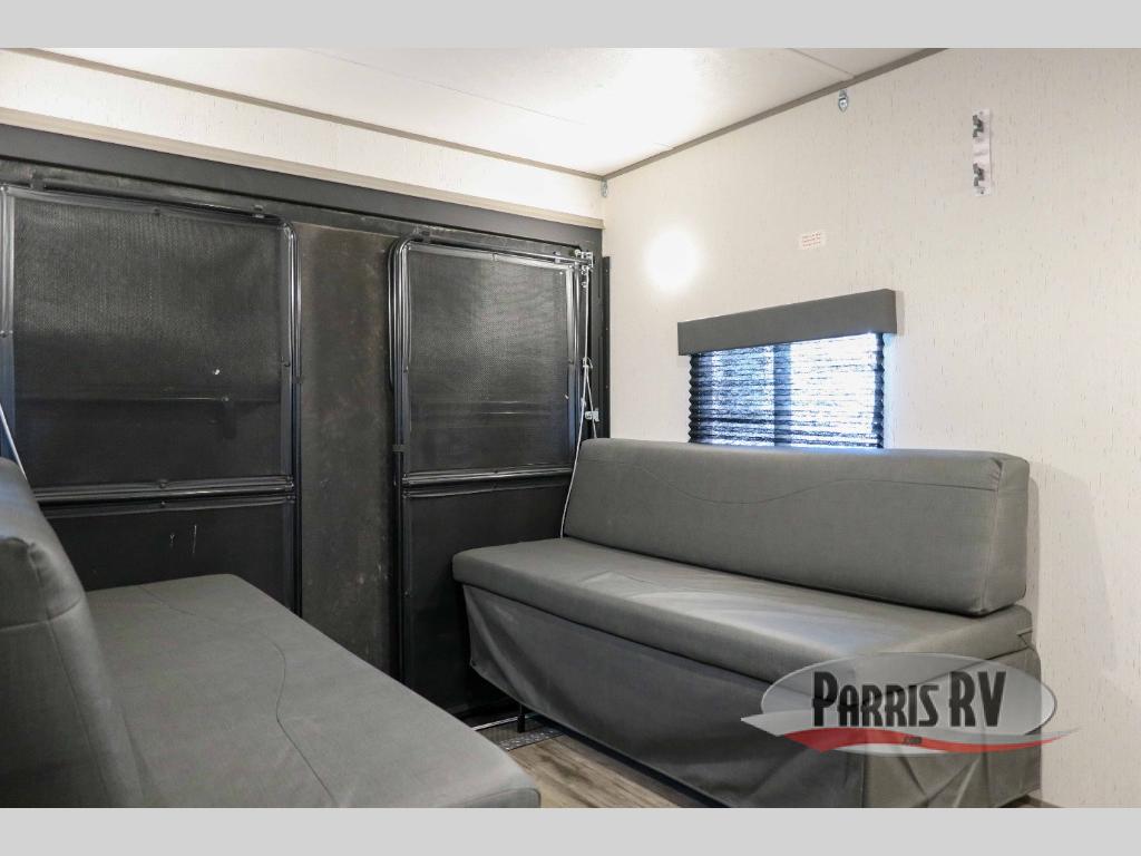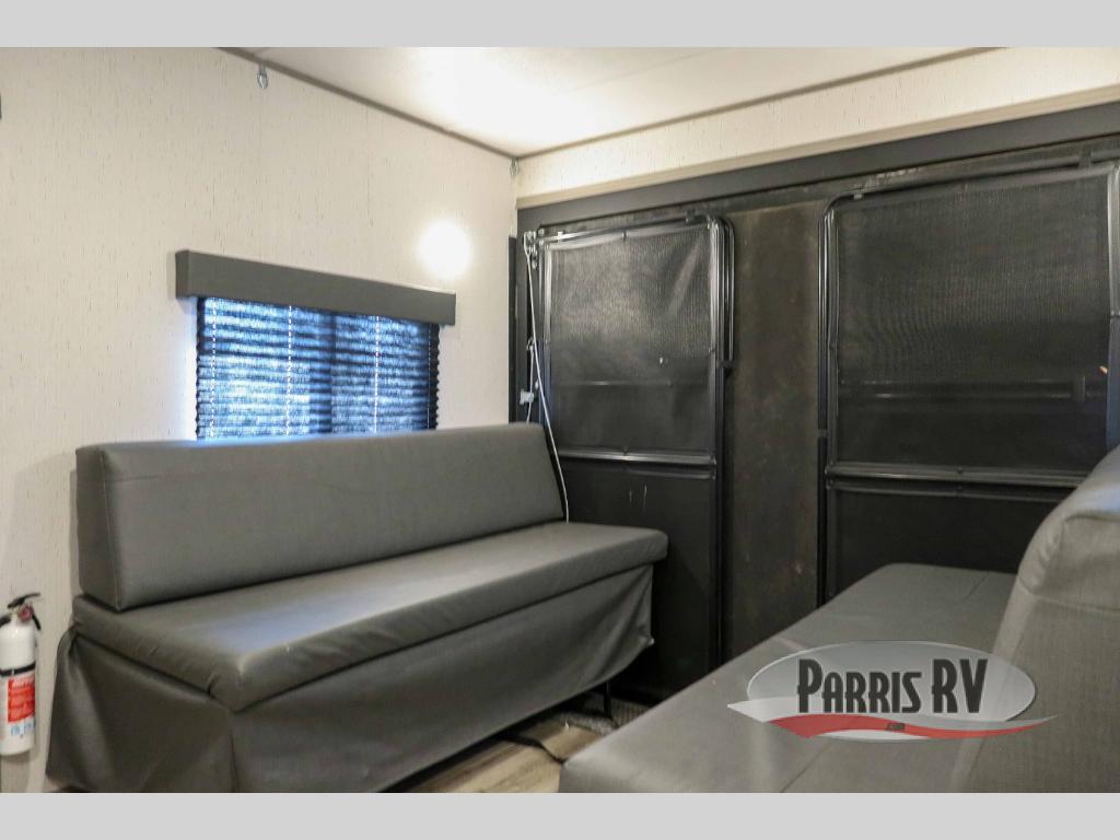 This trailer offers a separate cargo area for your toys and a separate living and kitchen area for you to relax and unwind after a fun ride! The 10' cargo space gives you a side man door to be able to check on your toys while traveling, two sofas with a table in between as well as an overhead bed so you can utilize this space as a second living/dining/bedroom once the toys have been unloaded. The walk-through bathroom gives you access from both the cargo area and the main area for convenience. And the kitchen provides full amenities including a 10 cu. ft. refrigerator, and a farm style sink with high rise faucet to easily keep all the dishes clean. And the front bedroom provides privacy when needed.