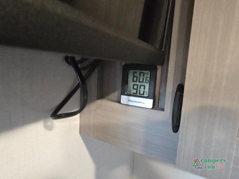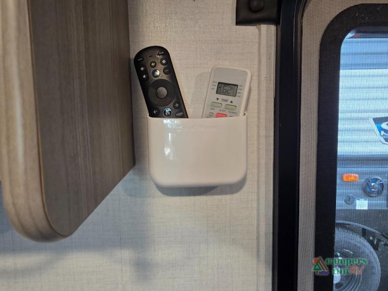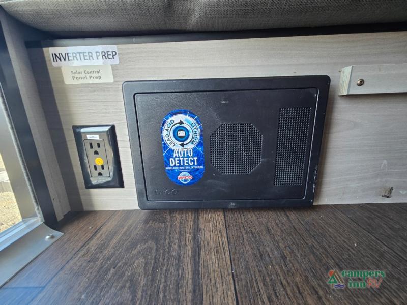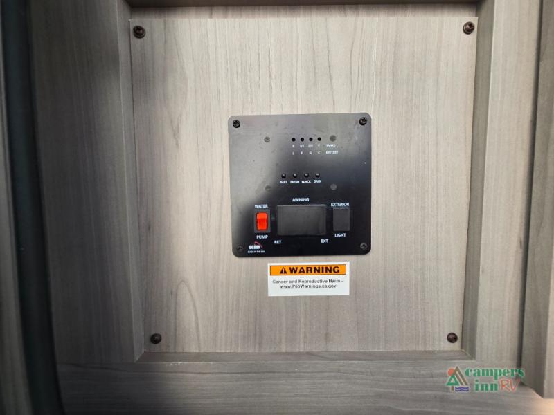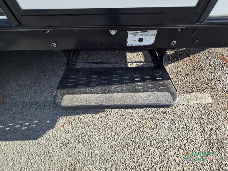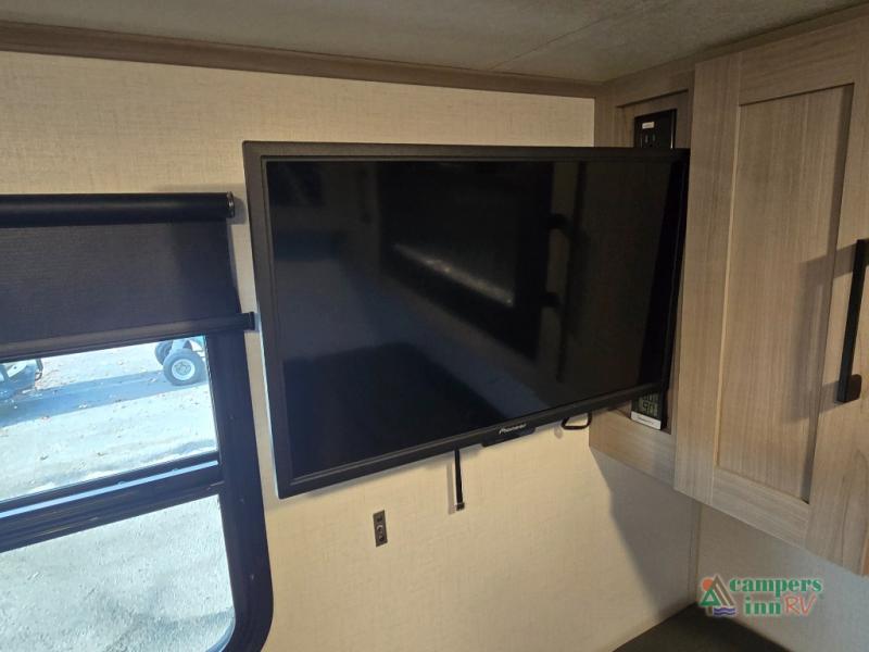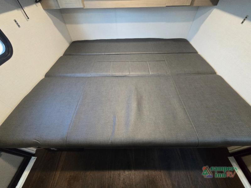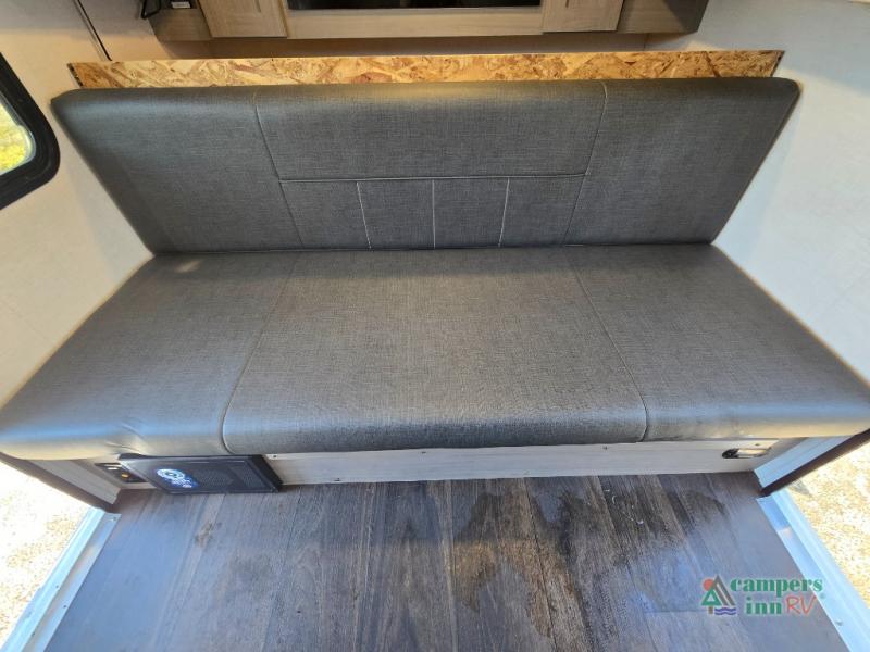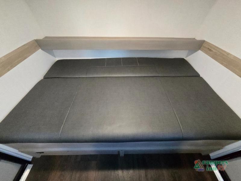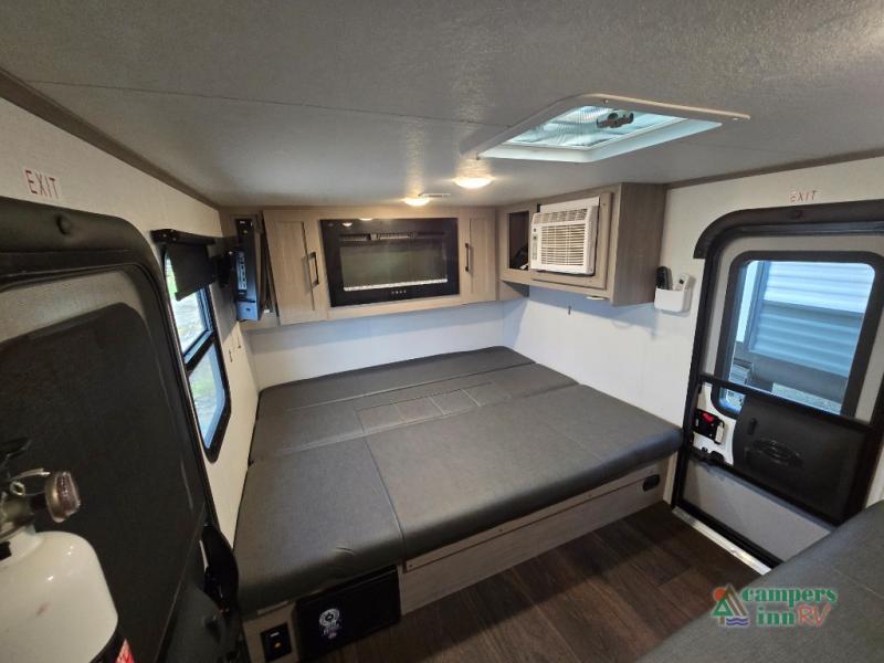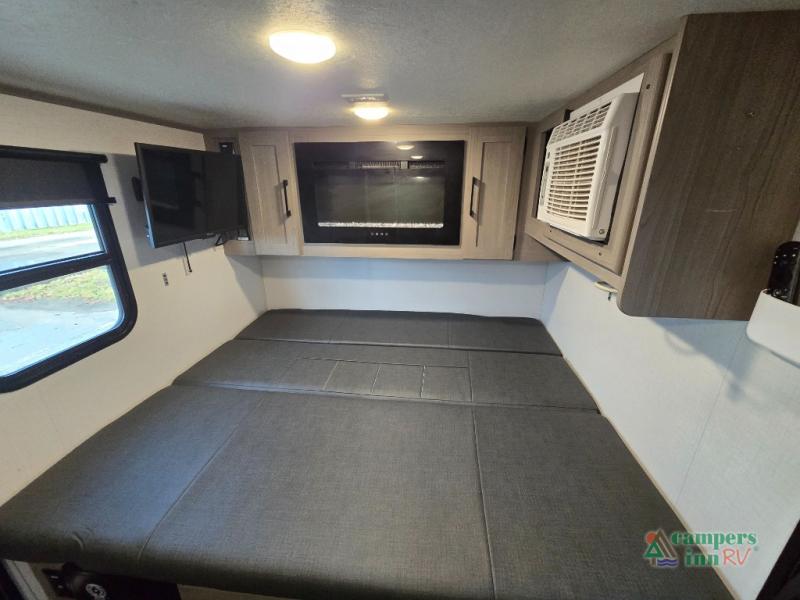 Step inside to find a cozy fireplace, a gaucho sofa that converts into a bed, and a dinette that doubles as additional sleeping space. A single front bunk gives kids or guests their own spot to rest, while dual entry doors make access convenient for everyone.