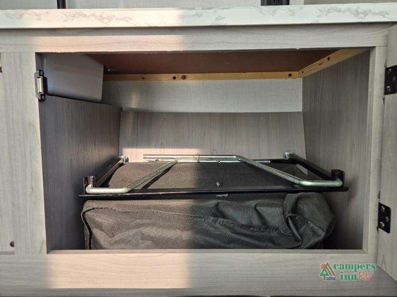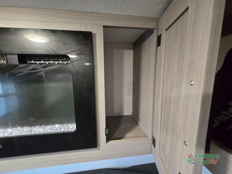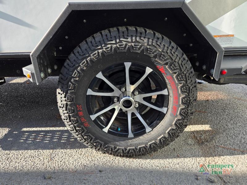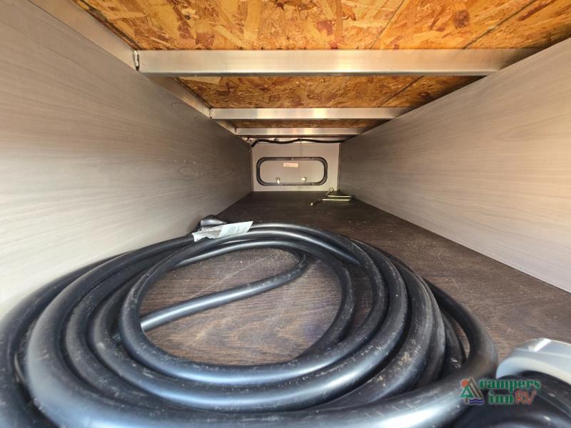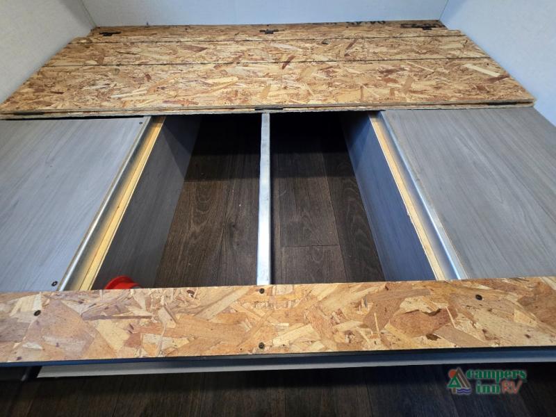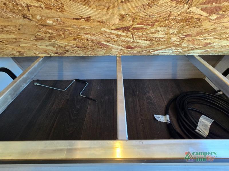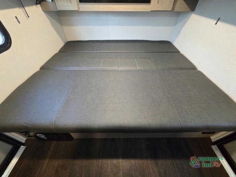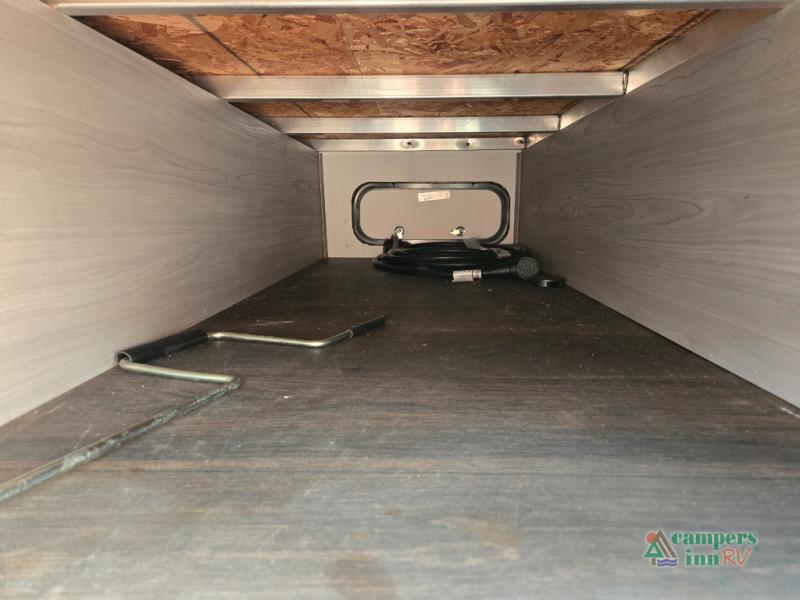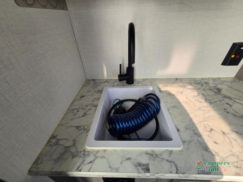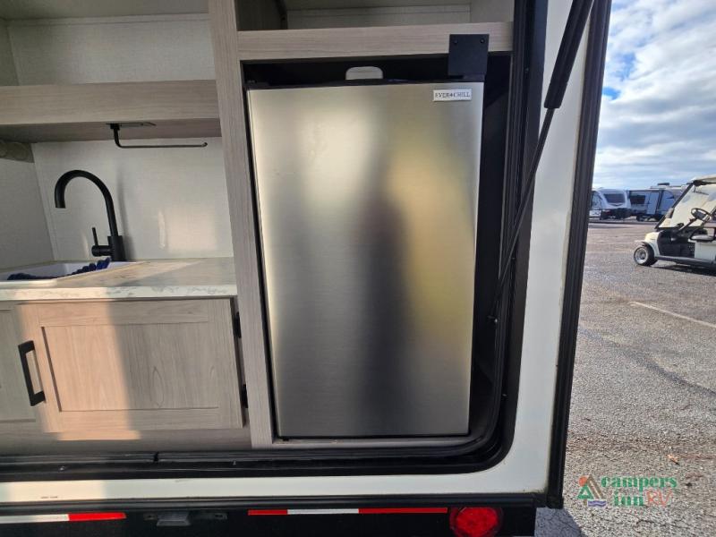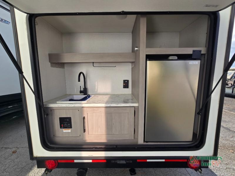 Cooking is a breeze with the rear hatch kitchen, featuring a sink, 3.3 cu. ft. 12V refrigerator, storage shelves, and exterior griddle for those sizzling outdoor meals.