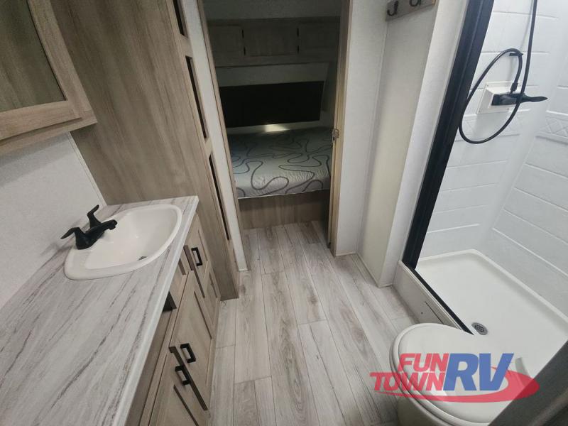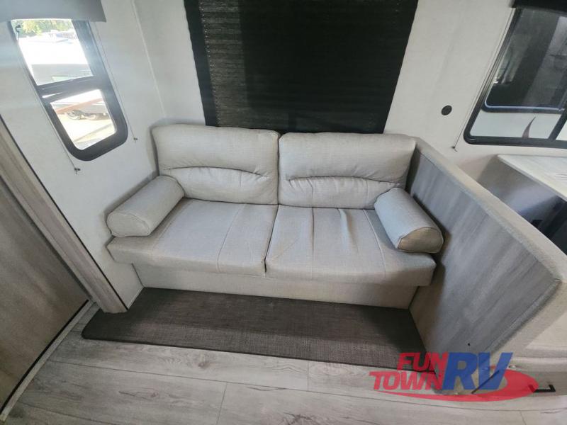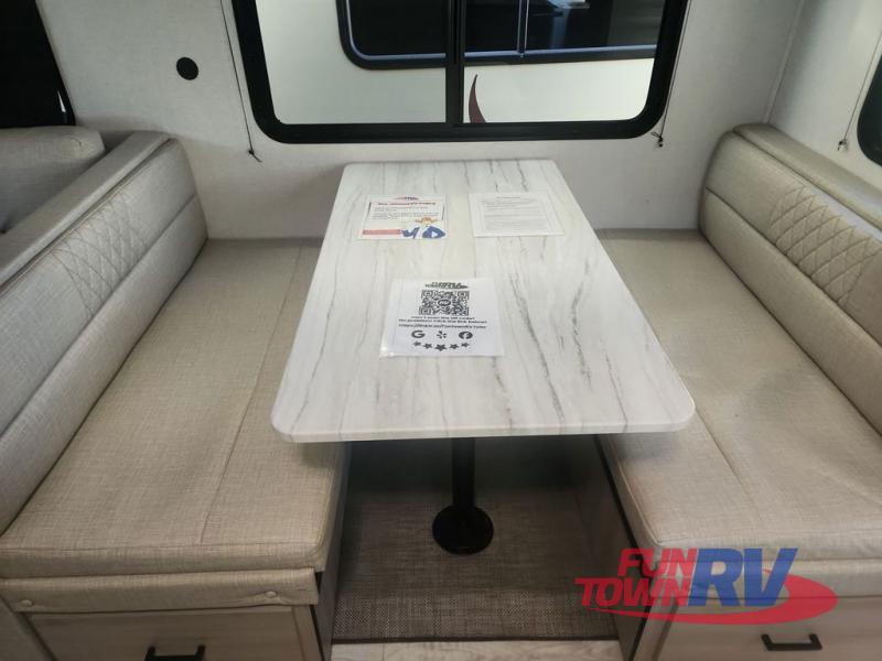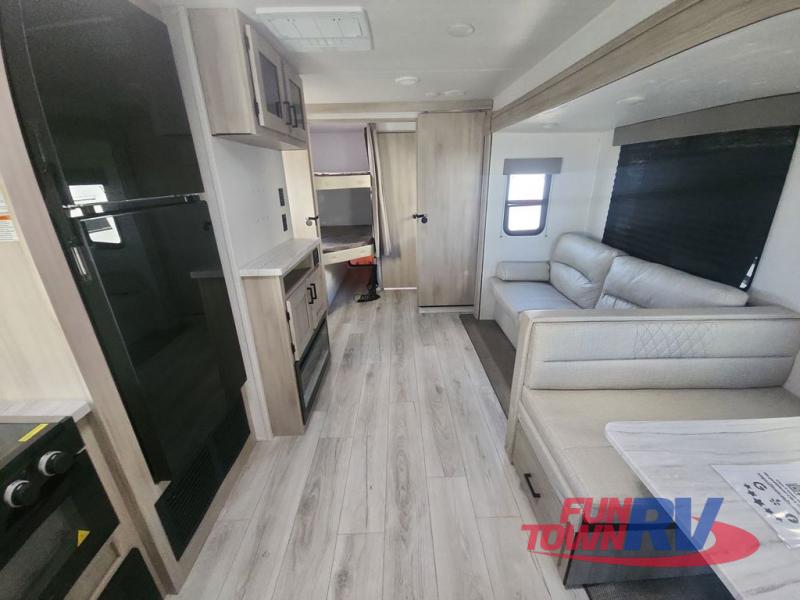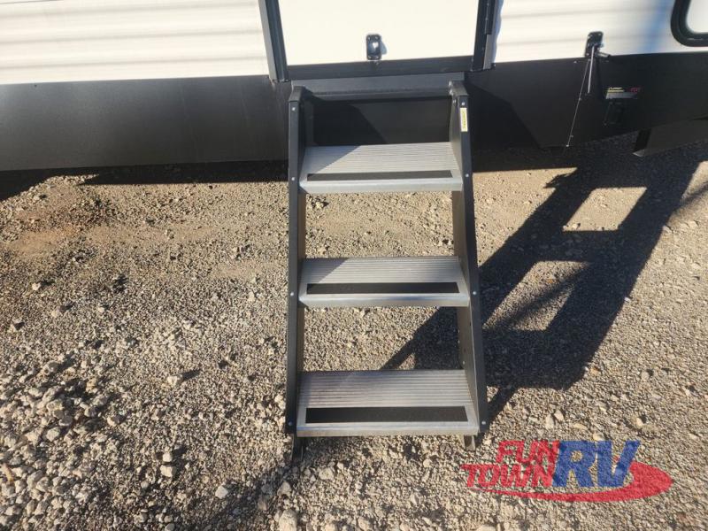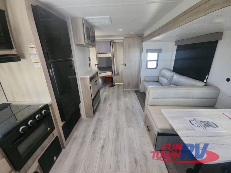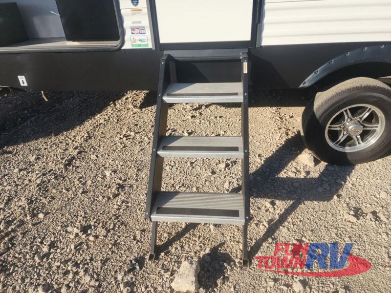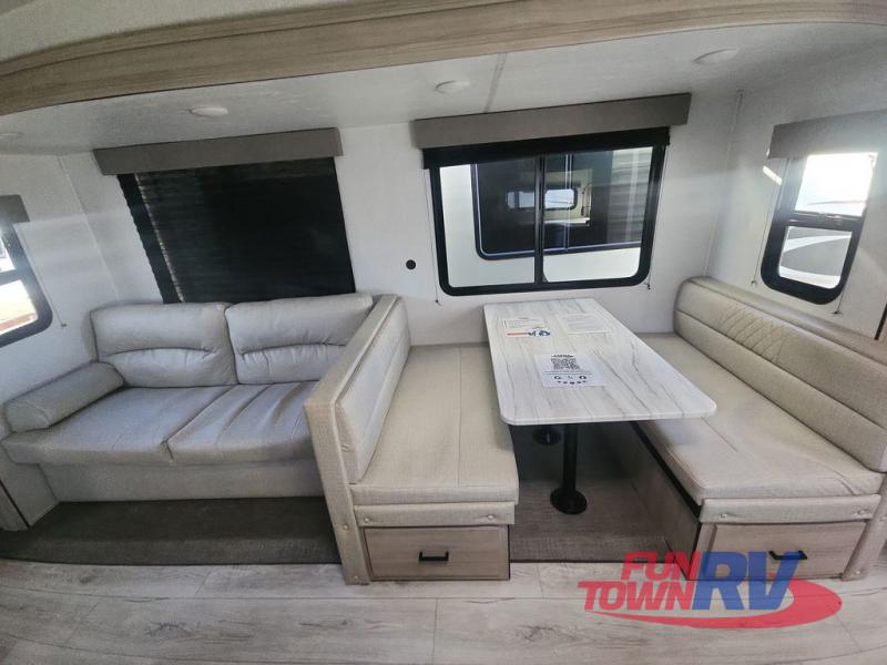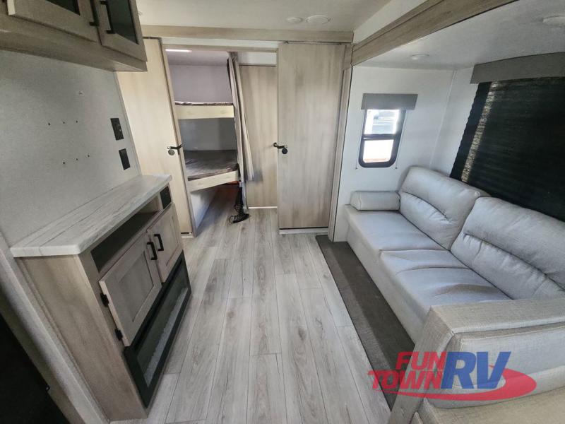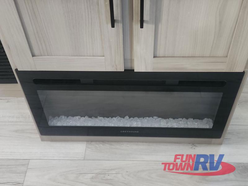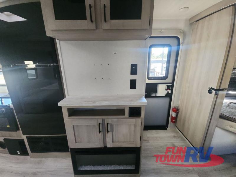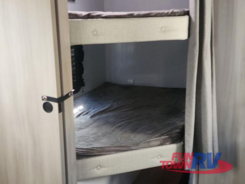 Load up the family, clothes, gear and food, and head out for a fun long-weekend at your local state park! As you easily load through the dual entry doors, you will find lots of storage throughout in the dual wardrobes in the private bedroom and bunkroom, underneath the booth dinette, within the overhead cabinets, plus the exterior pass-through storage allows you to bring along larger items and outdoor games and gear. You will sleep like a royalty in your private bedroom up front while the rest of the family enjoys the double-size bunks, a jack knife sofa, and even the dinette once easily setup for nighttime. You'll enjoy several more conveniences such as a full and half bath, a fireplace underneath the entertainment center, and loads of storage both inside and out.
