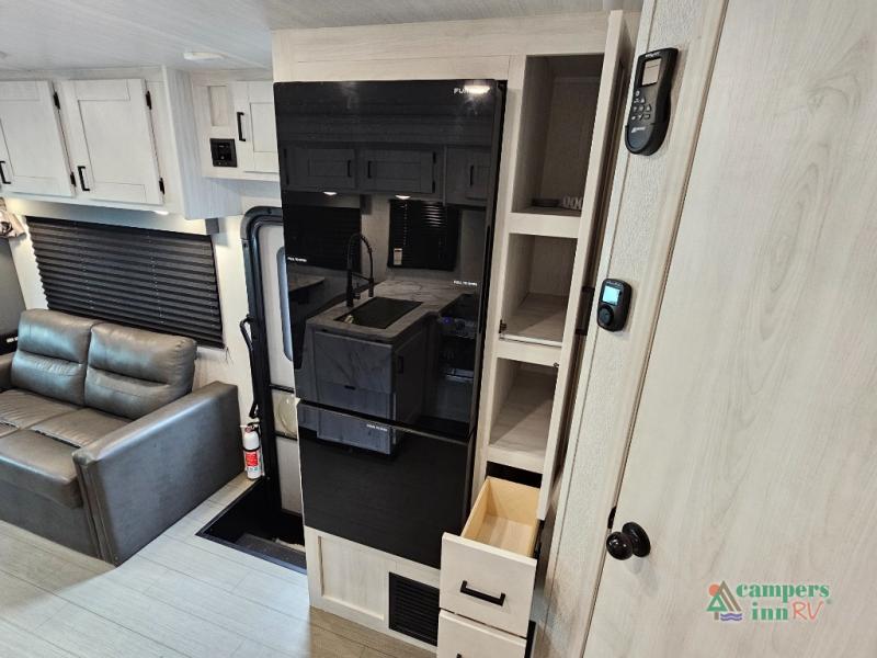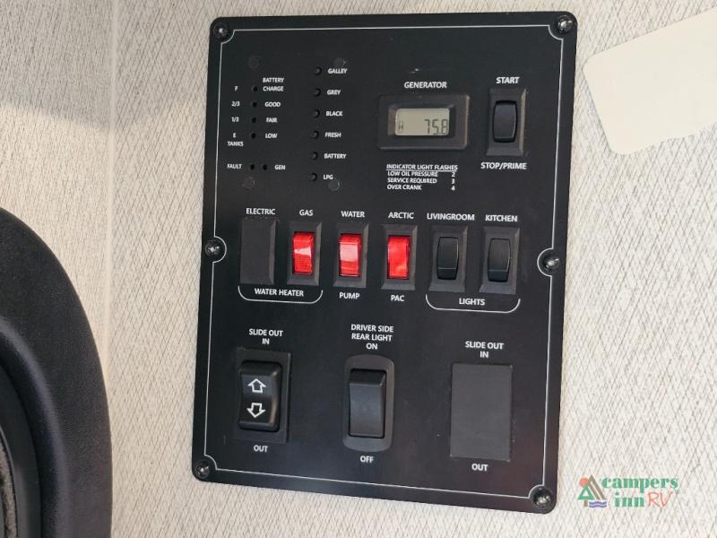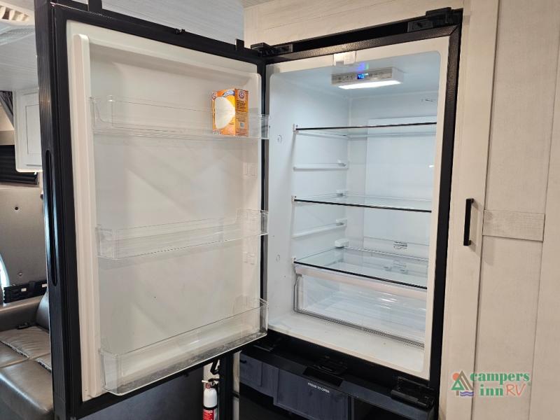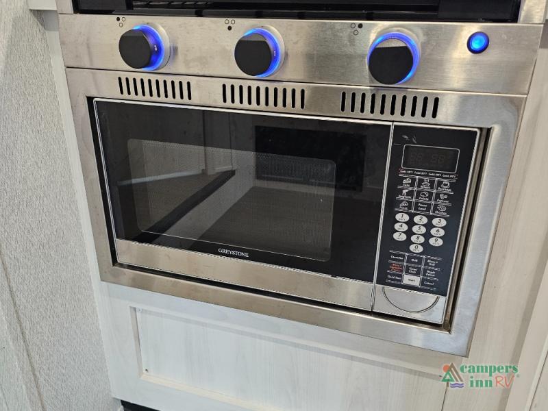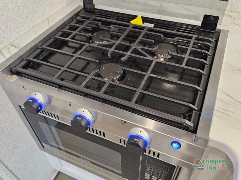Fully equipped with a microwave, 3-burner cooktop, and 12V 6 cu. ft. refrigerator.