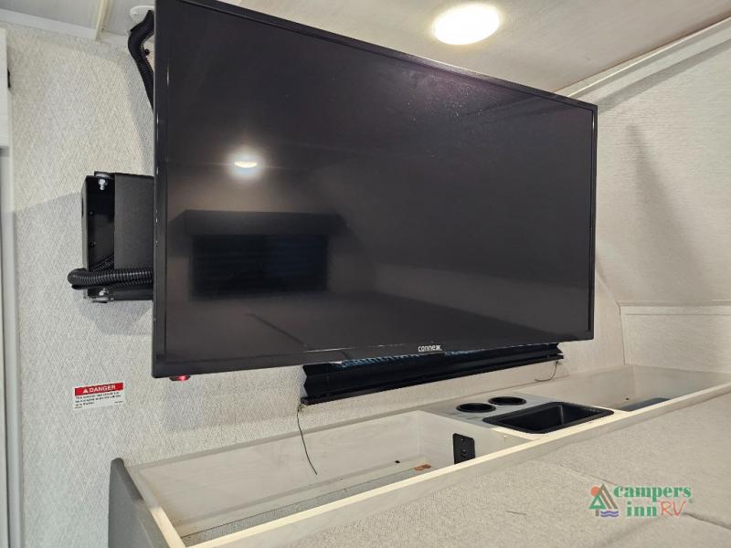 40" 12V LED swing-arm TV positioned above the cab for easy viewing from multiple angles.