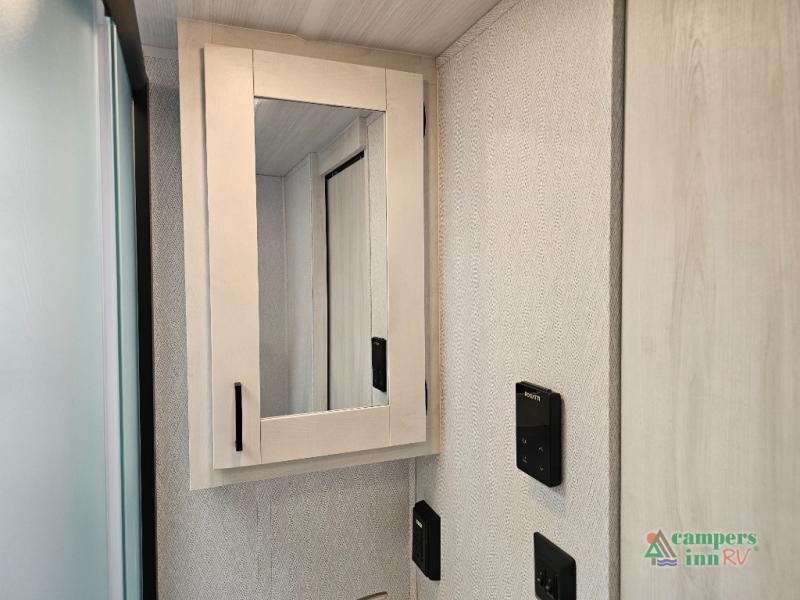Includes a full shower, toilet, sink, and medicine cabinet for convenience.