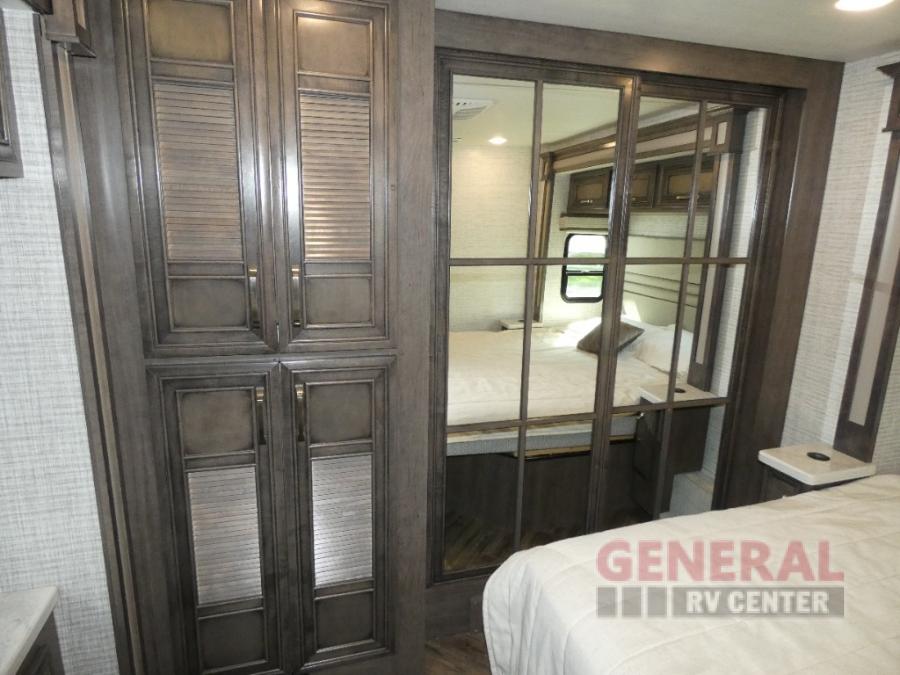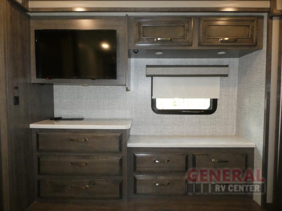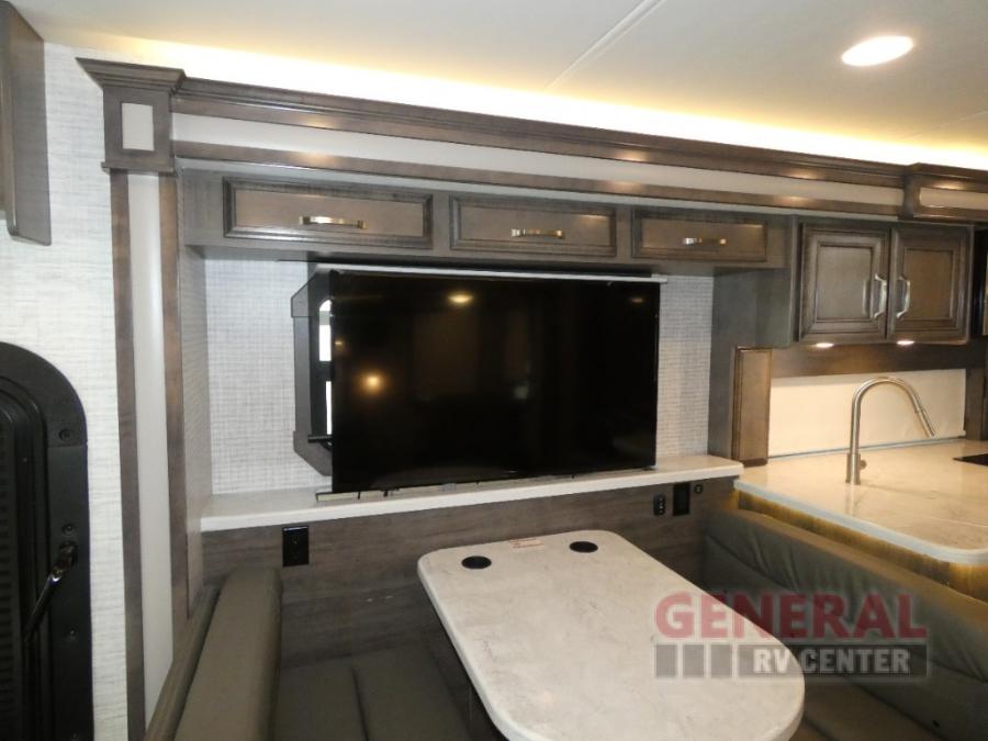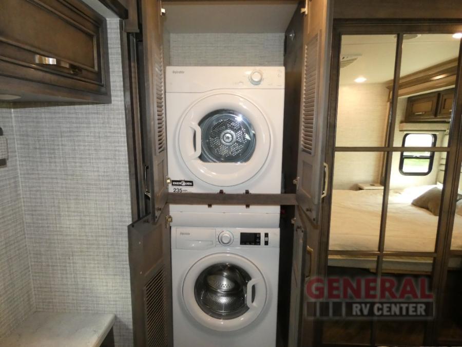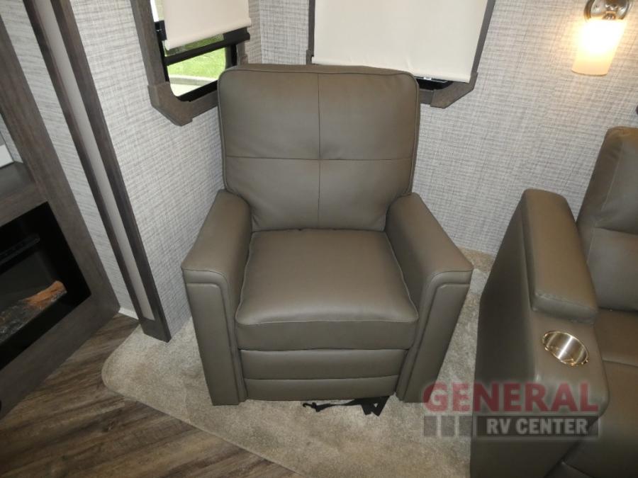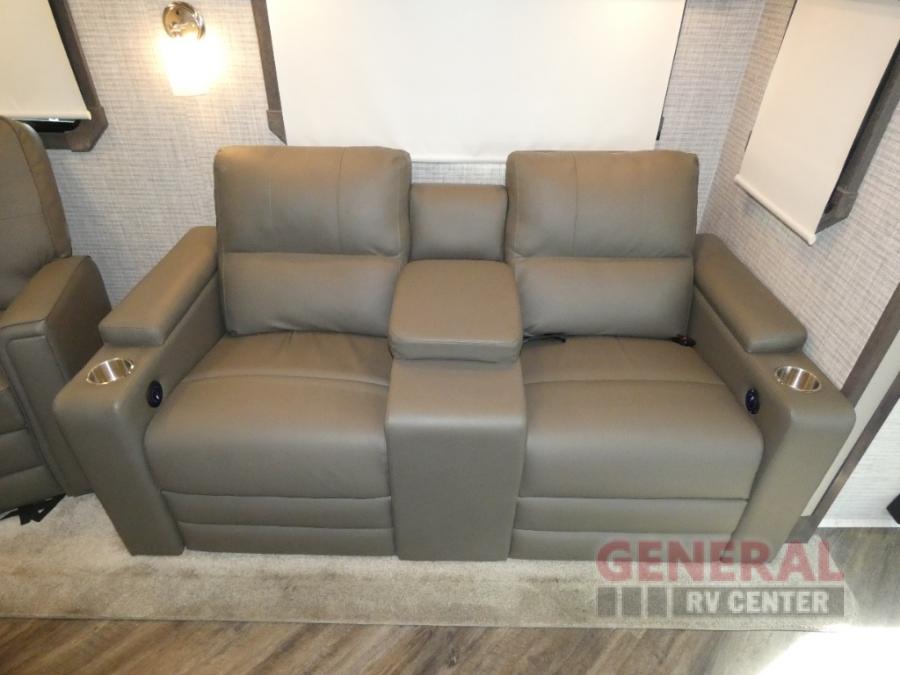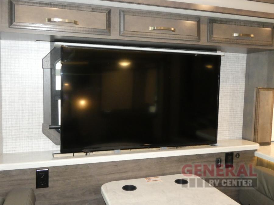 When you are ready to hit the road, load up your clothing in the rear bedroom with a wardrobe and a closet with stackable washer/dryer. There is also a dresser with drawers and an LED HD Smart TV to watch movies in bed. In the kitchen, your snacks and dry goods can be placed in the pantry next to the residential refrigerator. There is a medicine cabinet in the full bathroom and extra counter space for toiletries once you reach your destination. The full wall slide offers lots of floor space, plus the two additional slides give you even more in the bedroom and living area. You can dine and relax at the booth dinette, the theater seats and/or the recliner while watching your 50" Smart HDTV on a lift. The driver and passenger seats swivel for more seating.