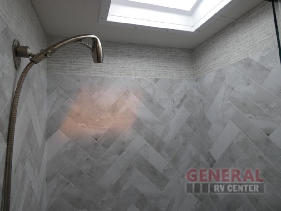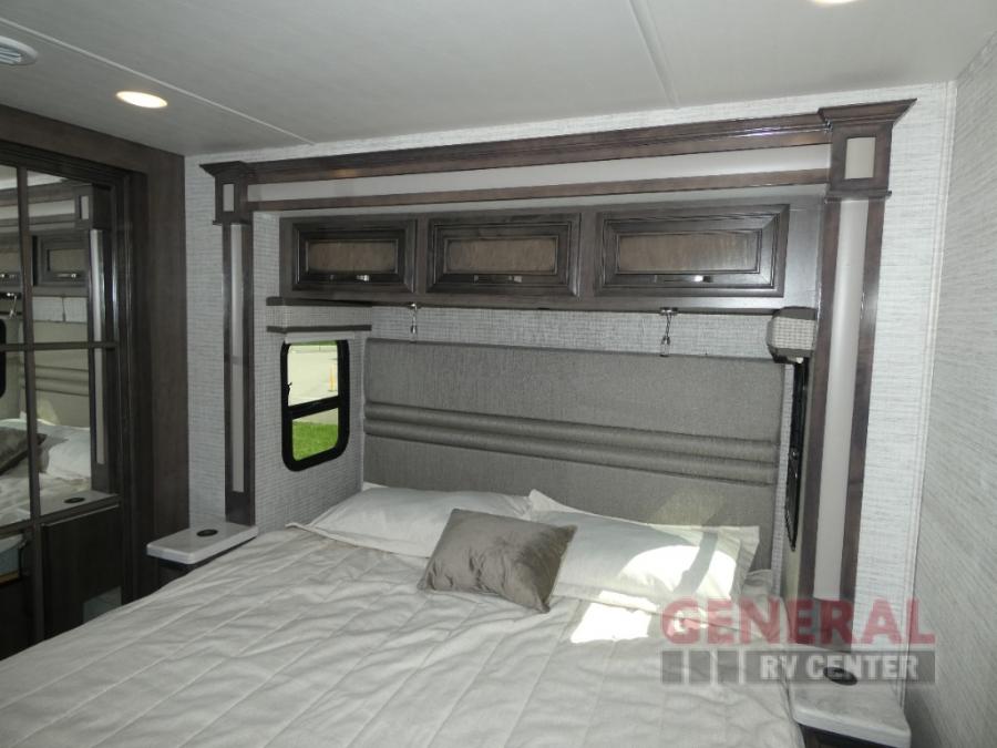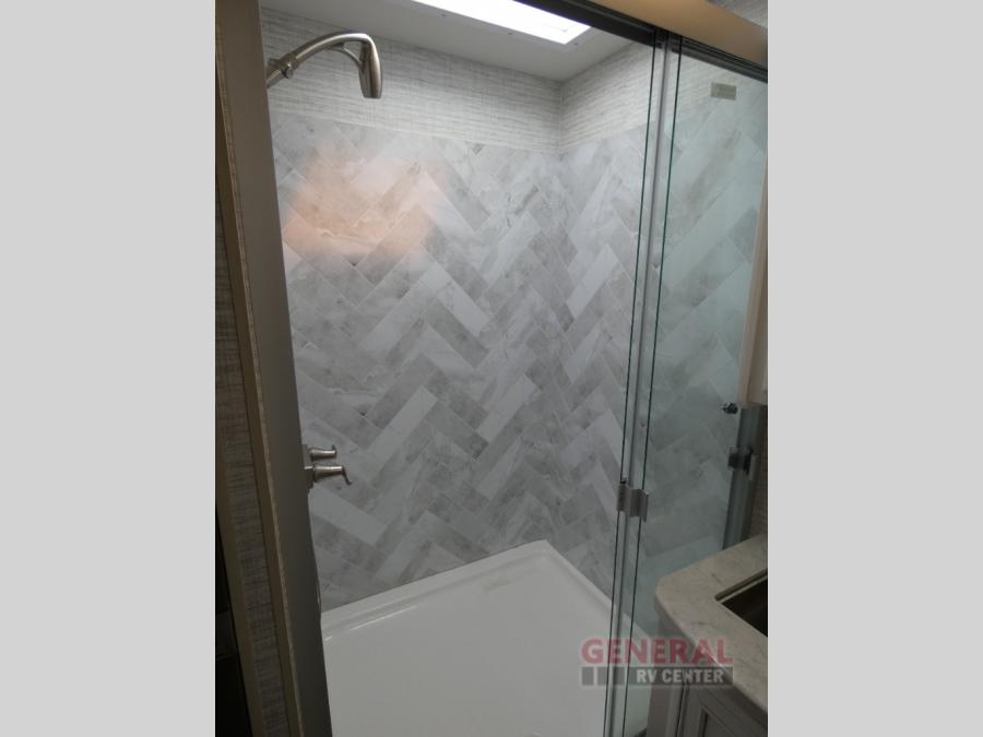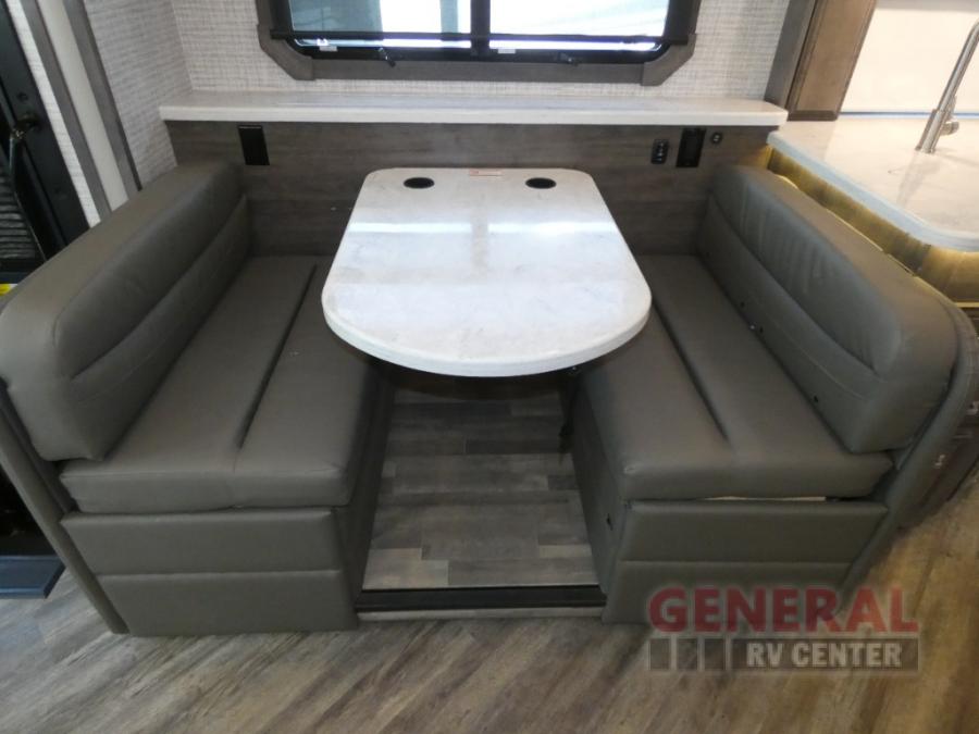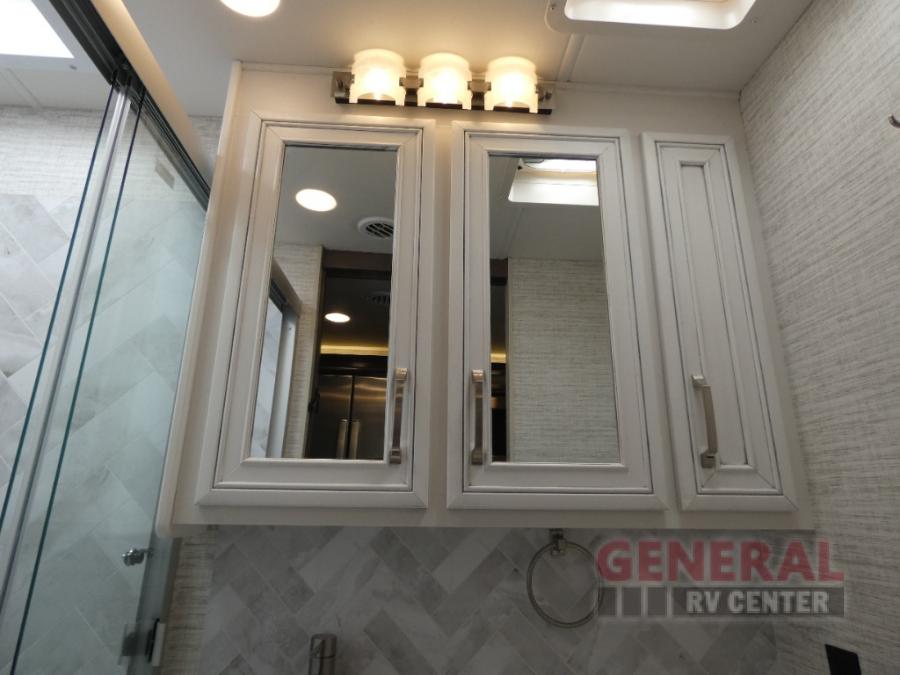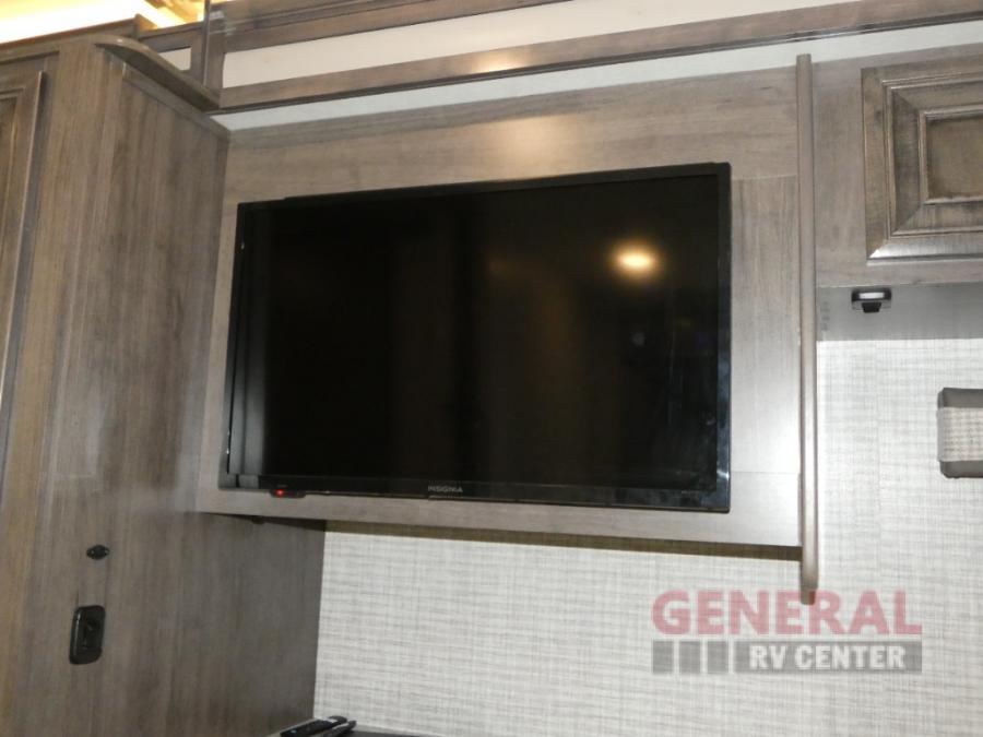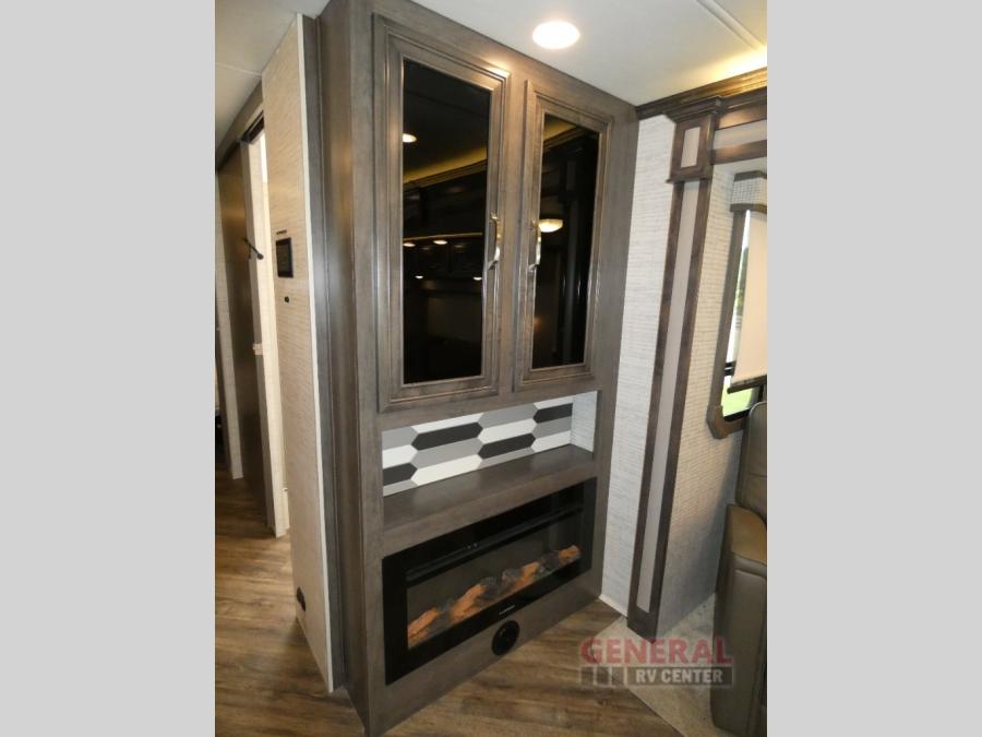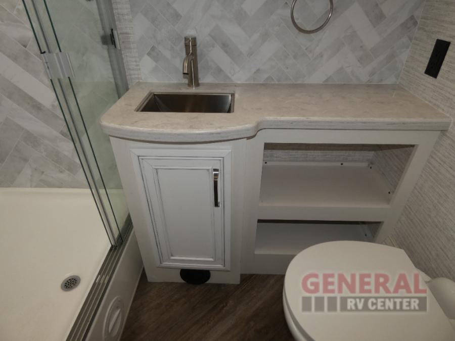 When you are ready to hit the road, load up your clothing in the rear bedroom with a wardrobe and a closet with stackable washer/dryer. There is also a dresser with drawers and an LED HD Smart TV to watch movies in bed. In the kitchen, your snacks and dry goods can be placed in the pantry next to the residential refrigerator. There is a medicine cabinet in the full bathroom and extra counter space for toiletries once you reach your destination. The full wall slide offers lots of floor space, plus the two additional slides give you even more in the bedroom and living area. You can dine and relax at the booth dinette, the theater seats and/or the recliner while watching your 50" Smart HDTV on a lift. The driver and passenger seats swivel for more seating.