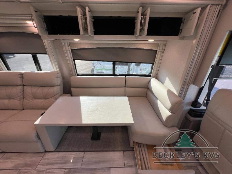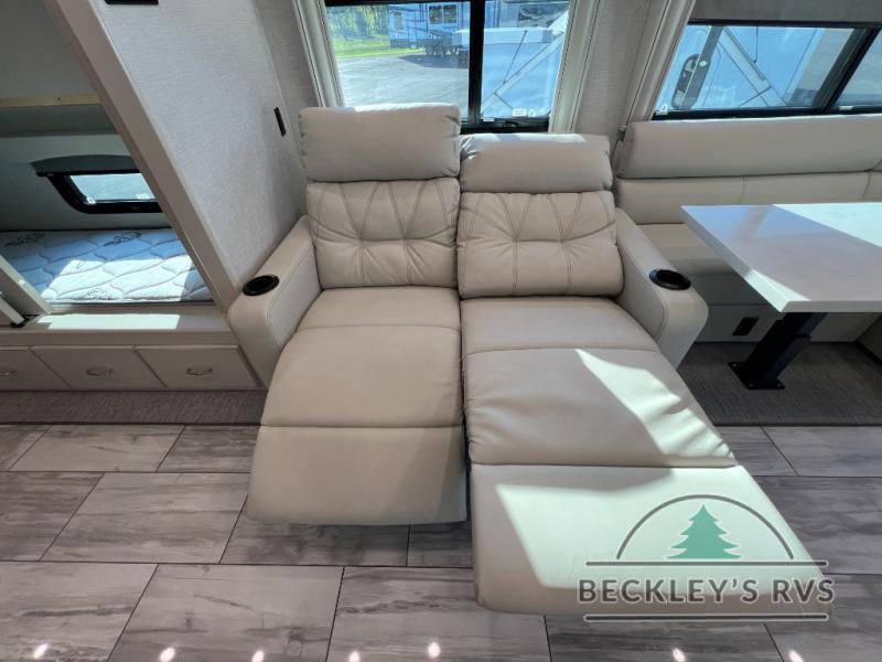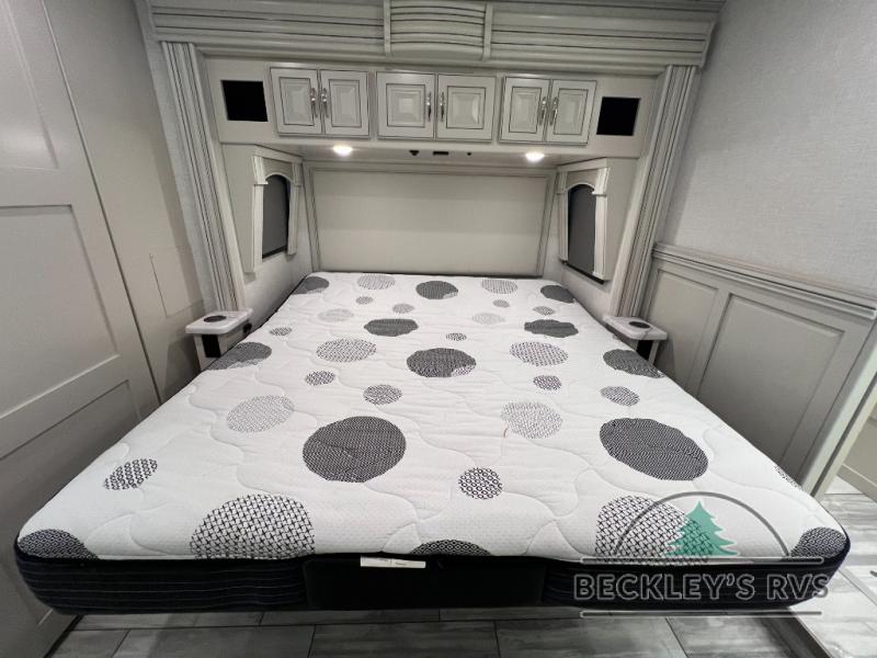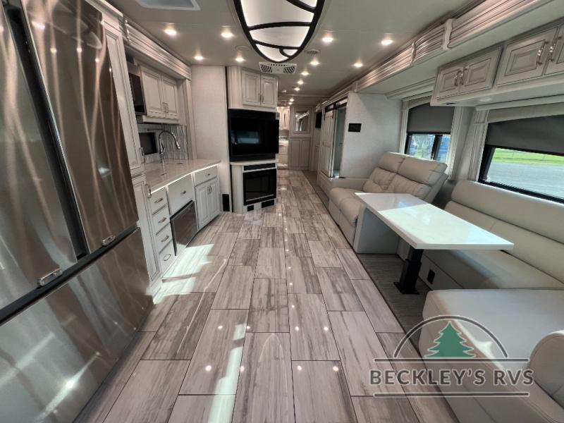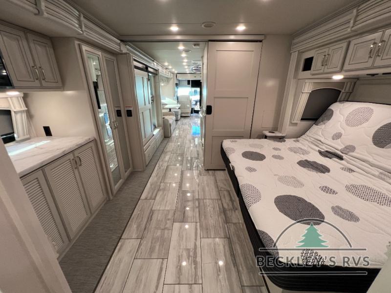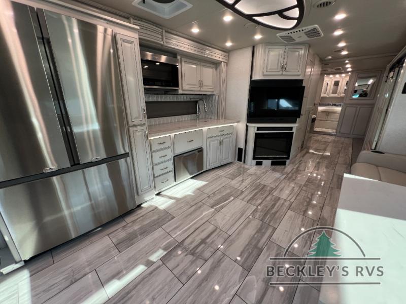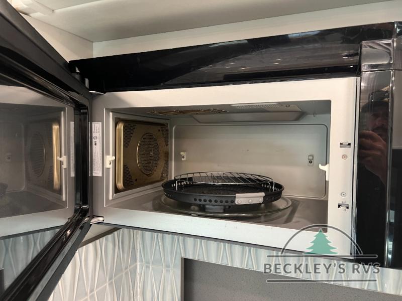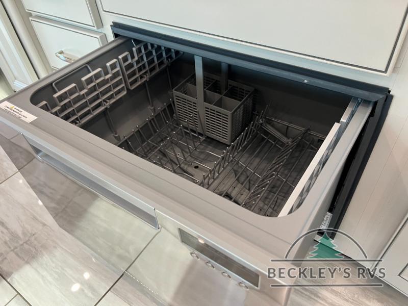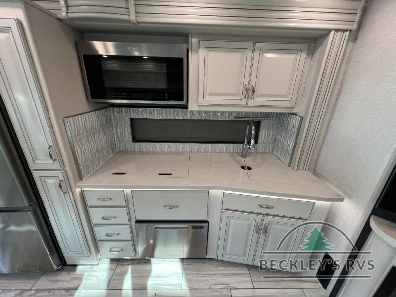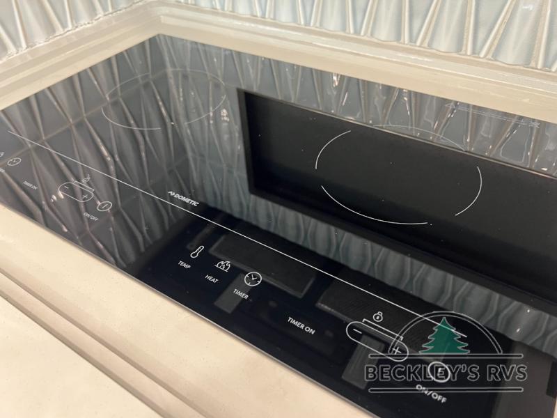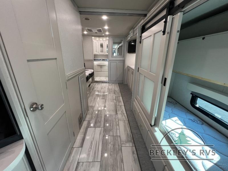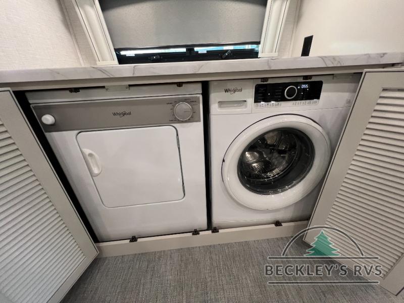 This coach offers a family or a couple that enjoys entertaining overnight guests plenty of sleeping space with the convertible bunk beds with barn doors. You can sleep even more guests when the optional Hide-A-Bed power drop-down overhead bunk is added, plus the sofa sleeper with pull-out twin bed and the booth dinette. The main living area also has an LED TV with a fireplace below and an LED TV over the cab to watch. The two full bathrooms shorten the waiting lines, and are convenient for all. The rear bathroom that is attached to the master bedroom even has a bedroom wardrobe. The bedroom provides a king bed slide for more floor space, and a side-by-side washer/dryer to keep everything clean while on the road, an LED TV to watch before bedtime, and more clothing storage. The kitchen offers stainless steel appliances, a convection microwave, an induction cooktop and so much more!