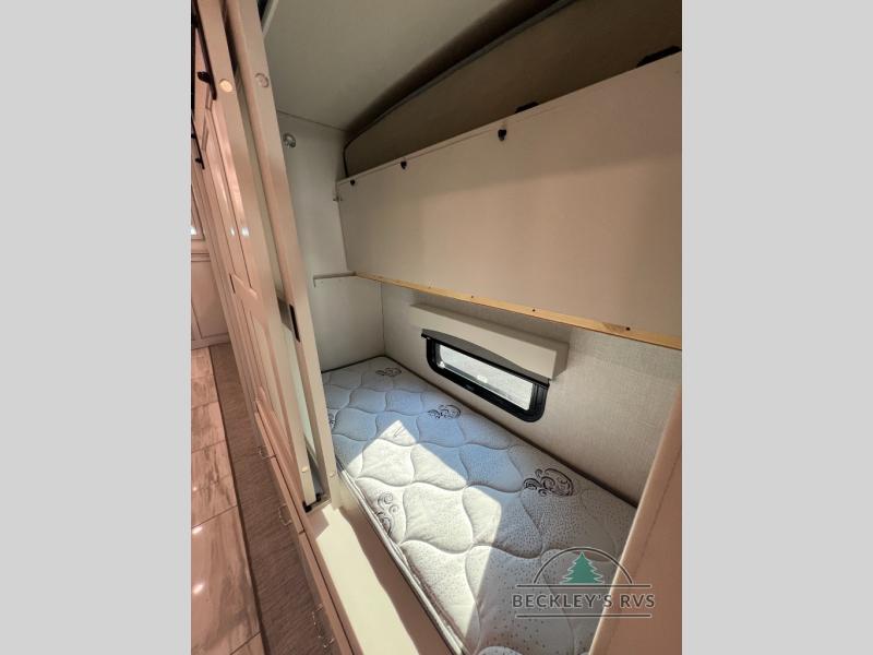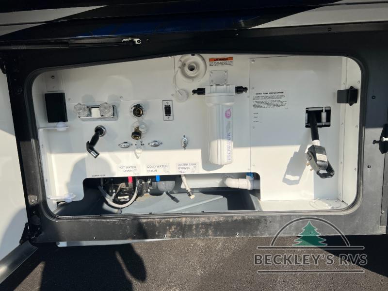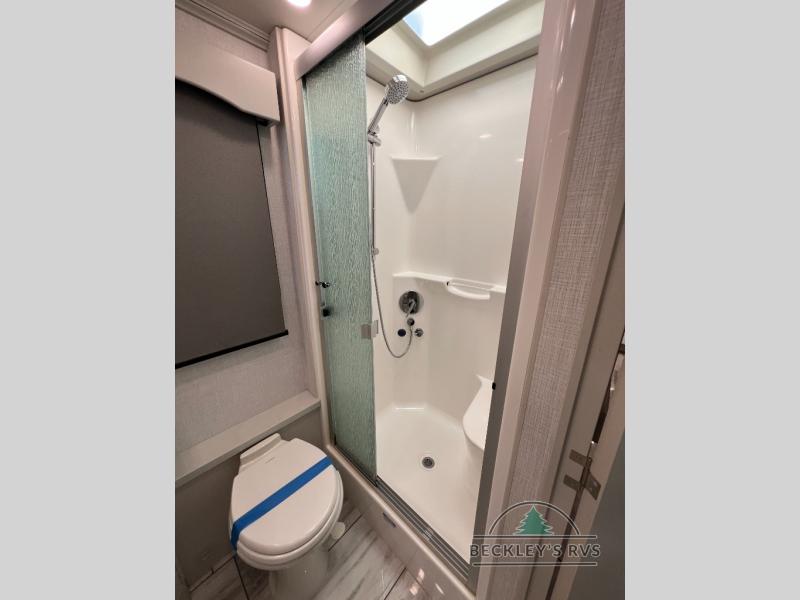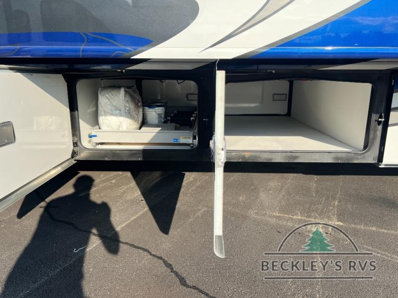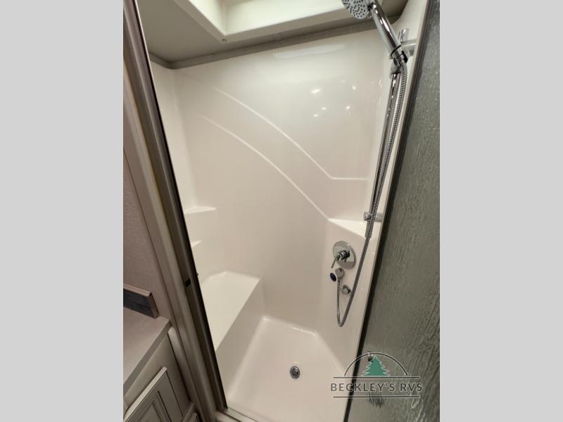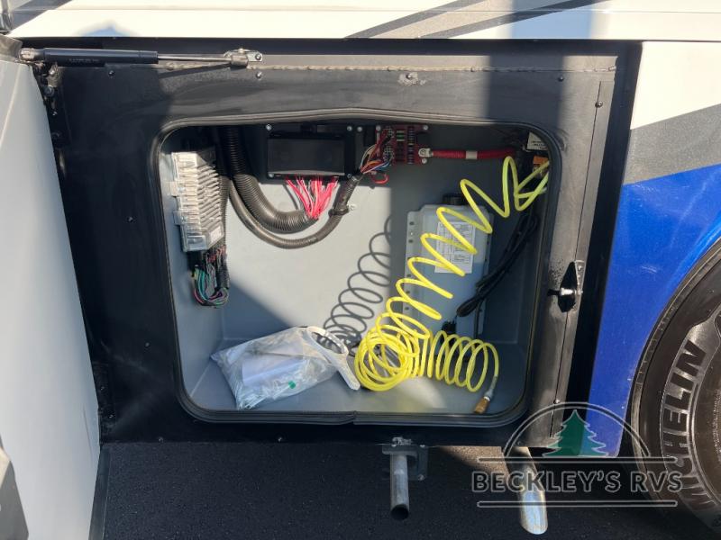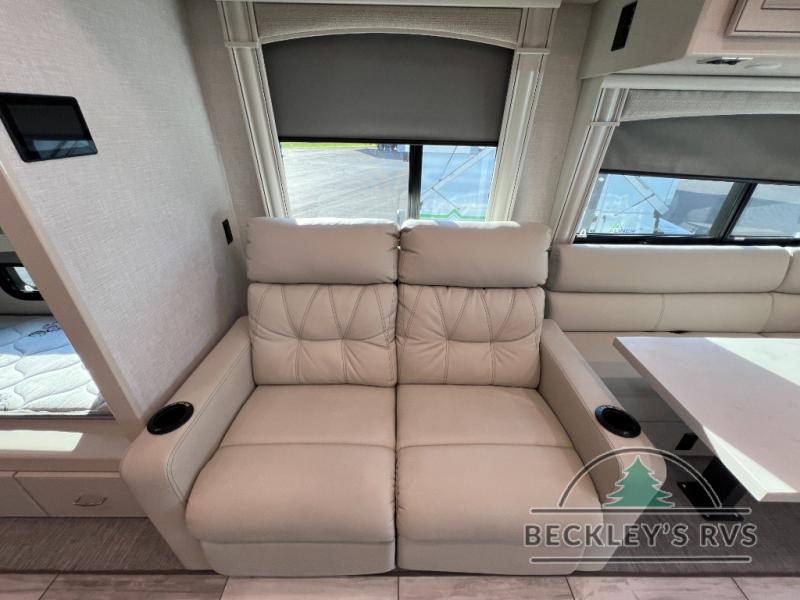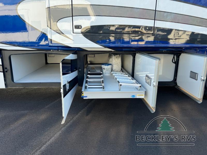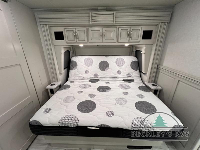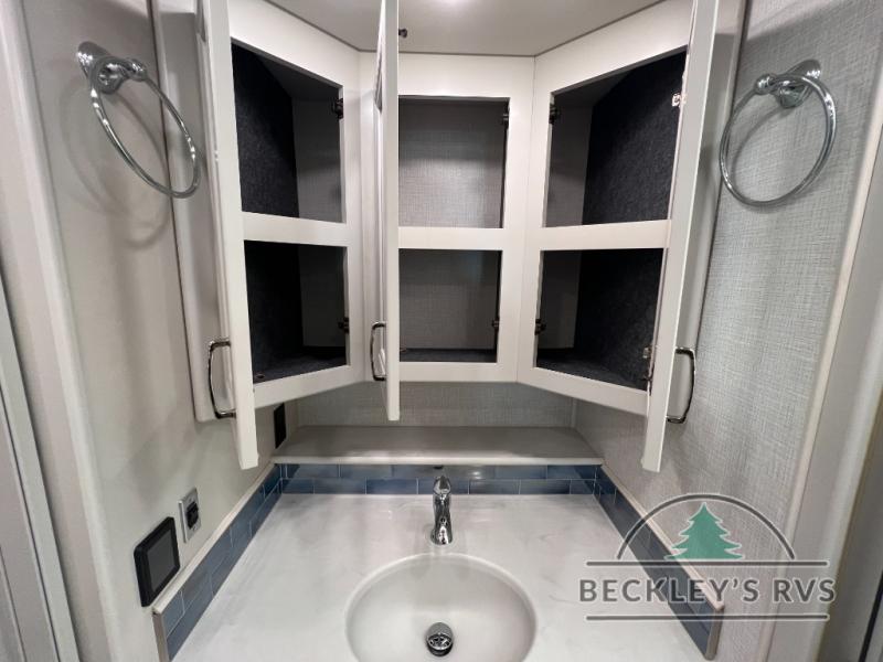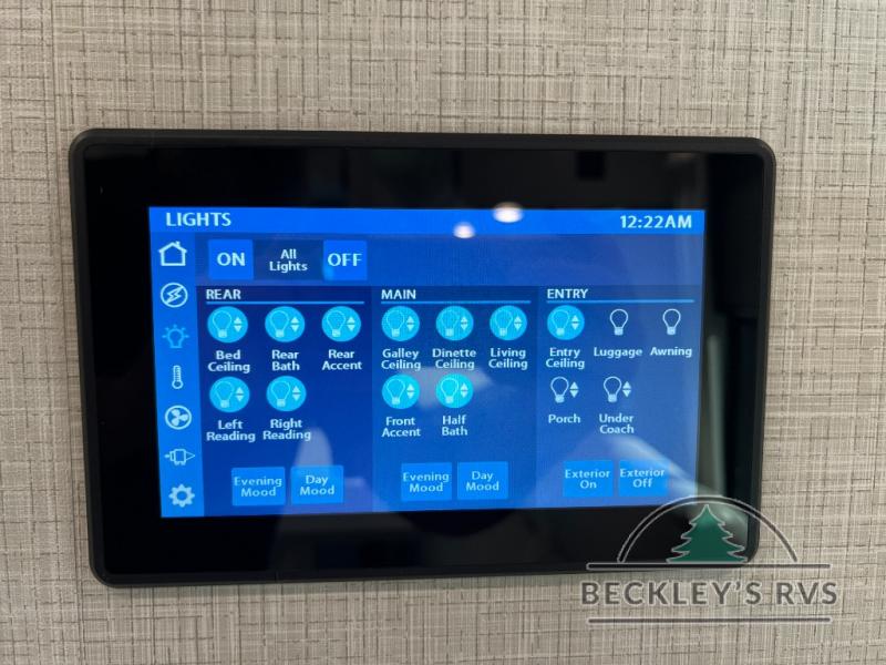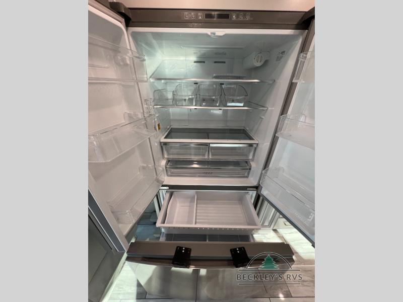 This coach offers a family or a couple that enjoys entertaining overnight guests plenty of sleeping space with the convertible bunk beds with barn doors. You can sleep even more guests when the optional Hide-A-Bed power drop-down overhead bunk is added, plus the sofa sleeper with pull-out twin bed and the booth dinette. The main living area also has an LED TV with a fireplace below and an LED TV over the cab to watch. The two full bathrooms shorten the waiting lines, and are convenient for all. The rear bathroom that is attached to the master bedroom even has a bedroom wardrobe. The bedroom provides a king bed slide for more floor space, and a side-by-side washer/dryer to keep everything clean while on the road, an LED TV to watch before bedtime, and more clothing storage. The kitchen offers stainless steel appliances, a convection microwave, an induction cooktop and so much more!