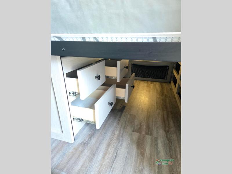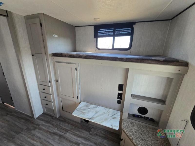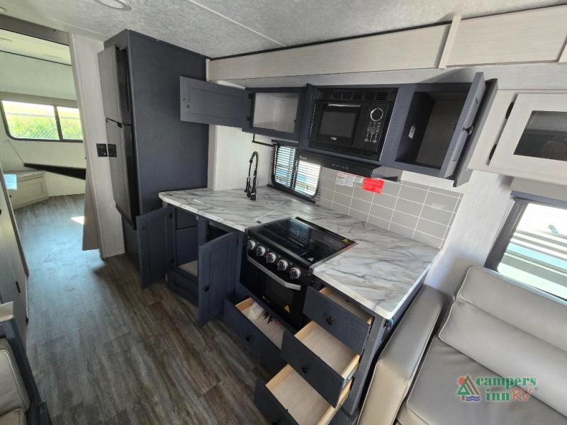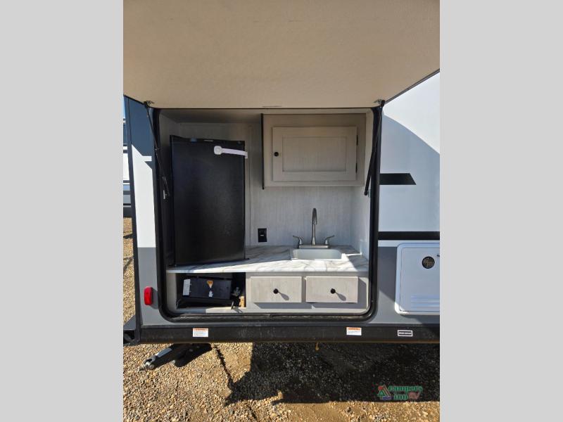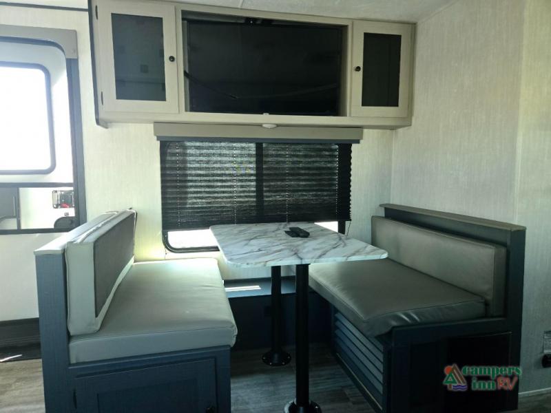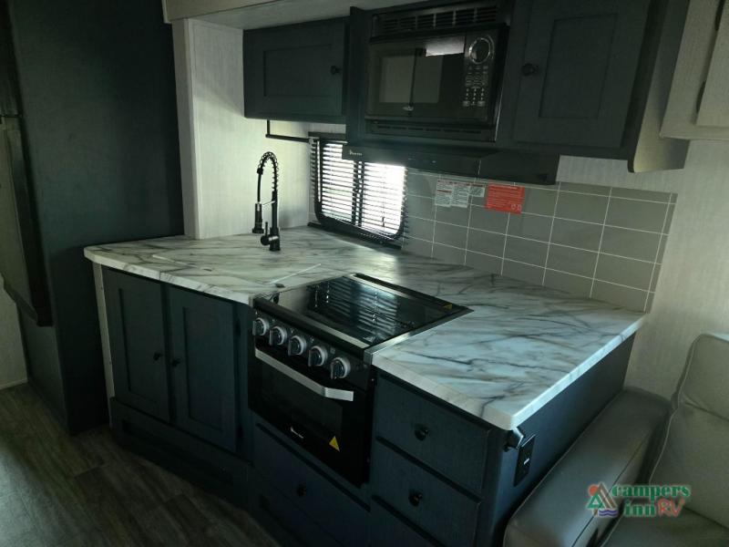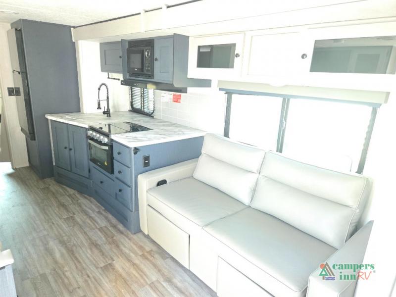 Double slides, a bunkhouse, plus a private bedroom and sleeping for nine make this model ready for anything! There is a private bunkhouse with a slide out futon and an overhead bunk, plus a second bunk for the kids to enjoy. Up front, a queen bed with super storage will provide two a comfortable night's rest in a private bedroom, and any other guests can sleep on the booth dinette and sofa in the main living area. The chef can cook indoors, or outdoors on the outside kitchen, and since there is an 18' power awning with LED lights, you can enjoy a bit of outdoor living space as well!