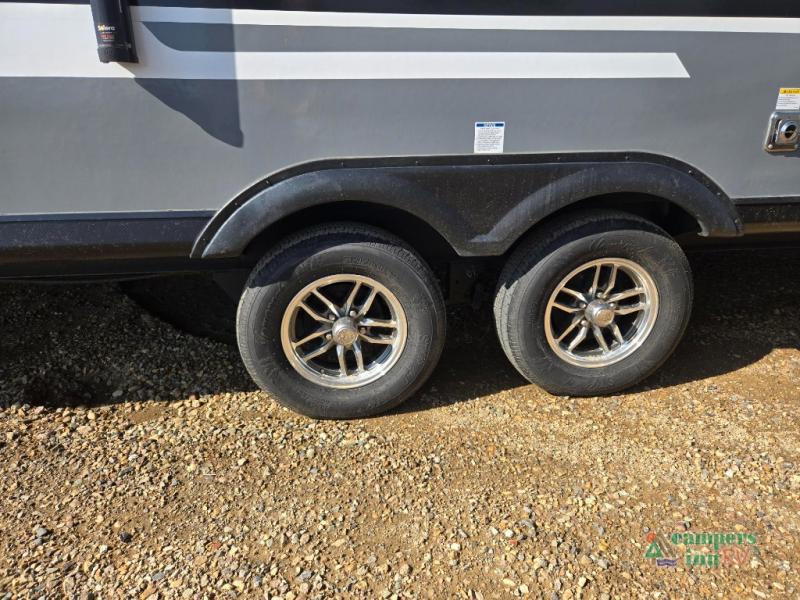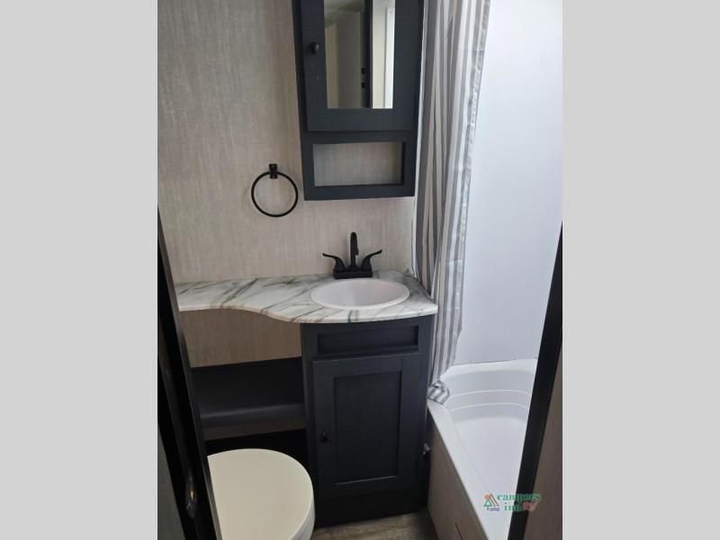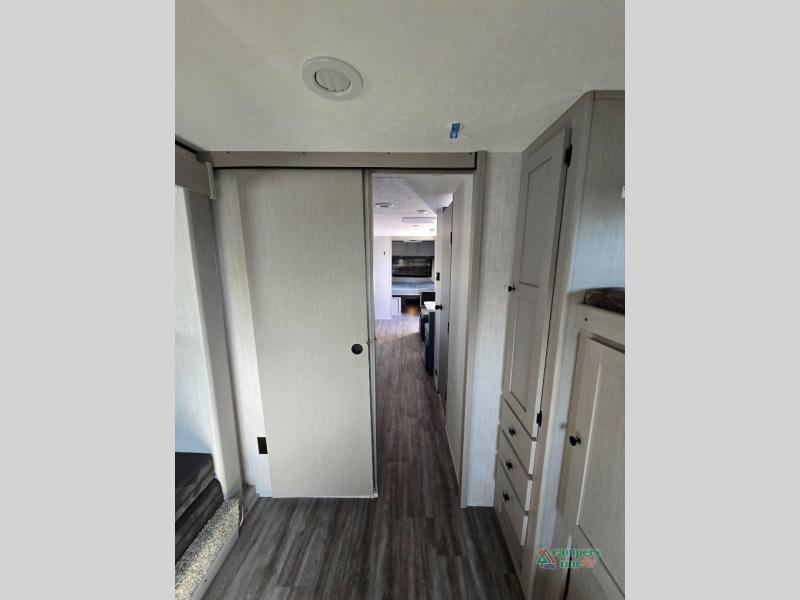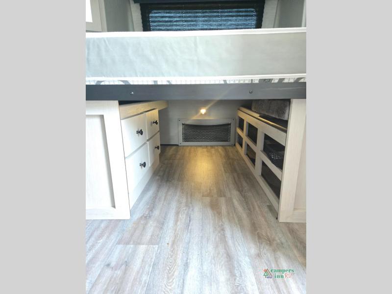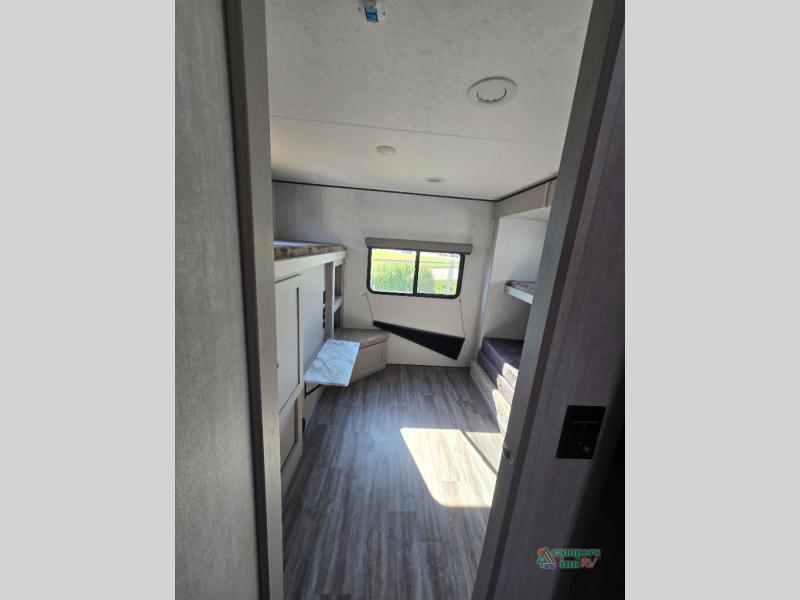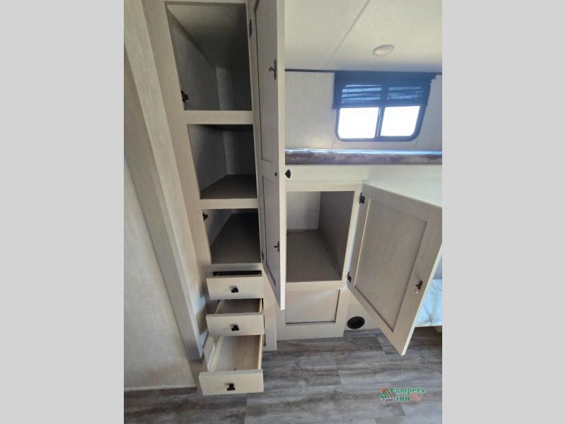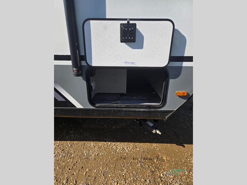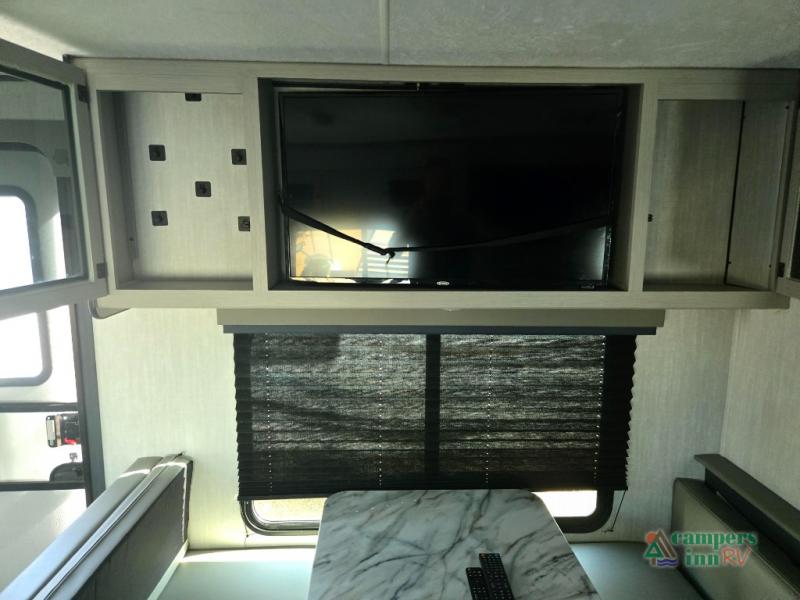 Double slides, a bunkhouse, plus a private bedroom and sleeping for nine make this model ready for anything! There is a private bunkhouse with a slide out futon and an overhead bunk, plus a second bunk for the kids to enjoy. Up front, a queen bed with super storage will provide two a comfortable night's rest in a private bedroom, and any other guests can sleep on the booth dinette and sofa in the main living area. The chef can cook indoors, or outdoors on the outside kitchen, and since there is an 18' power awning with LED lights, you can enjoy a bit of outdoor living space as well!